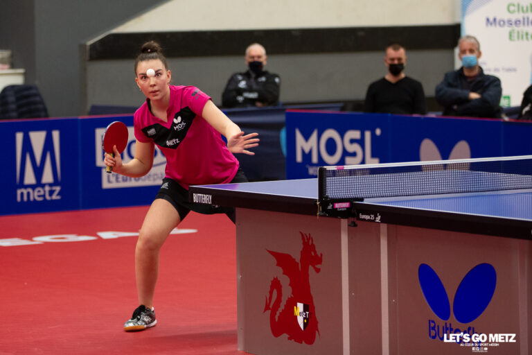 421 En demi-finale aller de PRO Dames, Metz TT est venu à bout de Saint-Quentin (3-1) au Complexe Saint-Symphorien. Les joueuses de Loïc Belguise prennent une bonne option avant le retour, mardi en Picardie. Les duels entre Metz et St-Quentin sont de véritables classiques du championnat de France. Cette demi-finale aller de PRO Dames l’a confirmé. Mariia Tailakova lançait parfaitement le train messin. Non sans lutter, en témoigne une quatrième manche équipe où elle a sauvé 3 balles de belle. La Russe s’imposait en 4 manches face à la Luxembourgeoise Sarah De Nutte (1-0).Adina Diaconu ne confirmait malheureusement pas le beau départ mosellan. Face à son ancienne coéquipière et mentor Daniela Monteiro-Dodean, la Roumaine s’inclinait en 5 manches. La Messine pourra nourrir des regrets puisqu’elle s’était procurée plusieurs balles de matchs contre sa compatriote (1-1). Tailakova, le sang glacé dans les veines En patronne, Wu Jiaduo replaçait néanmoins les siennes en tête. L’inépuisable quadragénaire, qui a récemment rempilé pour une saison supplémentaire à Metz TT, se rappelait au bon souvenir de ses grandes heures. Autrice d’une grande prestation, « Dudu » se défaisait en 5 sets de la défenseuse Polina Mikhailova (2-1).L’occasion était trop belle pour Mariia Tailakova, qui concluait la partie de manière froide. Pourtant mise en difficulté par Daniela Monteiro-Dodean, la Russe sauvait une balle de match et écartait son adversaire en 5 sets, avec beaucoup d’autorité. Une nouvelle performance de haute volée pour la joueuse de 21 ans, qui n’en finit plus d’étonner tout son monde (3-1).Metz TT part avec un ballotage très favorable avant le retour ce mardi à Saint-Quentin. Les Messines devront cependant rester vigilantes pour décrocher leur qualification en finale de PRO Dames. Metz TT – St-Quentin : 3-1 Tailakova – De Nutte : 9/11 11/5 11/7 15/13Diaconu – Monteiro-Dodean : 10/12 11/7 11/5 14/16 9/11Wu – Mikhailova : 3/11 11/8 11/8 9/11 11/8Tailakova – Monteiro-Dodean : 11/7 8/11 9/11 13/11 11/6 🏓 @MetzTT_Officiel se qualifie pour la finale du championnat de France PRO Dames !Déjà gagnantes 3-1 à l’aller, les Messines l’ont emporté 3-0 au retour à Saint-Quentin 👏👏👏 pic.twitter.com/vbfiMMZHlR— Let's Go Меtz (@letsgomtz) April 12, 2022 Crédit photo : Julien Buret/LGM