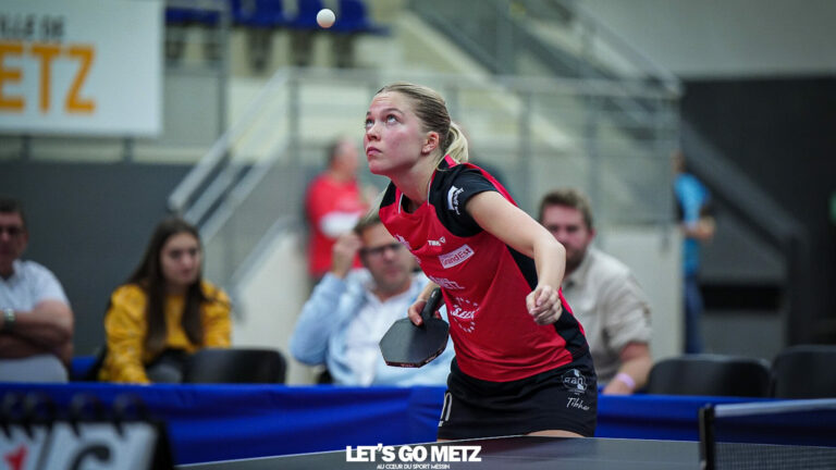 572 Metz TT débute idéalement la défense de son titre en PRO A Dames. Les joueuses de Loïc Belguise se sont imposées 3-0 contre Quimper, en ouverture de la saison. Après une saison 2022-2023 couronnée de succès, Metz TT repart pour une danse en Pro A Dames. L’an dernier, le club avait réussi la prouesse de conserver son titre de champion de France et de se hisser, pour la première fois, en finale de Ligue des Champions. Pour ce nouvel exercice, Metz Tennis de Table n’a pas procédé à de grands changements dans son effectif. Adina Diaconu, Pauline Chasselin et Mariia Tailakova sont toujours messines. La Suédoise Christina Källberg (23 ans) a toutefois rejoint l’équipe de Loïc Belguise, en lieu et place de Wu Jiaduo, qui a quitté le club cet été. Une victoire pour commencer Metz TT lançait donc sa saison 2023-2024 de PRO A Dames ce jeudi, avec la réception du promu Quimper. Sans Adina Diaconu, laissée au repos, les Messines ont facilement disposé de leurs homologues bretonnes. Mariia Tailakova ouvrait le bal avec une victoire en quatre sets contre Xue Lie (11/5 8/11 11/3 11/8). La Russe était imitée quelques instants plus tard par Christina Källberg, la toute dernière recrue du club. Victoire en quatre manches (11/6 8/11 11/7 11/9), également, pour la Suédoise face à l’ancienne Messine Carole Grundisch. Enfin, Pauline Chasselin a conclu le travail en venant à bout d’Hanna Haponova (11/4 11/4 6/11 11/0). Un début de saison rondement mené. Metz TT 3-0 Quimper Tailakova – Li : 11/5 8/11 11/3 11/8Källberg – Grundisch : 11/6 8/11 11/7 11/9Chasselin – Haponova : 11/4 11/4 6/11 11/0