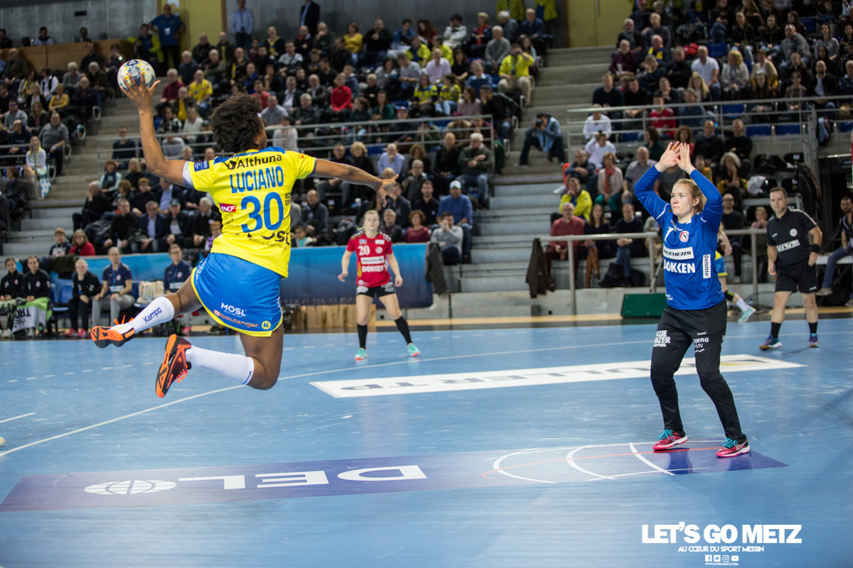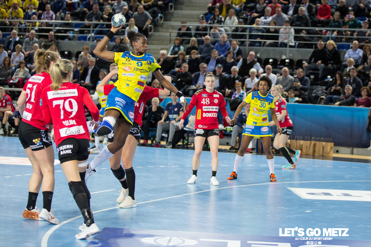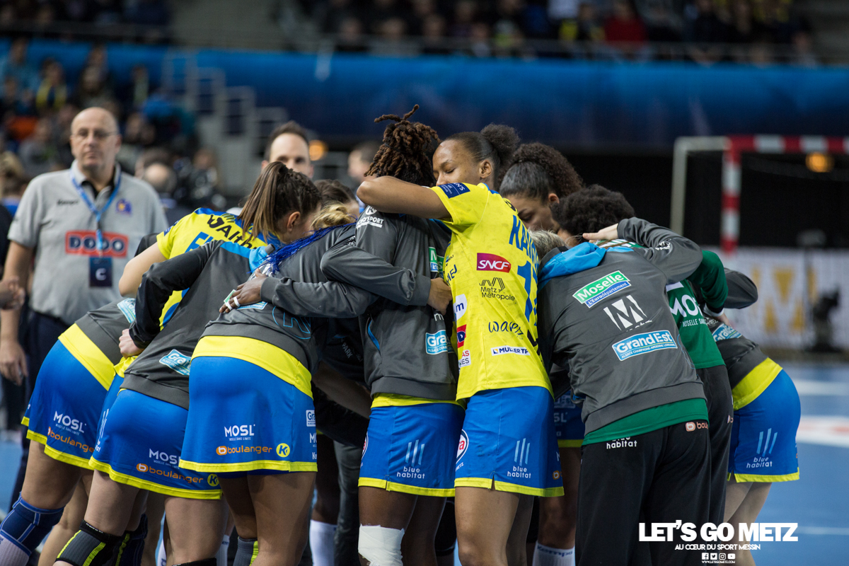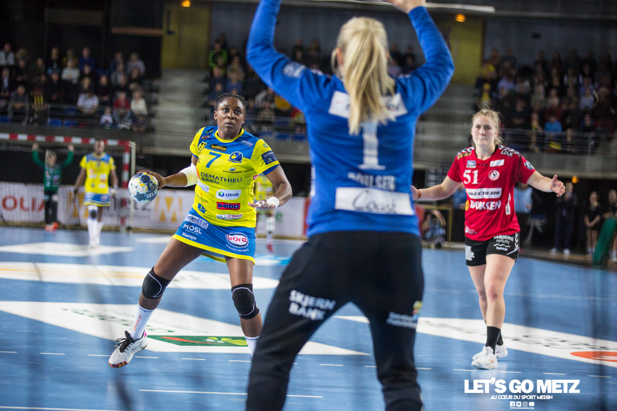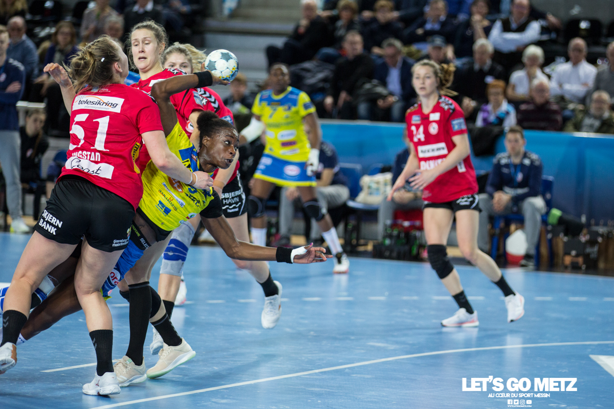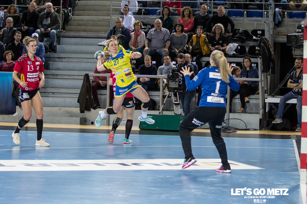 629 De retour aux Arènes pour leur troisième match du tour principal de la ligue des champions, les dragonnes recevaient les danoises de Team Esbjerg. L’occasion était offerte aux messines de redonner le sourire à leurs supporters et asseoir leur première place dans ce groupe 1. Pour clore une semaine compliquée, qui a vu les Dragonnes essuyer deux défaites loin de leurs terres et de leurs habitudes, nous sommes de retour aux Arènes de Metz pour y assister à un match capital de Ligue des Champions. En laissant des points à Bucarest il y a sept jours, les Messines ont permis à leurs poursuivants de recoller au classement au point de mettre en péril cette première place vaillamment conquise. Du côté des visiteurs, la Team Esbjerg se présente en outsider de luxe aux dents longues. Les Danoises sont en réussite cette saison et entendent bien repartir de France avec de précieux points. 1ère période : D’entrée, ce sont les Danoises qui se mettent en confiance avec deux buts en autant d’occasions. Nous assistons à un début de match très poussif des messines qui subissent rapidement les assauts des Danoises, bien regroupées en défense et cruellement efficaces et en attaque. Assez tôt nous assistons à des schémas offensifs inhabituels côté messin, avec notamment une Martine Smeets qui n’hésite pas à quitter son aile pour venir s’installer plus haut et offrir une deuxième solution dos au but, à la manière d’un pivot. Cela ne paie que peu, les actions réussies manquent et Emmanuel Mayonnade est forcé de poser son premier temps mort après seulement 8 minutes de jeu. Malgré ces efforts, au bout de 10 minutes de jeu les jaunes et bleues accusent déjà un handicap de 4 buts (3-7), bien difficile à résorber. Conformément aux attentes placées sur elle, Estavana Polman se montre irrésistible avec 5 buts en seulement 15 minutes.Heureusement, poussées par leur public et galvanisées par quelques arrêts de grande classe de Tea Pijevic, entrée pour suppléer Ivana Kapitanovic en manque de réussite, les filles du Metz Handball recollent au score par Ailly Luciano et ont même l’occasion de prendre l’avantage pour la première fois du match à 5 minutes de la pause. Mais Team Esbjerg reste redoutable et au gré d’un temps mort opportun, les danoises rendent les coups dans les dernières minutes et c’est sur un score de parité (15 – 15) que les deux équipes rentrent aux vestiaires. Le mal qui semble habiter les messines depuis quelques semaines est toujours palpable : beaucoup de maladresses dans les tirs, un manque flagrant de créativité en attaque, la machine paraît à nouveau enrayée. 2ème période On prend les mêmes et on recommence. De retour sur le gerflor, les jaunes et bleues se font de nouveau surprendre par l’engagement et la puissance Danoise. Incapables de prendre l’ascendant sur les visiteuses, les dragonnes ne peuvent faire mieux que courir à nouveau après le score. Il faudra attendre le quart d’heure et une supériorité numérique pour voir sonner la révolte. Laura Flippes par deux fois va faire se lever les arènes puis Louise Burgaard d’un tir surpuissant dont elle a le secret. En grande difficulté depuis le début de la rencontre, Ivana Kapitanovic va de nouveau céder sa place à Tea Pijevic. Mais rien y fait, et les Danoises enchaînent les combinaisons millimétrées. Elles semblent jouer simplement et efficacement, tandis que du côté de Metz on se complique bien souvent la tâche. On assiste à des modifications de stratégie défensive, avec nottament l’utilisation de Luciano et Flippes simultanément, pour stopper les offensives avec un succès mitigé. Emmanuel Mayonnade utilise un nouveau temps mort pour dynamiser ses troupes et les 4122 spectateurs continuent de pousser les dragonnes. Cela paie cette fois puisque par l’intermédiaire de Laura Flippes et Grâce Zaadi l’écart se réduit à nouveau. S’en suit une cruelle alternance entre égalité, occasions de prendre la main et déficit de un voir deux buts. En cette deuxième période Sonja Frey fait beaucoup de mal grâce à son efficacité face au but. Et alors que les Messines sont menées d’un but à 15 secondes de la fin de la rencontre c’est Orlane Kanor qui va libérer l’assistance du poids qui l’accable en envoyant le ballon le plus précieux du match au fond des filets adverses. Score final 31 – 31 Le roseau plie mais ne rompt pas. Toujours premières de leur groupe à la différence de buts avec 9 points au compteur aux côtés de Rostov-Don et de Team Esbjerg, leur adversaire du jour, les Messines ont encore livré une partie décevante à bien des égards, tout en trouvant la force mentale suffisante pour ne pas lâcher et même revenir à égalité dans les dernières secondes. Une égalisation vécue comme une victoire par le public et par le staff. Et pourtant, le résultat n’est pas celui escompté, les dragonnes se sont mises en difficulté seules en multipliant les maladresses, les tirs manqués et les fautes défensives. Alors oui, Metz est toujours invaincu à domicile en Ligue des Champions depuis le 28 janvier 2017 (22 matchs), oui Metz est toujours plus que jamais dans la course pour un 1/4 de finale avec ce match nul, mais il est clair que le mal qui ronge ce collectif depuis quelques temps maintenant, est encore bien présent. Un collectif plombé par les blessures mais qui malgré tout arrive à limiter les dégâts et montrer de la force de caractère sur certaines séquences de jeu, à l’image de Laura Flippes et Orlane Kanor qui ont su mettre les buts qu’il fallait au bon moment. Sera-ce suffisant sur le long terme ? Rien n’est moins sûr, et il serait de bon ton pour les dragonnes de redevenir cette machine à gagner qu’elles ont su être lors des derniers exercices, si elles veulent de nouveau accrocher le final four et rêver plus grand. La dragonne du match Sans véritablement bril
