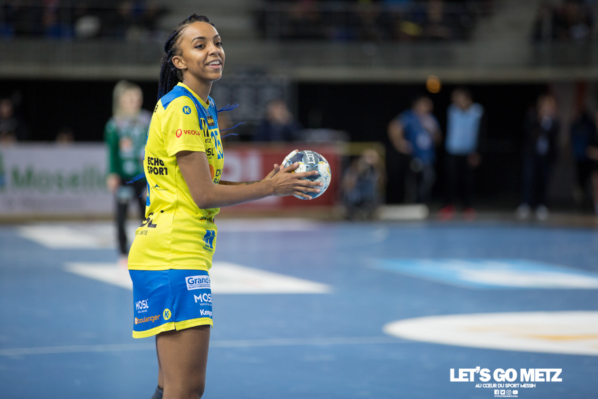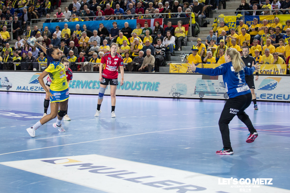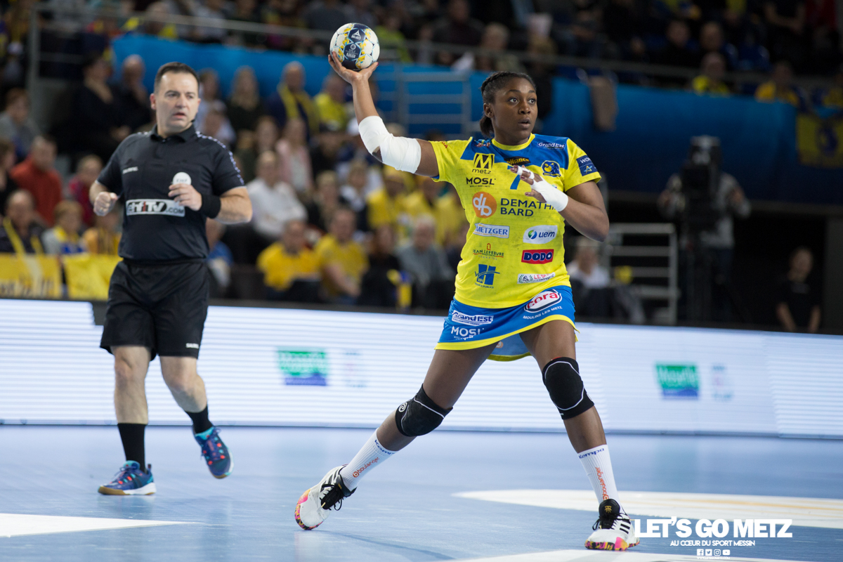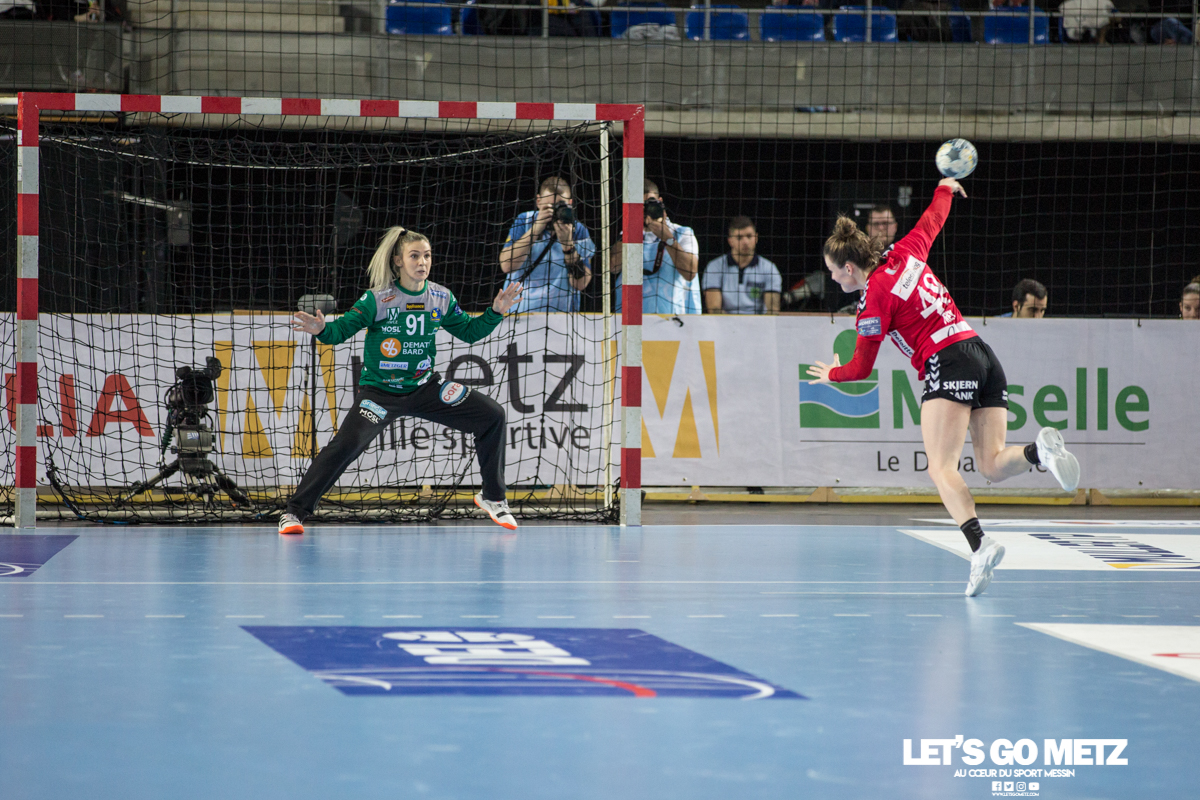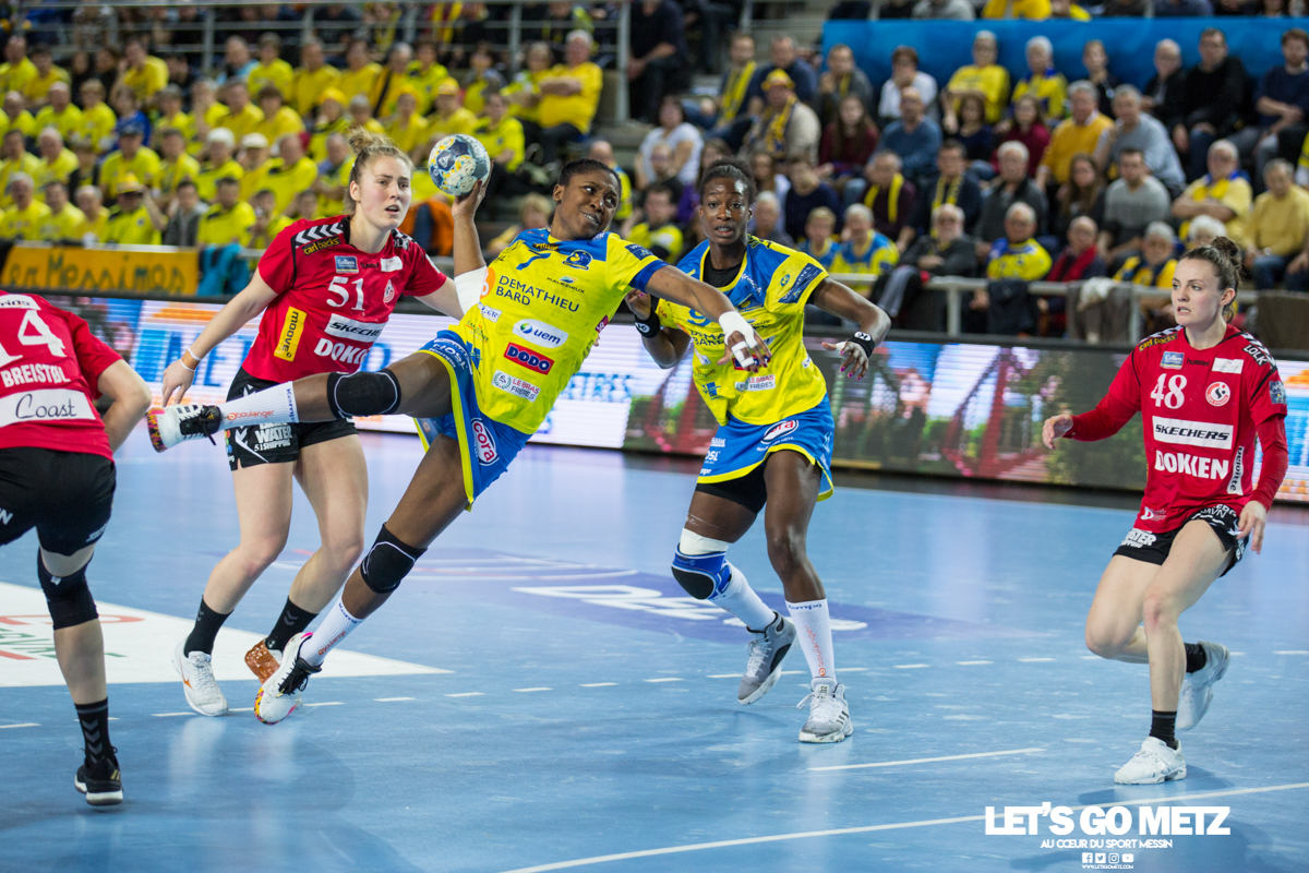 629 De retour aux Arènes pour leur troisième match du tour principal de la ligue des champions, les dragonnes recevaient les danoises de Team Esbjerg. L’occasion était offerte aux messines de redonner le sourire à leurs supporters et asseoir leur première place dans ce groupe 1. Pour clore une semaine compliquée, qui a vu les Dragonnes essuyer deux défaites loin de leurs terres et de leurs habitudes, nous sommes de retour aux Arènes de Metz pour y assister à un match capital de Ligue des Champions. En laissant des points à Bucarest il y a sept jours, les Messines ont permis à leurs poursuivants de recoller au classement au point de mettre en péril cette première place vaillamment conquise. Du côté des visiteurs, la Team Esbjerg se présente en outsider de luxe aux dents longues. Les Danoises sont en réussite cette saison et entendent bien repartir de France avec de précieux points. 1ère période : D’entrée, ce sont les Danoises qui se mettent en confiance avec deux buts en autant d’occasions. Nous assistons à un début de match très poussif des messines qui subissent rapidement les assauts des Danoises, bien regroupées en défense et cruellement efficaces et en attaque. Assez tôt nous assistons à des schémas offensifs inhabituels côté messin, avec notamment une Martine Smeets qui n’hésite pas à quitter son aile pour venir s’installer plus haut et offrir une deuxième solution dos au but, à la manière d’un pivot. Cela ne paie que peu, les actions réussies manquent et Emmanuel Mayonnade est forcé de poser son premier temps mort après seulement 8 minutes de jeu. Malgré ces efforts, au bout de 10 minutes de jeu les jaunes et bleues accusent déjà un handicap de 4 buts (3-7), bien difficile à résorber. Conformément aux attentes placées sur elle, Estavana Polman se montre irrésistible avec 5 buts en seulement 15 minutes.Heureusement, poussées par leur public et galvanisées par quelques arrêts de grande classe de Tea Pijevic, entrée pour suppléer Ivana Kapitanovic en manque de réussite, les filles du Metz Handball recollent au score par Ailly Luciano et ont même l’occasion de prendre l’avantage pour la première fois du match à 5 minutes de la pause. Mais Team Esbjerg reste redoutable et au gré d’un temps mort opportun, les danoises rendent les coups dans les dernières minutes et c’est sur un score de parité (15 – 15) que les deux équipes rentrent aux vestiaires. Le mal qui semble habiter les messines depuis quelques semaines est toujours palpable : beaucoup de maladresses dans les tirs, un manque flagrant de créativité en attaque, la machine paraît à nouveau enrayée. 2ème période On prend les mêmes et on recommence. De retour sur le gerflor, les jaunes et bleues se font de nouveau surprendre par l’engagement et la puissance Danoise. Incapables de prendre l’ascendant sur les visiteuses, les dragonnes ne peuvent faire mieux que courir à nouveau après le score. Il faudra attendre le quart d’heure et une supériorité numérique pour voir sonner la révolte. Laura Flippes par deux fois va faire se lever les arènes puis Louise Burgaard d’un tir surpuissant dont elle a le secret. En grande difficulté depuis le début de la rencontre, Ivana Kapitanovic va de nouveau céder sa place à Tea Pijevic. Mais rien y fait, et les Danoises enchaînent les combinaisons millimétrées. Elles semblent jouer simplement et efficacement, tandis que du côté de Metz on se complique bien souvent la tâche. On assiste à des modifications de stratégie défensive, avec nottament l’utilisation de Luciano et Flippes simultanément, pour stopper les offensives avec un succès mitigé. Emmanuel Mayonnade utilise un nouveau temps mort pour dynamiser ses troupes et les 4122 spectateurs continuent de pousser les dragonnes. Cela paie cette fois puisque par l’intermédiaire de Laura Flippes et Grâce Zaadi l’écart se réduit à nouveau. S’en suit une cruelle alternance entre égalité, occasions de prendre la main et déficit de un voir deux buts. En cette deuxième période Sonja Frey fait beaucoup de mal grâce à son efficacité face au but. Et alors que les Messines sont menées d’un but à 15 secondes de la fin de la rencontre c’est Orlane Kanor qui va libérer l’assistance du poids qui l’accable en envoyant le ballon le plus précieux du match au fond des filets adverses. Score final 31 – 31 Le roseau plie mais ne rompt pas. Toujours premières de leur groupe à la différence de buts avec 9 points au compteur aux côtés de Rostov-Don et de Team Esbjerg, leur adversaire du jour, les Messines ont encore livré une partie décevante à bien des égards, tout en trouvant la force mentale suffisante pour ne pas lâcher et même revenir à égalité dans les dernières secondes. Une égalisation vécue comme une victoire par le public et par le staff. Et pourtant, le résultat n’est pas celui escompté, les dragonnes se sont mises en difficulté seules en multipliant les maladresses, les tirs manqués et les fautes défensives. Alors oui, Metz est toujours invaincu à domicile en Ligue des Champions depuis le 28 janvier 2017 (22 matchs), oui Metz est toujours plus que jamais dans la course pour un 1/4 de finale avec ce match nul, mais il est clair que le mal qui ronge ce collectif depuis quelques temps maintenant, est encore bien présent. Un collectif plombé par les blessures mais qui malgré tout arrive à limiter les dégâts et montrer de la force de caractère sur certaines séquences de jeu, à l’image de Laura Flippes et Orlane Kanor qui ont su mettre les buts qu’il fallait au bon moment. Sera-ce suffisant sur le long terme ? Rien n’est moins sûr, et il serait de bon ton pour les dragonnes de redevenir cette machine à gagner qu’elles ont su être lors des derniers exercices, si elles veulent de nouveau accrocher le final four et rêver plus grand. La dragonne du match Sans véritablement bril