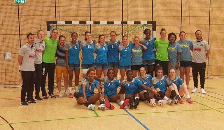 324 Après avoir repris l’entrainement il y a quelques semaines, les joueuses du Metz Handball commençaient à trépigner d’impatience à l’idée de retrouver un semblant de compétition face à des joueuses de leur calibre. Le tournoi de Wittlich tombait donc à point nommé ce week end et a permis aux Dragonnes de défendre le sacre (aussi amical soit il) obtenu l’an passé sur les terrains Allemands. Retour sur ce premier tournoi de préparation… Le premier match a eu lieu Samedi à 15h30 face aux TuS Metzingen. Pour un retour aux affaires, les messines n’auront pas beaucoup tremblé, en s’imposant largement 31 à 18 tout en faisant largement tourner l’effectif. Dans le rôle de meilleure buteuse de la rencontre, Marie Helene Sajka avec 8 réalisations, suivie de près par Julie LeBevec avec 6 buts et Laura Flippes qui en a marqué 4. La composition du match: Lauga Glauser, Meline Nocandy, Julie LeBevec, Lea Ballureau, Orlane Kanor, Grace Zaadi, Laura Flippes, Astride N’Gouan, Manon Houette, Xenia Smits, Ivana Kapitanovic, Ilona di Rocco, Louise Burgaard, Marie Helene Sajka. Le second match a eu lieu Samedi à 18h30 face au SG BBM Bietigheim Après un démarrage canon, 3-0 le match s’est vite resserré et à la mi temps les deux équipes restent au coude à coude 15 à 14. Emmanuel Mayonnade a continué de faire tourner l’équipe afin de donner du temps de jeu à chacune de ses joueuses et favoriser les automatismes dans toutes les configurations. Les jaunes et bleues se sont finalement imposées 31 à 27 pour clore de la meilleure des façons cette première journée. Du côté des buteuses, c’est cette fois Orlane Kanor qui mène l’équipe avec 6 réalisations, suivie de Marie Hélène Sajka et ses 5 buts. La demi finale a eu lieu Dimanche à 13h15 face au CSM Bucharest La première mi temps était très accrochée et les deux formations n’ont pas cessé de revenir à égalité tour à tour mais Laura Flippes s’est enflammée en fin de période, permettant à son équipe de rejoindre les vestiaires avec une avance de deux buts, 18 à 16. En seconde mi temps l’écart est resté stable et ce n’est que dans les dernières minutes que le match s’est réellement joué: une Laura Glauser infranchissable a permis aux Messines de préserver une avance d’un but jusqu’au dernier coup de sifflet: 28 à 27, direction la finale ! La meilleure buteuse est à nouveau Marie Hélène Sajka avec 8 réalisations. La finale a eu lieu Dimanche à 17h45 face à SG BBM Bietigheim Dès les premières minutes, les Messines prennent l’avantage et écrasent la volonté adverse. Pourtant la fin de mi temps est difficile et les joueuses de Emmanuel Mayonnade permettent à Bietigheim de rester dans la course. 14 à 11 à la pause. Alors que le coup de mou s’étire jusqu’au début de seconde période, avec des difficultés à scorer, c’est Manon Houette qui remet l’équipe dans le sens de la marche en permettant de conserver deux buts d’avance. Cependant, c’est bien un effort collectif qui permet aux Dragonnes de conserver leur avance dans une deuxième mi temps disputée. En fin de match, les allemandes ne tiennent plus et l’écart repart en faveur des Messines. 28 à 22 au coup de sifflet final et les Messines conservent leur titre à Wittlich. Victoire des Dragonnes dans ce premier tournoi de préparation ! Il y aura eu beaucoup de satisfactions sportives lors de ce week-end, aucune blessure et une meilleure buteuse en la personne de Marie Hélène Sajka. Mais la reprise des matchs aura également laissé transparaître certaines failles et quelques manques d’automatismes qu’il faudra encore corriger lors des prochains tournois afin d’espérer remplir tous les objectifs de la saison à venir. La machine est en route ! Crédit photo: Instagram Metz Handball