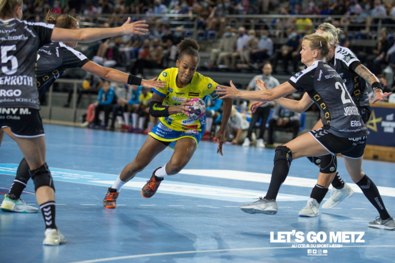 696 Pour sa première à domicile en Ligue des Champions, Metz Handball s’est largement imposé face à Bietigheim 36 à 27 et reste toujours invaincu à domicile pour la 24ème fois consécutive. Ce dimanche, les Messines recevaient le SG BBM Bietigheim. Renforcées à l’intersaison avec les arrivées de Xenia Smits, Trine Ostegaard et Stine Jorgensen, les Allemandes avaient la volonté d’ouvrir leur compteur après leur lourde défaite face aux Danoises de Esbjerg. C’était sans compter sans un Metz piqué à vif par son revers du côté de Bucarest… Après deux sorties, Metz Handball retrouvait ses Arènes pour la 2ème journée de Ligue des Champions. Si Astride N’Gouan était de nouveau présente dans le groupe, les Messines devaient composer sans Marie-Hélène Sajka (blessée), en tribune. C’était également l’occasion pour le public messin de revoir Xenia Smits, une des joueuses qui a fait les plus belles années du club mosellan. Les Allemandes ont engagé le match mais très vite Metz Handball a mis le physique nécessaire en défense pour permettre à sa gardienne (Hatadou Sako) de sécuriser ses buts et envoyer les Messines à la contre-attaque. Après un coup de génie de Louise Burgaard vers Olga Perederiy dans un interstice, la pivot ukrainienne a poussé les coéquipières de Xenia Smits à la faute défensive. Et même si Stine Jorgensen a répondu au jet de 7m conclu par la jeune Tjasa Stanko, les Dragonnes étaient techniquement plus affutées et solidaires pour prendre l’ascendant et ne laisser aucun espoir à leurs adversaires. A tel point que les 10 premières minutes de la confrontation ne se jouèrent que d’un seul coté du terrain et tournèrent vite à la correction (9-1, 10′). Bietigheim ne parvenait pas à enchainer les passes sans que Metz n’intercepte les ballons par sa lecture rigoureuse du moindre enclenchement adverse. Et lorsque les attaques allemandes dépassaient la ligne de défense, les Lorraines pouvaient compter sur Hatadou Sako, imperturbable sur sa ligne, aux 6m. Devant, le quatuor Perederiy-Burgaard-Stanko-Kanor n’avait de cesse de martyriser Emily Stang Sando, bien esseulée devant la virtuosité de l’offensive messine. A la mi-temps, les Messines repartaient avec une belle avance de 10 unités et un score réalisé par la moitié des joueuses de champs, prouvant ainsi, l’hétérogénéité et la solidarité sans faille de ce groupe (18-8, 30′). S’étant passablement assurée un matelas confortable, la formation mosellane a préservé son avance en ne dépassant guère moins de 5 buts d’écart. Malgré tout, les joueuses de Markus Gaugisch avaient la volonté de ne pas quitter cette salle avec la piètre performance proposée en ce début d’après midi. Durant les premières minutes de la seconde période, la dynamique semblait changer de camp avec Julia Maidhof à la mène. Comme la semaine précédente face à Team Esbjerg, la jeune arrière droite de 22 ans s’est montrée très vindicative et roublarde. Cette dangerosité notable offrait la possibilité à Bietigheim de réduire l’écart et de préserver un semblant de résistance. Quant aux Messines, moins concentrées, moins inspirées, elles se heurtaient à une optimisation des positionnements défensifs plus compacte, provoquant des approximations. Ce réveil tardif n’est pourtant jamais parvenu à tromper complètement les Jaune et Bleu qui retrouvaient leurs combinaisons fluides pour finir d’assurer un spectacle décidément intarissable. Metz Handball.Ivana Kapitanovic (0 parade sur 4 tirs), Hatadou Sako (12/35). Daphné Gautschi (0 but sur 1 tir), Camila Micijevic (0/1), Astride N’Gouan (0/1), Méline Nocandy (1/3), Debbie Bont (0/2), Tjasa Stanko (5/7), Orlane Kanor (5/9), Louise Burgaard (5/6), Laura Kanor (3/3), Sarah Bouktit (1/1), Maud-Eva Copy (2/3), Olga Perederiy (12/13), Melvine Deba (2/2). SG BBM Bietigheim.Emily Stang Sando (6 parades sur 42 tirs), Valentyna Salamakha.Amelie Berger (2 buts sur 2 tirs), Antje Lauenroth (0/2), Lisa Schulze (2/5), Kim Naidzinavicius (5/9), Nele Reimer (0/1), Xenia Smits (2/3), Trine Jensen Ostagaard (1/2), Julia Maidhof (8/10), Stine Jorgensen (7/15), Kim Braun. Crédit photo : Matthieu Henkinet
