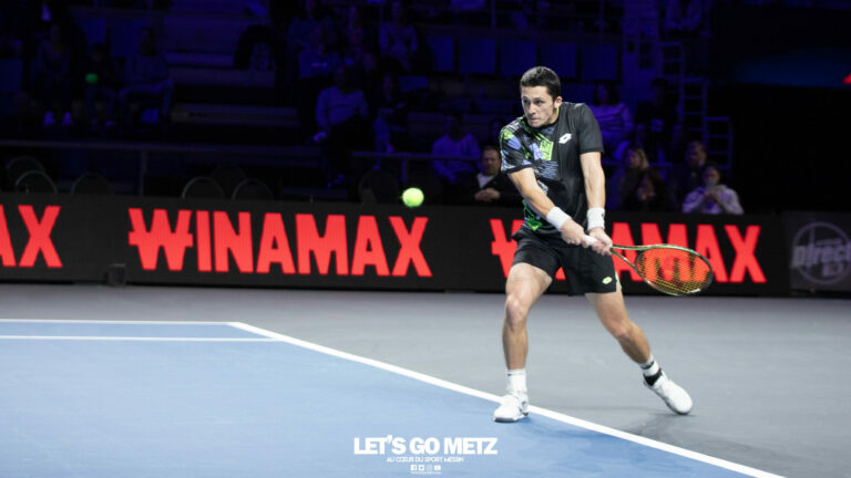 694 Ce dimanche marquait la fin des matchs dans le tableau des qualifications, et le début du tournoi dans le tableau principal du Moselle Open 2023. Bon nombre de français étaient présents sur les courts, dont le Mosellan Harold Mayot. Il y avait du beau monde sur les courts de Metz aujourd’hui. La journée a débuté tôt, dès 10h, avec la fin des matchs dans le tableau des qualifications. Quatre joueurs ont validé leur place pour le tableau principal : Calvin Hemery, Mathias Bourgue, Abdullah Shelbayh et Harold Mayot. Une satisfaction pour le Mosellan d’origine, visiblement heureux de prolonger son aventure à domicile. « Hier je n’avais pas gagné de matchs depuis un moment, donc la victoire a fait du bien. Aujourd’hui, j’ai joué face à un joueur beaucoup moins expérimenté. J’ai l’impression d’avoir un peu eu le dessus mentalement, notamment dans les moments importants. Avoir davantage confiance par rapport à l’adversaire, c’est là toute la différence par rapport à hier. Les coups sortaient mieux dans les moments importants, notamment lorsque j’ai sauvé une balle de break dans le premier set. J’ai eu beaucoup plus confiance aujourd’hui, et si je continue à faire des matchs complets comme aujourd’hui, ça ira de mieux en mieux.« Harold Mayot Un tableau principal que Mayot abordera différemment, dans une position d’outsider. « Dans le tableau principal, ça va être différent maintenant. Je vais être l’outsider et je vais arrêter d’être favori. Les matchs vont être différents, mais tout aussi intéressants. C’est ce que j’attends désormais de voir un maximum. L’objectif du début de saison était de rentrer dans les 100 premiers mondiaux. Ce n’est pas réussi, mais il faut que je me confronte de plus en plus à ce genre de joueurs pour y parvenir », a confié l’intéressé à l’issue de son match. Herbert et Barrère se qualifient pour le deuxième tour du Moselle Open 2023 Le début d’après-midi marquait le début du tournoi principal. Pour le premier match, Pierre-Hugues Herbert et Arthur Cazaux ont livré un énorme match sur le court central et ont eu tout le mal du monde à se départager. Mais l’expérience du premier lui a permis de l’emporter. Dans le second match de l’après-midi, Grégoire Barrère a réalisé une grosse performance en sortant la tête de série n°7 Yannick Hanfmann. Face à l’Allemand, le Français a su sortir les bons coups aux bons moments, notamment dans le tiebreak du premier set. Les résultats de la journée du 5 novembre 2023 au Moselle Open [WC] Calvin HEMERY (FRA) – Mate VALKUSZ (HUN) : 6/3 – 6/4 Mathias BOURGUE (FRA) – Matteo MARTINEAU (FRA) : 6/7[4] – 6/4 – 7/5 Abdullah SHELBAYH (JOR) – Gijs BROUWER (NED) : 6/4 – 6/7[5] – 6/3 Harold MAYOT (FRA) – [WC] Tom PARIS (FRA) : 6/3 – 6/4 [WC] Pierre-Hugues HERBERT (FRA) – [WC] Arthur CAZAUX (FRA) : 7/6[7] – 6/4 Grégoire BARRÈRE (FRA) – Yannick HANFMANN (GER) [7] : 7/6[5] – 6/4 La galerie photo du jour Crédit photo : Valentin Lachaux / Let’s Go Metz