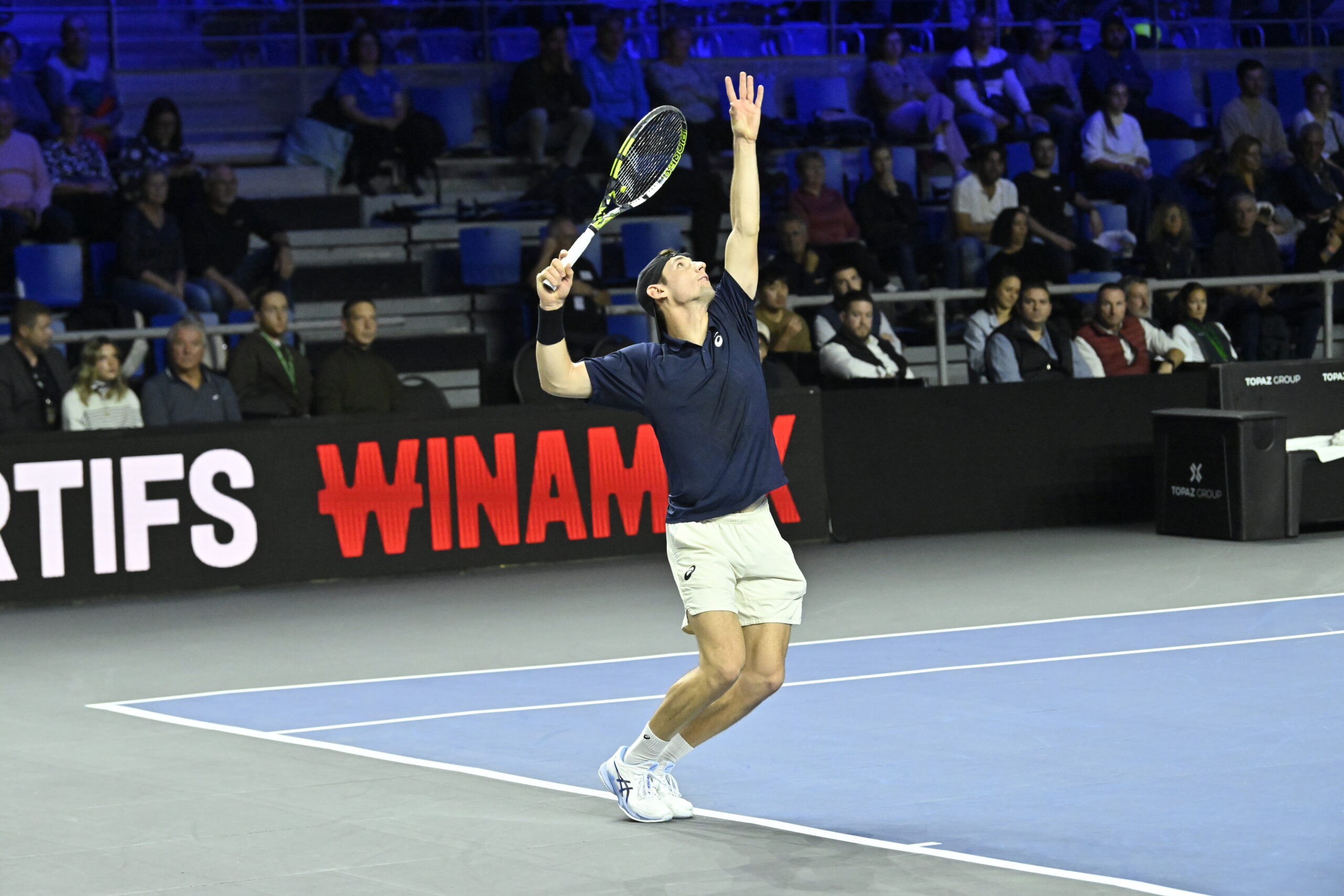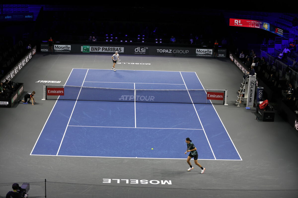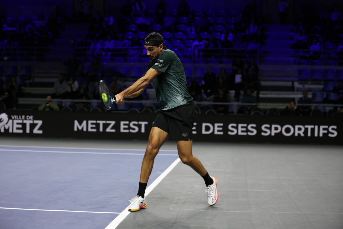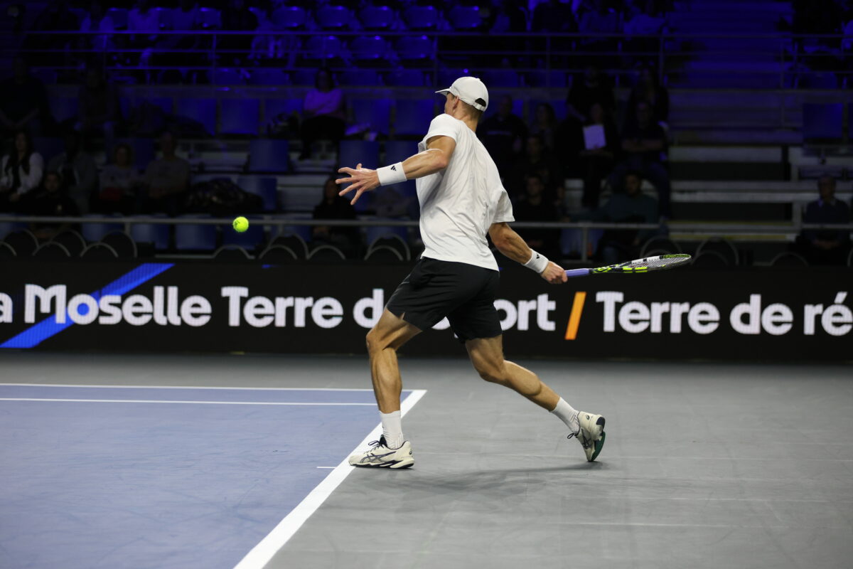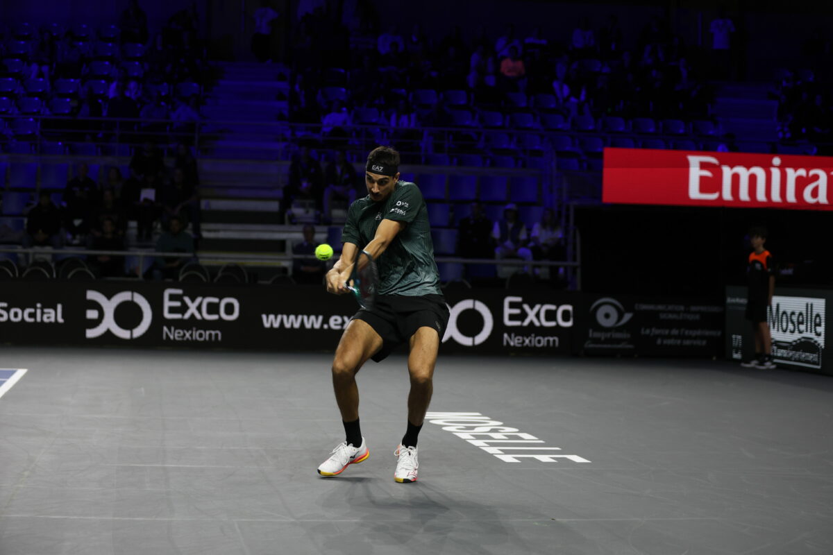 101 Fortunes diverses pour les Français lors de la suite du premier tour du Moselle Open. Sonego et Norrie ont quant à eux assuré. Si la programmation de dimanche assurait la présence de deux Tricolores au tour suivant (Arthur Cazaux et Hugo Gaston), cette fois les cinq à l’affiche en ouverture de semaine ont été dominés, à l’exception de Clément Tabur (244e joueur mondial) qui s’offrait le scalp du 62e au classement ATP. Exploit de Clément Tabur face au 62e joueur mondial La plus grande confidentialité offerte par le court numéro 1 de ce Moselle Open a probablement permis à Clément Tabur de s’enlever quelque peu de la pression que peut ressentir un joueur lorsqu’il joue un tournoi dans son pays. Face à un Aleksandar Kovacevic nettement mieux classé que lui, Tabur se montrait très solide sur son service. L’Américain se trouvait notamment en difficulté sur sa seconde balle (seulement 26% de points remportés. Au final, le Tricolore se qualifiait en deux sets (6-3, 6-2) en remportant près du double de points que son adversaire (62 contre 33). Sur le même court, Ugo Blanchet subissait la loi de Learner Tien (6-3, 6-3) en ne parvenant jamais à inquiéter l’Américain de 19 ans sur son service. Fin prématurée dans ce Moselle Open pour Giovanni Mpetshi Perricard Open de Moselle 2025 – 03/11/2025 – Tout comme Aleksandar Kovacevic, Giovanni Mpetshi Perricard ne parvenait pas à assumer son statut de favori face à l’Ukrainien Vitaliy Sachko (222e joueur mondial), qui disputait pour l’occasion son premier match d’un grand tableau sur le circuit principal. Si le service a, une nouvelle fois permis au Français de faire illusion (10 aces), son principal atout n’a pas fait le point face à un joueur qui tenait remarquablement à l’échange et parvenait même à lui asséner quelques retours de service bien placés que Mpetshi-Perricard ne parvenait pas à relancer. L’Ukrainien l’emportait après un jeu décisif disputé (12-10) et en breakant une fois dans le second set (7/6, 6/4). Il sera opposé à Alexander Bublik. Valentin Royer a tenu la dragée haute au dernier finaliste du Moselle Open Comme Lorenzo Sonego (vainqueur du Moselle Open en 2022), Cameron Norrie, finaliste de la dernière édition, a dû batailler pour se défaire de Valentin Royer (56e). Comme l’Italien face au qualifié Jan Choinski (victoire 4-6, 6-4, 6-4), le 27e joueur mondial était dans l’obligation de serrer le jeu et de se remobiliser alors que le Français jouait son meilleur tennis en étant dos au mur. Royer empoche la deuxième manche au cours d’un tie-break mené tambour battant (7-2). Mais un break obtenu d’entrée de dernière manche permettait au Britannique de continuer sa route dans cette édition du Moselle Open (6-3, 6-7, 6-3). Lors de la dernière rencontre sur le central des Arènes ce lundi, Matteo Berrettini n(a pas fait de sentiments en dominant un Quentin Halys impuissant malgré une belle résistance (6-2, 6-4). Cameron Norrie et Matteo Berrettini seront respectivement opposés à Arthur Cazaux et au vainqueur du duel entre Corentin Moutet et Aleksandar Vukic. Deux affiches qui devraient offrir du spectacle au public messin. Résultats de la journée du 3 novembre Simple (Premier tour): Lorenzo Sonego-Jan Choinski (4-6, 6-4, 6-4)Learner Tien-Ugo Blanchet (6-3, 6-3)Vitaliy Sachko-Giovanni Mpetshi Perricard (7-6, 6-4)Clément Tabur– Aleksandar Kovacevic (6-3, 6-2)Cameron Norrie-Valentin Royer (6-3, 6-7, 6-3)Matteo Berrettini-Quentin Halys, (6-2 Double (Premier tour): Dan Added/Tom Paris-Théo Arribage/Albano Olivetti (6-2, 5-7, 10-5)Guido Andréozzi/Manuel Guinard-Jakub Paul/Matej Vocel (4-6, 6-0, 10-7)Petr Nouza/Patrik Rikl-Diego Hidalgo/Patrick Trhac (6-3, 6-4) Crédit photos: Open de Moselle et Diaporama (Julien Buret /LGM)