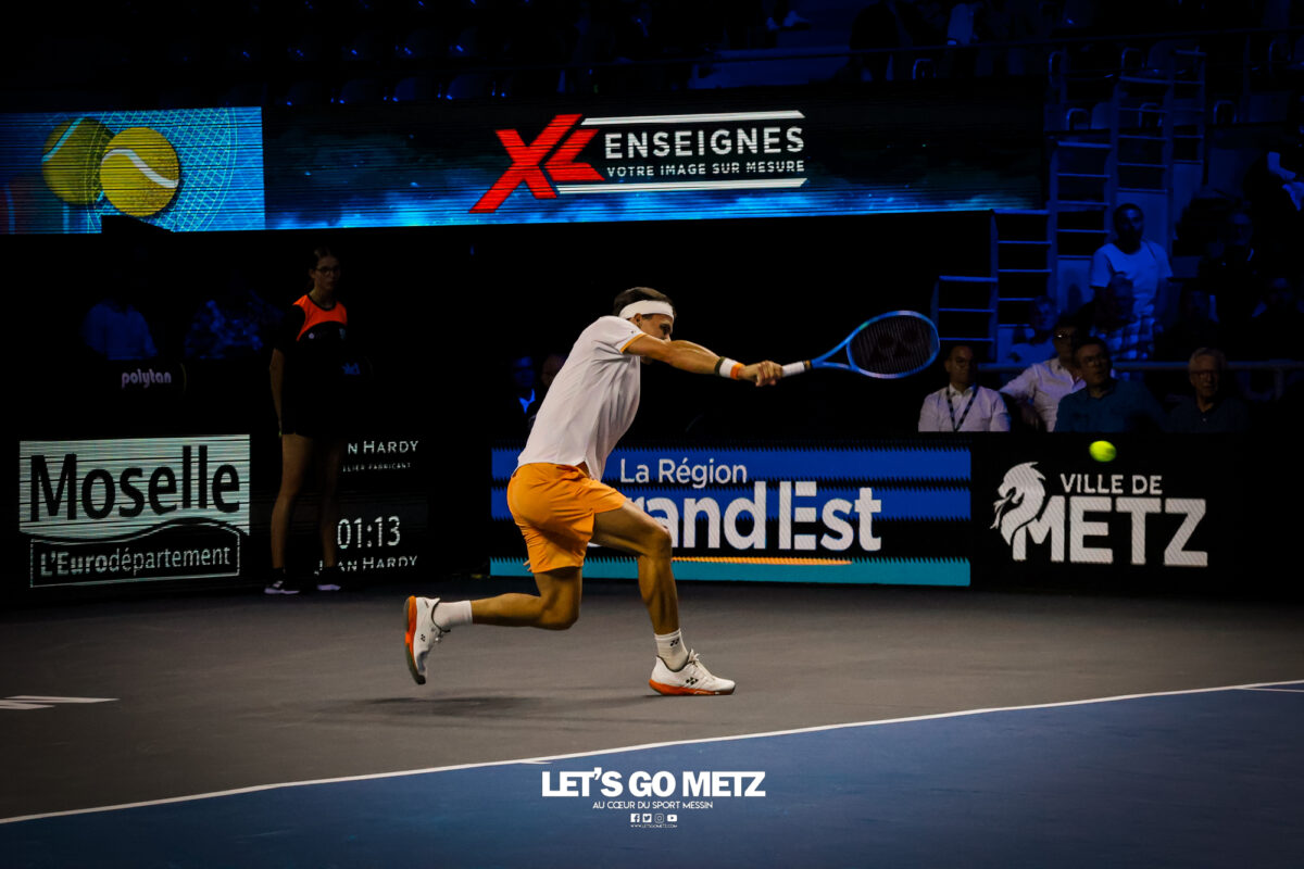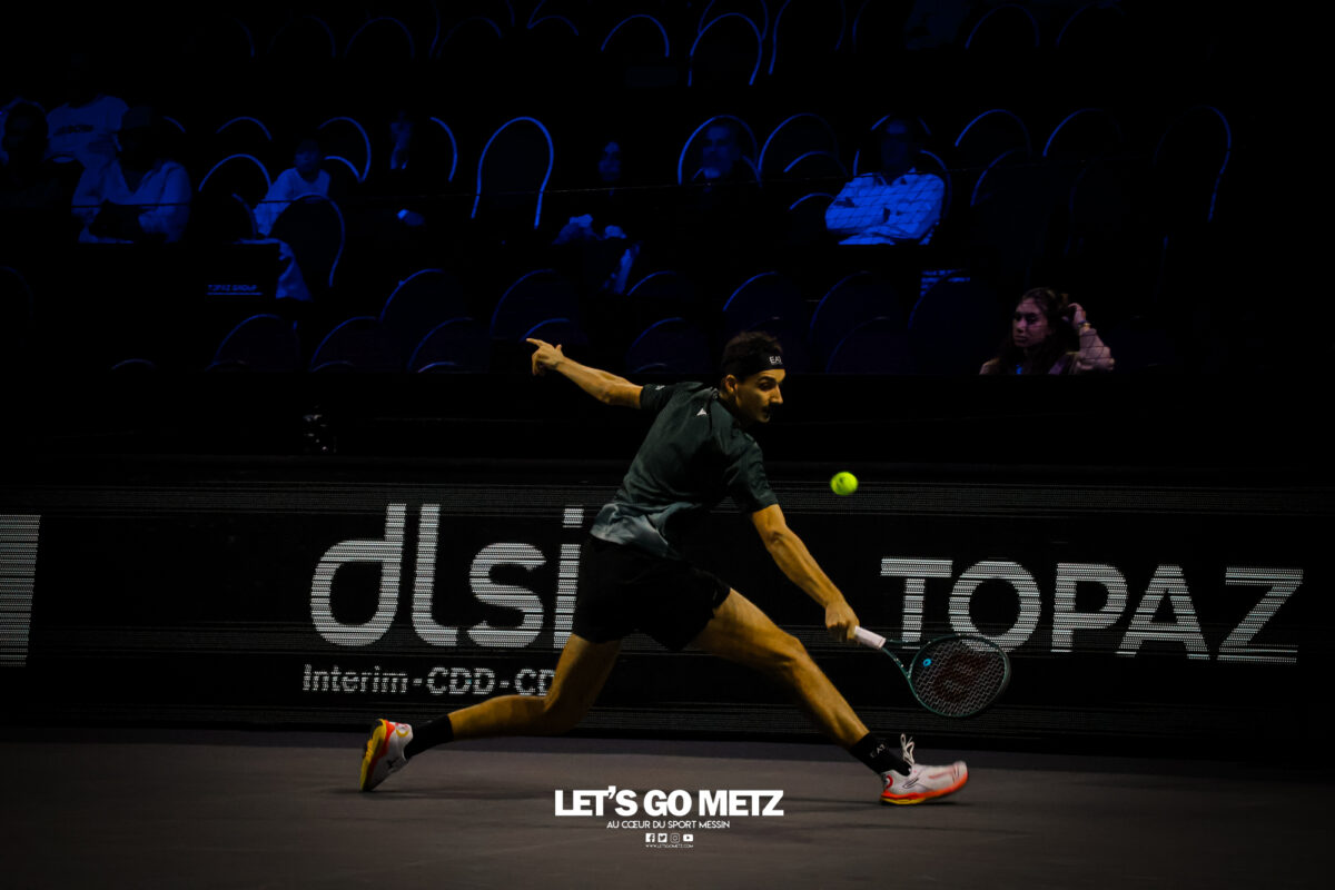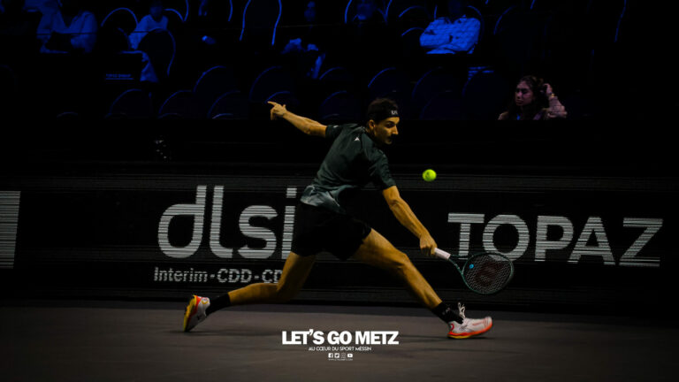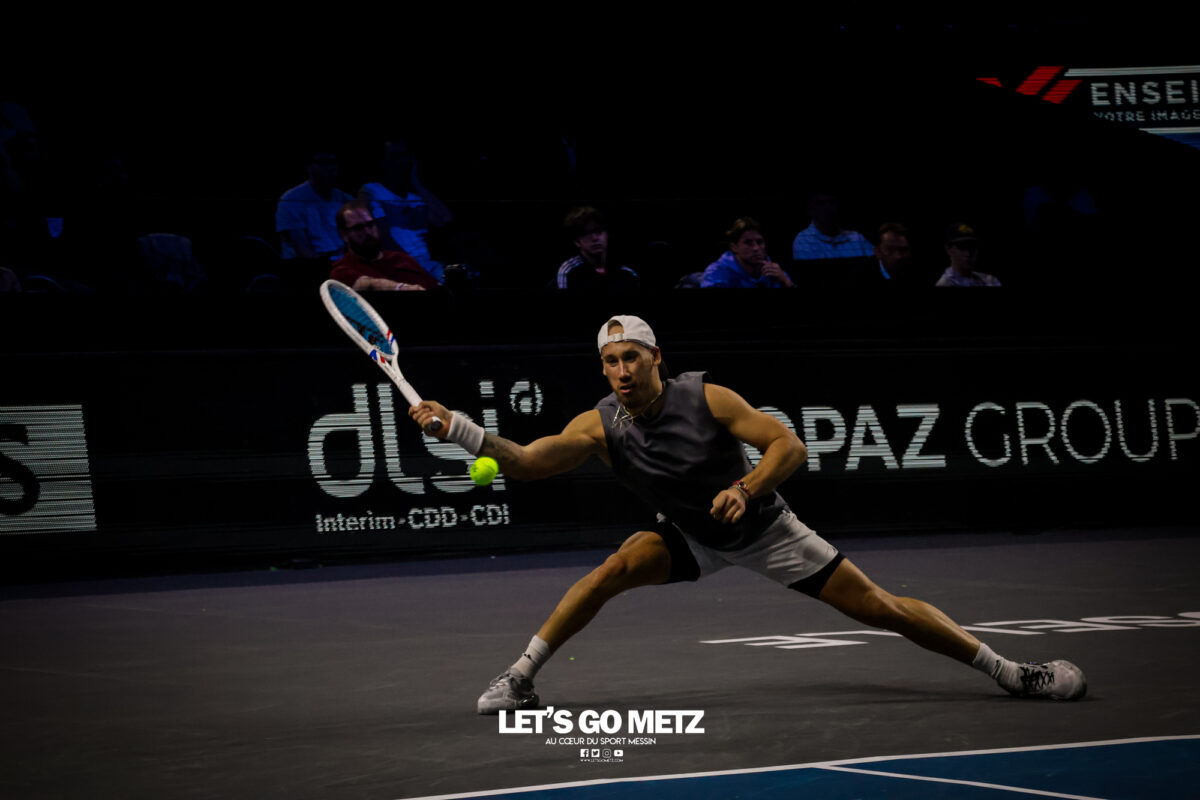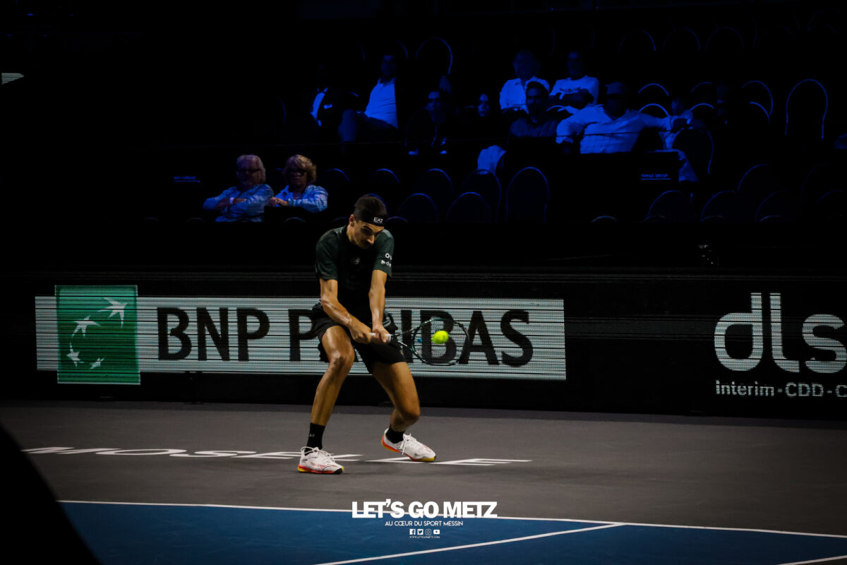 62 Cette journée du jeudi était dédiée aux quarts de finale du Moselle Open. Elle offrait quatre affiches mêlant joueurs confirmés et révélations qui ont toutes tenues leurs promesses. Les organisateurs de cette dernière édition du Moselle Open ont placé les deux derniers Français en lice dans le tableau de simple en début et en fin de programme. L’un, Kyrian Jacquet (156e mondial) était opposé à Cameron Norrie, finaliste l’an passé, l’autre, Clément Tabur, repêché de dernière minute, était opposé à l’autre révélation de la semaine, Vitaliy Sachko qu’il avait battu en qualification et qui s’est vu repêché au gré des défections. Entre les deux, les spectateurs des Arènes ont vu s’opposer l’Allemand Daniel Altmaier et le lauréat de l’édition 2022, Lorenzo Sonego avant qu’un autre Italien, Matteo Berrettini, n’affronte le protégé de Michael Chang, Learner Tien. Alors que les vainqueurs du tournoi de double l’an passé, Sander Arends et Luke Johnson venaient de se qualifier pour les demi-finales, Kyrian Jacquet était placé face au plus grand défi de sa carrière face au 27e joueur mondial qui a pour objectif de faire au moins aussi bien que lors de la dernière édition. Kyrian Jacquet passe proche de l’exploit Sans doute quelque peu pris par l’enjeu de la rencontre, le Français perdait sa deuxième mise en jeu et était rapidement mené (1-3 puis 2-4). Le Tricolore ne s’en laissait pas compter et tenait de mieux en mieux l’échange au point de remporter quatre jeux consécutifs et d’empocher du même coup la première manche (6-4). Les deux sets suivants étaient tout aussi indécis. Les deux joueurs remportaient leurs services avant que le Britannique ne prenne l’ascendant dans les moments clés. Norrie dominait ainsi assez largement le tie-break (7-2) ainsi que les huit derniers points de la rencontre. Il l’emportait 4-6, 7-6, 6-4 en près de 2 h 30 de jeu et validait sa place dans le dernier carré. Il a fallu un peu plus de deux heures (2 h 02) pour connaître son adversaire. Ce sera Lorenzo Sonego qui est venu à bout de Daniel Altmaier au terme d’un intense combat. Si, dans la première manche, l’Italien pouvait sembler avoir un ascendant, il ne remportait qu’une fois la mise en jeu de l’Allemand au cinquième jeu. Il n’en demeurait pas moins que les deux joueurs se livraient à une rude bataille finalement remportée par la vainqueur de l’édition 2022 (6-4). Le second set restait sur la même lancée, les deux joueurs conservaient leurs mises en jeu. La fin du set était haletante et peut laisser des regrets à Daniel Altmaier. L’Allemand s’est en effet procuré six balles de set que Sonego sauvait avec aplomb. Le Transalpin finissait par remporter ce quart de finale au terme d’un jeu décisif qui reflétait bien la physionomie de la partie tant il était serré. Lorenzo Sonego l’emporte sans briller Face à Daniel Altmaier, qui avait battu les Français Rinderknech et Gaston, Lorenzo Sonego est sorti vainqueur d’un match accroché. Le vainqueur de l’édition 2022 a su gagner les points importants, pour remporter une rencontre qui est restée indécise jusqu’au bout. Dans le premier set, Sonego parvenait à breaker (3-2), puis à assurer sur son service pour prendre les devants (6-4). Mais dans la deuxième manche, les deux joueurs sauvaient de nombreuses balles de break (13 au total), pour conserver leurs mises en jeu jusqu’au tiebreak. A cet exercice, c’est encore l’Italien qui prenait le dessus, par la plus petite des marges (8-6). Au final, Lorenzo Sonego gagne en deux sets et file en demi-finale (6-4, 7-6). Learner Tien trop fort pour Berrettini Le troisième quart de finale opposait Matteo Berretini, ex-numéro 6 mondial à Learner Tien, qui fait déjà parti du top 40 à seulement 19 ans. L’Italien proposait un bien meilleur niveau que la veille, où il avait péniblement battu Aleksandar Vukic. Il utilisait sa puissance au service et en coup droit pour dominer la première manche, avec un jeu très offensif (7-5). Mais le protégé de Michael Chang faisait les ajustements nécessaires pour inverser la tendance dans le deuxième set. Surtout, il évitait le plus possible le coup droit de son adversaire et exposait sa faiblesse en revers. Il parvenait également placer Berrettini dans un schéma de jeu plus défensif. Or le grand Italien n’est pas réputé pour ses qualités de déplacement. Avec beaucoup d’intelligence, Learner Tien emmenait la rencontre au troisième set (6-2). L’Américain gardait le contrôle dans la manche décisive, en dévoilant toute sa panoplie de coups. Coups droits liftés, revers slicés, amortis et même des montées au filée. Submergé, Berrettini tentait tant bien que mal d’imposer sa puissance et de se rassurer sur ses jeux de service… en vain. En 1 h 44 min, Learner Tien gagnait sa place en demi-finale. Sachko prend sa revanche sur Clément Tabur Après l’avoir battu en qualifications, Clément Tabur rencontrait encore l’Ukrainien Vitaliy Sachko en quart de finale. Le Français rentrait difficilement dans son match, en concédant son jeu de service d’entrée, puis le premier set (6-4). Mais son adversaire du jour, tout frais de sa victoire face à Bublik, commettait beaucoup de fautes directes. Le Français prenait confiance dans le deuxième set, qu’il remportait assez facilement (6-3). Dans la troisième manche, les deux joueurs élevaient leur niveau de jeu pour proposer un beau spectacle. Finalement, c’est Vitaliy Sachko qui obtenait son ticket pour les demi-finales (6-4, 3-6, 6-4). Résultats du 6 novembre Quarts de finale simple Cameron Norrie -Kyrian Jacquet (4-6, 7-6, 6-4)Lorenzo Sonego – Daniel Altmaier (6-4, 7-6)Learner Tien – Matteo Berrettini (5-7, 6-2, 6-3)Vitaliy Sachko – Clément Tabur (6-4, 3-6, 6-4) Quart de finale double Sander Arends/Luke Johnson-Rafaël Matos/Marcelo Melo (4-6, 6-3, 10-5)