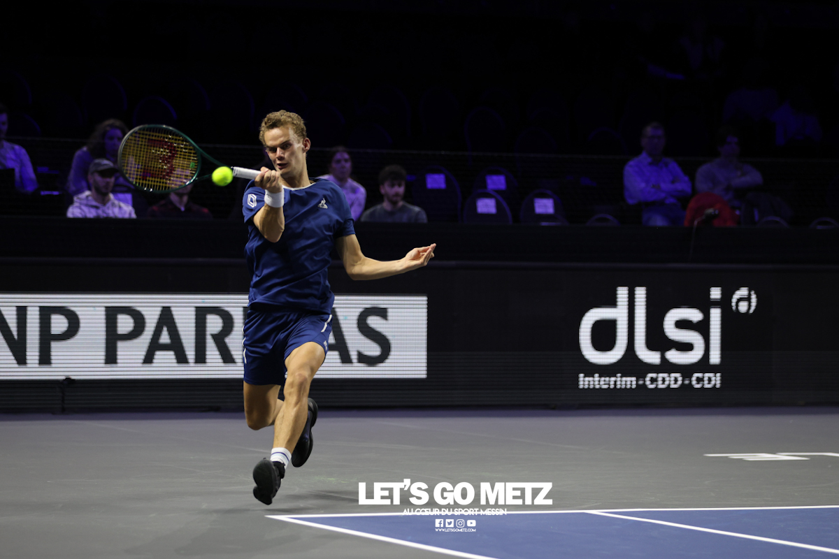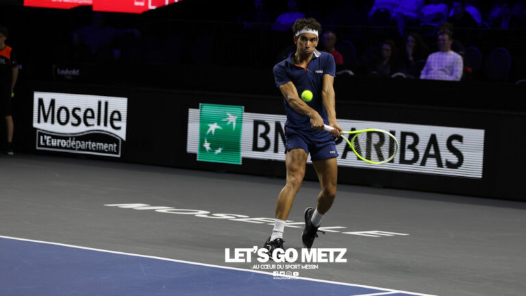 190 La première journée des qualifications au Moselle Open a été marquée par l’abandon de Harold Mayot, qui représentait le seul espoir messin après le désistement d’Ugo Humbert. Malgré cette déception, le public du court central a profité de plusieurs bons matchs. Découvrez les résultats du 1er novembre. La dernière édition du Moselle Open a commencé ce samedi 1er novembre, avec le premier tour des qualifications. L’occasion pour le public du court central de profiter d’une ultime expérience du tennis de haut niveau aux Arènes de Metz. L’espoir aussi de voir un Messin briller. Ça ne pouvait plus être Ugo Humbert (37ᵉ mondial), champion en 2023, qui a dû renoncer à sa participation en raison d’une blessure au dos. Mais ce samedi, Harold Mayot (159ᵉ) allait se battre pour atteindre le tableau principal et challenger les grosses pointures. Harold Mayot contraint à l’abandon Malheureusement gêné par une douleur de fatigue au poignet, Harold Mayot n’a pas tenu le coup face au Britannique Jan Choinski dans le match d’ouverture du tournoi. Mené cinq jeux à deux dans le premier set, il décidait finalement d’abandonner. L’état de forme du Messin ne devrait pas nous surprendre. Il y a quelques jours, le 26 octobre, il disputait une finale de Challenger en Chine. Son quatrième tournoi d’une tournée asiatique épuisante. Luca Van Assche victorieux au bout du suspense Dans le deuxième match de la journée sur le court central, Luca Van Assche (170ᵉ) sortait en vainqueur d’un long combat contre Billy Harris (6-1, 6-7, 6-4). La première manche présageait un match à sens unique, avec une nette domination du Français. Mais le suspense était complètement relancé, quand son adversaire effaçait trois balles de matchs pour saisir le tiebreak du deuxième set (11-9). Luca Van Assche prenait finalement le dessus dans la troisième manche, grâce notamment à un service impérial. Dans les autres matchs, Kyrian Jacquet (155ᵉ) trouvait la solution face à l’Italien Andrea Pellegrino en trois sets (4-6, 6-1, 6-2). Clément Tabur (244ᵉ) parvenait à faire la différence de justesse face au Norvégien Nicolai Budkov Kjaer (7-5, 7-5). Puis Tom Paris s’inclinait face à Moez Echargui au terme d’un gros duel (6-4, 4-6, 7-6). Les deux joueurs faisaient vibrer le public, avec de nombreux échanges spectaculaires. Tard dans la soirée, Dan Added venait à bout de la tête de série numéro 1 des qualifications Tristan Schoolkate (6-4, 6-7, 7-6), pour clôturer une belle première journée aux Arènes. Résultats de la journée du 1er novembre Jan Choinski – Harold Mayot (5-2, ab.)Andrea Pellegrino – Kyrian Jacquet (4-6, 6-1, 6-2)Alexander Shevchenko – Vitaliy Sachko (6-3, 6-1)Billy Harris – Luca Van Assche (6-1, 6-7, 6-4)Clément Tabur – Nicolai Budkov Kjaer (7-5, 7-5)Arthur Bouquier – Francesco Passaro (6-1, 6-1)Tom Paris – Moez Echargui (4-6, 6-4, 7-6)Tristan Schoolkate – Dan Added (6-4, 6-7, 7-6) Tomas Machac (32e mondial) a retiré ce samedi sa participation au Moselle Open. Il sera remplacé par un Lucky loser, c’est-à-dire un perdant des qualifications. Crédit photo : Julien Buret / Let’s Go Metz Avec Alexandre Bur