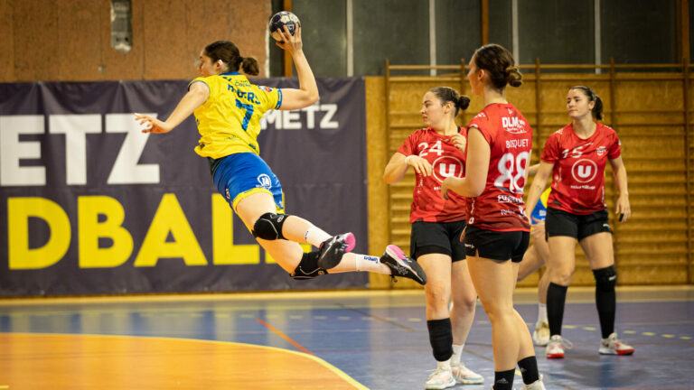 762 Metz Handball recevait le Reims Champagne Handball ce samedi dans le cadre de la septième journée de Nationale 1 Féminine (N1F). Une semaine après leur victoire convaincante face à Chevigny-saint-Sauveur, les joueuses de l’équipe de Nationale 1 Féminine de Metz Handball étaient de retour au gymnase du Technopole pour défier l’équipe de Reims ce samedi. Offensives, les Messines prenaient les devants pour mener de trois buts jusqu’à la 9ème minute. Surprises par les efforts rémois, les locales voyaient fondre leur avance jusqu’à être menées d’un but après seulement 12 minutes de jeu (8 – 9). Entretenant les séquences à égalité pendant de longues minutes, les locales tremblaient lorsque Nelya Goval écopait d’une suspension pour deux minutes, cependant Fatima Camara saisissait le moment idéal pour réaliser plusieurs parades et permettre aux siennes de rester dans le match. Un temps mort messin venait rompre le bras de fer à 10 minutes de la fin de la période (11 – 11, 20ème). Sur l’action suivante, Yvana Atangana faisait les frais d’une suspension pour deux minutes. Un tir vengeur de Merle Albers, laissée seule en face à face avec la gardienne adverse redonnait l’avantage aux jaunes et bleues (12 – 11, 23ème) mais de pertes de balle en gestes maladroits, les Messines ajoutaient un certain manque d’efficacité sur jeu rapide qui les forçait à se résoudre au nul à la demi-heure de jeu. Score à la mi-temps : 14 – 14 Reims débutait mal la seconde période avec une séquence offensive manquée et la suspension de Ellie Darleux. Mais Alicia Ntessi offrait une bonne assurance coté visiteur avec consécutivement un arrêt sur jet de 7 mètres puis deux parades à 6 mètres. Les Messines devaient redoubler d’efforts pour enfin créer un nouveau break (19 – 17, 39ème)Nelya Goval faisait fructifier la marque mais Yvana Atangana écopait d’une nouvelle suspension. Un avertissement sans frais alors que Fatima Camara stoppait un jet de 7 mètres quelques secondes plus tard (20-17, 42ème).Liloa Bosquet écopait d’une suspension de deux minutes du côté rémois et Claire Koestner en profitait pour régler la mire sur jet de 7 mètres. Sur l’action suivante Caroline Perras sortait également et les visiteuses devaient puiser dans leurs réserves pour limiter la casse (24 – 17, 47ème). Alors confortablement en tête les jeunes Dragonnes optaient pour un jeu plus raisonné et en accord avec leur rythme habituel. Dans le même temps, les rémoises plus émoussées subissaient des séquences qu’elles parvenaient à maîtriser plus tôt dans la partie. Une situation inchangée malgré de nombreux remplacements, rendant la fin de match quasi anecdotique après une belle bataille. Score final de ce Metz Handball – Reims en N1F : 30 – 22 Les joueuses de Metz Handball, toujours leaders de la poule 3 de Nationale 1 Féminine, défieront Palaiseau dans le cadre d’un nouveau match à domicile le 04 novembre. Le mot de Nina Kanto A l’issue de la rencontre, la coach messine Nina Kanto avait beaucoup de choses à évoquer notamment sur la première mi-temps. La première mi-temps était catastrophique. Du déchet technique, des erreurs individuelles, un manque de rythme. On y était pas malgré la bonne entame. C’était vraiment frustrant. […] En deuxième mi-temps on est solides, compactes, on parle… On est enfin Metz Handball. Nina Kanto après le match Si en deuxième mi-temps les étoiles se sont alignées, plusieurs cadres ont été à la peine durant le match, loin de leur jeu habituel. Je suis préparée au fait qu’elles ne soient pas toujours à 100%, mais il faut que derrière les autres soient prêtes à prendre le relai. Aujourd’hui heureusement qu’elles se sont reprises. […] Je l’ai dit à Manon Errard, il faut assumer son talent. On ne peut pas se cacher derrière la jeunesse quand on a ce talent. Nina Kanto après le match A contrario, une joueuse a semblé particulièrement en forme à son poste : Merle Albers. On avait ciblé des manques sur le poste de pivot, en face ce sont des joueuses généreuses dans le combat qui ont tendance à se jeter, ce qui crée des espaces que Claire (Koestner) ou Yvana (Atangana) ont bien exploité par exemple en trouvant bien Merle. Nina Kanto après le match La galerie de la rencontre Les stats du match Metz HandballCamara (15 parades), Rodrigo da Costa (1 parade), GonzalezGoval (6/7), Albers (6/8), Ndebo Madoda, Koestner (2/4), Zagar, Giliberto, Atangana (2/4), Tuccella (6/11), Balassi (2/5), Glabay (0/1), Errard (6/8). Reims Champagne HandballNtessi (12 parades)Coudereau, Claude, Mosca (1/2), Varnerot (1/3), Fohrer (3/4), Darleux (1/2), François (7/14), Jouan (6/14), Perras (0/1), Moyat, Poinsot, Bosquet (3/6). Crédit photo : Julien Buret / Let’s Go Metz