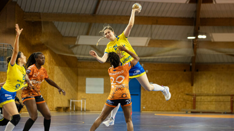 678 L’équipe N1F de Metz Handball était de retour au gymnase du Technopole samedi pour défier l’ASPTT Strasbourg. Si on se fie au classement, l’ASPTT Strasbourg n’est pas l’équipe la plus redoutable du championnat. Mais ce constat serait un peu bâclé si on oubliait le bon début de saison qu’avait connu l’équipe alsacienne (3 victoires, 1 nul) avant de vivre un trou d’air de quelques semaines avec 4 défaites de rang. Relancées avec leur victoire face à Villemomble lors de la 9ème journée, les visiteuses se présentaient à Metz avec la forte volonté de faire trembler le leader. Après dix minutes de jeu ce sont les messines qui prenaient néanmoins les devants en atteignant les premières la barre des dix buts (10 – 4, 10ème) mais le collectif alsacien ne se laissait pas démonter. Sous les encouragements constants de leur banc, les filles en orange réalisaient une grosse séquence de jeu. Aidées par la triple parade d’Ornella Andreacchio sur les tirs pourtant bien inspirés de Claire Koestner, Merle Albers et Emma Tuccella, les visiteuses se rapprochaient au score et il fallait un kung-fu conclu par Claire Koestner pour relancer la machine jaune et bleue (13-9, 20ème). La fin de mi-temps disputée à pleine vitesse tournait à l’avantage des messines avec comme fait d’arme une contre-attaque rondement menée par Nelya Goval.Score à la mi-temps : 17 – 12 La deuxième mi-temps débutait sur un manque d’efficacité commun, bien consolidé par les bonnes performances de Léane Gonzalez et Ornella Andreaccio dans leurs buts respectifs sur les cinq premières minutes. Les deux équipes optaient finalement pour un coup l’accélérateur qui faisait craquer les défenses tout comme en fin de première période. Les missiles à 6 mètres se succédaient à l’image du bon jeu au pivot de Merle Albers et de la percée de Manon Errard qui suivait et Metz Handball préservait son avance (23 – 17, 41ème).Strasbourg continuait ses efforts pour recoller mais Andela Zagar faisait parler sa taille sur une bonne combinaison et quelques instants plus tard Leane Gonzalez parait un 7 mètres pour garder la distance. Dans la foulée, Emma Tuccella nettoyait la lucarne adverse (26-20 48ème) et Metz Handball pouvait à nouveau basculer en mode « gestion ». Les multiples kung-fu en fin de match à l’initiative de Emma Tuccella ou encore Claire Koestner prouvaient une nouvelle fois l’aisance des locales qui terminaient la rencontre sans trembler. Score final de ce Metz Handball – ASPTT Strasbourg en N1F : 29 -24 La galerie du match Les stats de la rencontre Metz HandballCamara (5 parades), Gonzalez (5 parades), Rodrigo da Costa (3 parades)Goval (1 but sur 3 tirs), Albers (7/9), Koestner (7/13), Zagar (1/3), Giliberto, Antangana (2/5), Tuccella (3/6), Balassi (4/7), Glabay (0/1), Errard (4/6). ASPTT StrasbourgAndreacchio (16 parades)Burgmann (0 but/1 tir), Cambus (6/15), Robillard-Martel (1/2), Badiane, Laignel Geng (1/3), Bole (3/3), Fussler, Merrifield (2/3), Kouelamambou (5/10), Klein (1/4), Soule (1/2), Dirakhon (3/4), Kieny (1/4). Crédit photo : Julien Buret