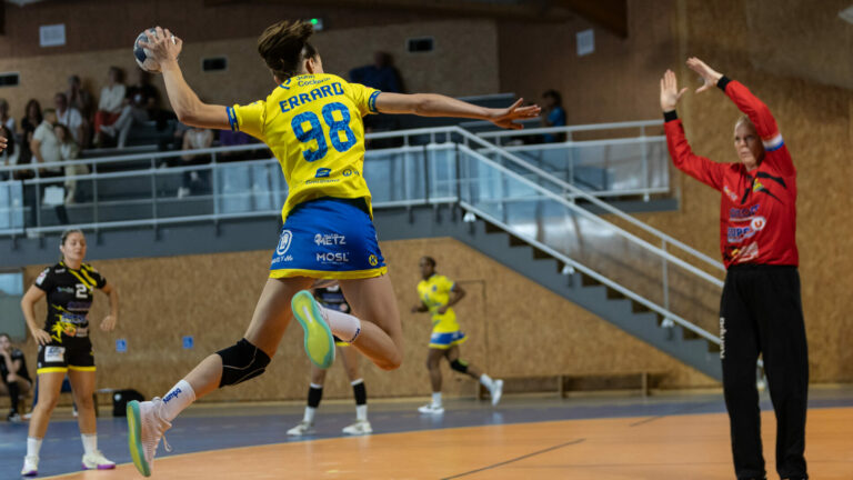 582 L’équipe de N1F de Metz Handball recevait Palente Besançon pour le compte de la quatrième journée de la saison 2023/2024. Une semaine seulement après un match manqué face à Villemomble, les joueuses de Nina Kanto disputaient un nouveau match à domicile ce dimanche. Cette fois, il s’agissait de défier Palente Besançon, une équipe leader de la poule 3 de Nationale 1 Féminine avec trois victoires en trois matchs… mais une équipe également chevronnée, puisque récemment reléguée depuis la D2F. Il fallait donc, pour les jeunes dragonnes, mettre de côté les nombreuses interrogations apportées par le revers subi lors de la troisième journée et se reconcentrer sur l’essentiel. Dans cette démarche, Nina Kanto a pu compter sur la présence de Délia Golvet. La joueuse, polyvalente sur la base arrière, qui effectue sa deuxième année au centre de formation, est surclassée depuis le début de saison auprès des Dragonnes d’Emmanuel Mayonnade et a d’ailleurs disputé quelques minutes remarquées lors de la récente victoire des Jaunes et Bleues face à Lubin en Champions League. À noter également le retour d’Andela Zagar dans le jeu. Un retour aux sources agréable qui a semblé bénéficier aux jeunes Messines. Plus incisives dans le rôle de l' »underdog », les locales menaient déjà de trois buts après onze minutes de jeu (6 – 3). Déterminées à faire grossir l’écart, les joueuses de Nina Kanto appuyaient sur l’accélérateur jusqu’à la pause. Un effort payant avec une avance confortable a la clé. Score à la mi-temps : 16 – 9 De retour des vestiaires, les deux formations laissaient la défense de côté pour inscrire dix buts en 7 minutes, mais l’avantage restait largement en faveur des locales (23 – 12, 37ème). Cette avance permettait de faire tourner l’effectif et de responsabiliser toutes les joueuses. Une opportunité intéressante dans un match qui, sur le papier, aurait pu être serré. Besançon en profitait pour réduire l’écart avec plusieurs buts inscrits consécutivement, mais les jeunes Dragonnes terminaient la rencontre en maîtrise. Cette victoire face à un adversaire qui devrait jouer le haut de tableau et, qui plus est, sous le regard de nombreuses joueuses de l’équipe première et du sélectionneur national, devrait donner le plein d’énergie aux jeunes Messines. Score final de ce Metz Handball – Palente Besançon en N1F : 34 – 28 Prochaine étape pour Metz Handball dans cette saison de N1F, un déplacement du côté de la JDA Dijon, avant de retrouver la compétition à domicile le 21 octobre face à Chevigny Saint Sauveur. La galerie du match Les stats de la rencontre Metz HandballCamara (14 parades), Rodrigo da Costa (1 parade)Goval (4 buts sur 6 tirs), Albers (2/2), Golvet (3/8), Quesada (1/1), Koestner (6/7), Zagar (5/7), Gilberto (1/1), Atangana (4/7), Tuccella (5/7), Balassi (0/3), Glabay, Errard (3/7) Palente BesançonScalabrino (14 parades)Pouillet (3 buts sur 4 tirs), Janod (2/6), Pourcelot (1/2), Cuenot (1/2), Atila (3/6), Krouk, Herzog (7/10), Vernerey (4/7), Chiet (0/1), Kebe (7/10) Crédit photo : Julien Buret