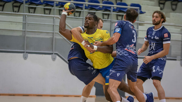 583 Pour le compte de la 2ème journée de Nationale 1, Metz Handball recevait Beaune au Palais des Sports Saint Symphorien. Après un début de match équilibré, les Messins sont parvenus à prendre le large et s’imposer 42-23. Des messins gênés Avec deux buts coups sur coups, ce sont les visiteurs qui lancent les hostilités. En effet, Beaune a rapidement mené au score. Alors que les deux équipes montrent un visage agressif, c’est l’arrière droit Beaunois, Nicolas Gregulski qui reçoit le premier avertissement de la rencontre. Dominant dans le jeu, les messins peinent à marquer. Effectivement, François Mai, le gardien adverse enchaîne les parades contrariant les partenaires d’Antonin D’Hondt, pas forcément en réussite en ce début de partie. Après avoir chuté face au portier, Romain Baumann sonne la révolte en inscrivant trois buts d’affilée. L’arrière gauche messin permet à son équipe de prendre l’avantage. (4-3 10’) Une fois remis dans le sens du jeu, les messins enchaînent les buts et font plier la défense adverse. Xavier Blond, Médérick Grégoire et Guillaume Bettenfeld y vont chacun de leur réalisation. Metz Handball prend le large et force Sassi Boultif à poser son premier temps mort (14′). Beaune tente de prendre la possession et de calmer le jeu. Cependant, les Messins, solides défensivement, récupèrent de nombreux ballons afin de se projeter en contre attaque. Une tactique payante puisque Metz Handball parvient à prendre trois longueurs d’avance sur Beaune. Auteur d’une bonne partie, le gardien beaunois permet de garder son équipe la tête hors de l’eau. Difficile de résister face aux assauts messins, Beaune voit Metz Handball creuser de plus en plus l’écart (13-9 27’). Peu de temps avant la mi-temps les visiteurs craquent. En commettant une vilaine faute, Milan Panic est contraint de rejoindre le banc pour deux minutes. Pas forcément en accord avec la décision arbitrale, le coach Sassi Boultif fait savoir son mécontentement et reçoit un carton jaune. Fin d’une première mi-temps décousue qui voit les Messins rentrer aux vestiaires avec six buts d’avance (16-10 MT). Metz fait exploser Beaune Au retour des vestiaires, les jaunes et bleus appuient sur l’accélérateur et vont rapidement distancer leurs adversaires (24-14 38’). Emmenés par Mederick Gregoire et Romain Baumann, les joueurs de David Motyka imposent leur rythme. Contre-attaques sur contre-attaques, les Messins s’illustrent tour à tour. Andrezo, Blond, Bettenfeld et Fuchs vont aggraver le score. Beaune définitivement coulé ne parviendra à réduire petit à petit le score. (30-16 46’) Impuissants, les Beaunois voient leurs offensives repousser par le portier messin Hugo Bordy auteur de 11 arrêts. Un véritable calvaire qui ne semble pas s’arrêter. Par ailleurs, déjà en difficulté dans tous les compartiments du jeu, le solide défenseur Damien Carpentier est exclu définitivement pour avoir poussé Steven Bello, alors en pleine extension, prêt à tirer. Une performance remarquable sur laquelle David Motyka pourra s’appuyer lors des prochaines sorties. Metz Handball s’impose largement 42-23 et enregistre sa première victoire cette saison en Nationale 1. Une performance de bonne augure qui devrait enchanter les supporters. Les hommes de David Motyka tenteront de confirmer cette belle performance le week-end prochain à Livry-Gargan. Statistiques : Metz Handball : Bordy (11 arrêts) – Balmy (3 arrêts) Langhoff Olesen (1/3) – Bettenfeld Geo (10/11) – Bettenfeld Gui (1/2) – Abate (0/1) – Goffin (3/6) – Andrezo (2/3) – Fuchs (2/3) – Bello (1/4) – Blond (7/10) – D’Hondt (2/4) – Grégoire (6/6) – Baumann (7/9) Beaune : Mai (7 arrêts) – Stephan (6 arrêts) Naudin (6/13) – Demane (3/7) – Laurence – Carpentier (0/1) – Bernard (2/3) – Ollier – Naudin (0/2) – Gregulski (5/10) – Charpy (0/1) – Houillon (4/7) – Panic (2/3) Photos : Lucas Deslangles / Let’s Go Metz