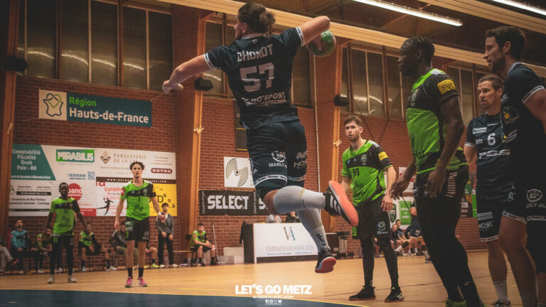 1,2K En Nationale 1 (N1M), le Metz Handball se déplaçait dans le Nord pour y affronter Villeneuve d’Ascq. Une victoire renversante (21-33) de bon augure pour la suite de la compétition. Ce samedi, le Metz Handball affrontait le LMHBCV pour le compte de la 17ème journée de N1M.Après avoir livré une belle prestation face à Thionville la semaine passée, les handballeurs messins avaient à cœur de confirmer leur bonne forme actuelle par une victoire à Villeneuve d’Ascq. De son côté, le club nordiste (11ème avec un match de retard) restait sur trois rencontres sans défaite et revenait sur Metz (9ème) au classement. Cette affiche s’avérait d’une importance capitale pour les deux équipes en quête de points. Une victoire sans appel pour le Metz Handball Ce samedi, les protégés de David Motyka n’ont fait qu’une bouchée des Nordistes. Pourtant, l’entame de match n’annonçait pas une victoire aussi aisée. Les premiers échanges se montraient assez équilibrés entre deux équipes qui ne parvenaient pas à prendre le large (7-9, 18′). Il fallait attendre le premier temps mort et les consignes du coach pour voir réellement les Messins dynamiser leur jeu. En très grande forme, Nicolas Balmy réalisait des prouesses dans ses buts. Son arrêt à la 23ème minute marquait le premier tournant du match puisque ses coéquipiers en profitaient pour punir les adversaires avec trois buts coup sur coup. Une situation qui permettait aux jaunes et bleus de regagner les vestiaires en menant 11 à 16.La seconde période prenait la forme d’un sens unique avec une pleine maitrise en faveur des visiteurs. Toutefois, Villeneuve d’Ascq se procurait plusieurs occasion de réduire l’écart. Mais, Nicolas Balmy ne montrait aucune faille, notamment avec un double arrêt en début de période (11-17 31′). Successivement, les joueurs messins trouvaient le chemin des filets et préservaient leur solide avance (17-23, 46′).Malgré les clameurs du public, le score finissait même par s’aggraver en défaveur du LMHBCV qui ne parvenait pas à inverser la situation, anéanti par les nombreuses offensives messines. « On a été sérieux jusqu’au bout, c’est une rencontre maitrisée en étant cohérent sur tous les secteurs de jeu », savoure David Motyka, le coach messin.Au terme des soixante minutes de jeu, le Metz Handball signe une soirée parfaite en s’imposant 21 à 33 face à un concurrent direct. Guillaume Bettenfeld et ses partenaires prennent leurs distances sur la zone de relégation et peuvent regarder en haut. Nicolas Balmy : « On n’avait pas le choix de gagner » Nicolas Balmy, auteur de dix-huit arrêts, et David Motyka sont revenus sur leur belle performance en insistant particulièrement sur la prouesse collective. « C’est une victoire collective dans laquelle on est parvenu à montrer des choses très intéressantes. On a travaillé dur à l’entrainement pour réussir ce match », soulignent les deux Messins. Après un fragile début de saison, Metz Handball avait besoin de victoires pour remonter la pente et s’éloigner de la zone rouge. « On n’avait pas le choix de gagner. On a tout fait pour s’éloigner de la zone de relégation », souligne Nicolas Balmy. De son côté, David Motyka insiste sur l’importance de deux victoires consécutives. « Ce sont des succès majeurs face à des concurrents au maintien. Ils nous permettent de travailler plus sereinement en regardant davantage le haut du classement ». Jusqu’alors en manque de régularité cette saison, les Messins ont l’opportunité de poursuivre cette belle série de victoires. Pour ce faire, ils devront l’emporter face à Chambéry, le week-end prochain au Palais des Sports de Metz. « Chambéry a beaucoup de qualités individuelles et nous allons travailler dessus », glisse le coach messin. La galerie photo de la rencontre Les statistiques de la rencontre Metz Handball : Balmy (18 arrêts), Jean (3 arrêts)Abate (1 but sur 2 tirs), Belin (1/2), Bello (5/6), Geoffrey Benttefeld (1/1), Guillaume Bettenfeld (7/9), Blond (4/4), D’Hondt (6/8), Frandsen (2/4), Romero (3/5), Voltz (3/3)Lille : Bodinier (5 arrêts), Huyghe (3 arrêts)Ben Abdennibi (2 buts sur 4 tirs), Debowski (1/2), Diallo (1/5), Dupont (5/14), Hermann (6/12), Kachroum (2/6), Lecour (2/4), Manzanza (1/3), Marco (1/1), Viguier (0/1) Crédit photos : Léni Audin/LGM