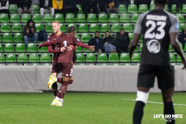 453 Soirée idéale en N2 pour le FC Metz ! Solides en défense et efficaces offensivement, les Grenats disposent logiquement de Sainte-Geneviève, un succès qui leur permet d’entrer dans la première moitié de tableau. Au coup d’envoi de cette onzième journée du championnat de National 2, la composition messine était inhabituelle : David Oberhauser vivait sa première titularisation de la saison à domicile, Warren Tchimbembé et Amine Bassi devaient animer le milieu de terrain, et la ligne offensive était inédite, Cheikh Sabaly et le jeune Williams Mazie encadraient Lenny Joseph, remis de ses récents pépins physiques. Durant vingt minutes, on sentait d’ailleurs que les joueurs se cherchaient un peu sur le terrain : le jeu collectif attendrait, il fallait d’abord répondre au défi physique de l’adversaire. Tchimbembé était le premier à sonner la charge : sur un service en retrait, il plaçait une frappe enroulée qui contraignait le gardien à une belle envolée. Quelques instants plus tard, à la suite d’un corner, un centre en cloche s’orientait vers le point de pénalty. Doté d’une détente et d’une suspension remarquables, Lenny Joseph est souvent dangereux dans cette zone, et une nouvelle fois il le démontrait en s’élevant plus haut que tout le monde et en propulsant le ballon dans le but (1-0, 22e). Si les coéquipiers du capitaine Amadou Mbengue maîtrisaient leur sujet, ils peinaient toutefois à se procurer des occasions nettes. La seule véritable tentative, une frappe en force de Bassi, finissait ainsi sa course dans les gants du gardien. On semblait se diriger tranquillement vers la mi-temps quand un cafouillage dans la défense messine faillit relancer le match : un attaquant génovéfain était crocheté dans la surface et offrait un pénalty au SGS. Heureusement pour les locaux, Oberhauser célébrait son retour à Saint-Symphorien avec un arrêt en deux temps devant Ipiélé. N2 : Le FC Metz douche les ardeurs de Sainte-Geneviève Après la pause, les Essonniens repartaient avec des intentions plus affirmées. Ils se livraient davantage dans leurs actions et, en contrepartie, libéraient des espaces dont les Grenats tentaient de profiter. Oberhauser s’employait d’abord en claquant un tir lobé au-dessus de son but, puis il s’en remettait à la chance quand un attaquant perçait plein axe, le dépassait mais voyait son ballon venir heurter la base du poteau. Comme lors du premier acte, les Messins réagissaient en deux temps. À la réception d’une touche de Zilliox, Mazie se frayait un passage entre les défenseurs franciliens et décochait une frappe puissante qui frôlait le cadre. Et, sur la relance adverse, Sabaly était lancé à droite, il centrait vers Joseph et le ballon aboutissait finalement à Mikelbrencis qui pouvait conclure de près (2-0, 62e). Le match perdait ensuite en intensité. Les visiteurs ne paraissaient plus croire en leurs chances, leurs velléités offensives échouaient systématiquement sur Danley ou sur la charnière Mbengue-Lacroix, et les contre-attaques messines étaient trop imprécises pour être réellement dangereuses. Dans les arrêts de jeu, la dernière occasion, consécutive à un corner, revenait à Sainte-Geneviève avec une tête au-dessus de la barre. Avec ce succès, les jeunes Grenats confirment leur début de saison très encourageant et pointent désormais à la septième place du groupe. Lors de la prochaine journée, ils iront défier la réserve du Stade de Reims, qui les devance de trois points au classement. La galerie du match Crédit Photo : Julien Buret/LGM