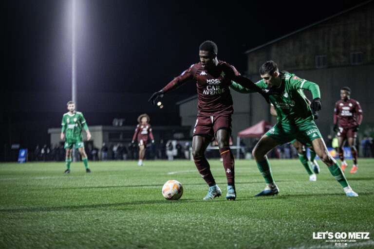 459 Une semaine après leur victoire contre Besançon en infériorité numérique, les Grenats se sont de nouveau retrouvés à dix. Le FC Metz s’incline cette fois-ci contre le SR Colmar (0-1). Le FC Metz commençait mieux le match que son adversaire, sans toutefois se montrer véritablement dangereux : une reprise d’Ahile sur un centre d’Ourega était contrée ; Zilliox manquait le cadre ; et Mazie ne faisait pas mieux alors que Douane l’avait intelligemment démarqué au premier poteau sur un corner. La pression s’accentuait ensuite avec une belle combinaison entre Bouhouch et Mazie, qui s’achevait par une chute de Bokele dans la surface… sanctionnée d’un carton jaune pour simulation. Sur l’action suivante, Douane glissait le ballon à Raillot aux vingt mètres : le tir au sol du milieu grenat laissait le portier haut-rhinois sans réaction, mais heurtait l’extérieur du poteau. La défense locale, qui avait repoussé assez facilement les contres adverses, se trouait sur une nouvelle tentative alsacienne. Une frappe en force trouvait Mirbach sur sa trajectoire, puis ses coéquipiers parvenaient à éloigner définitivement le danger. Le match avait failli basculer contre le cours du jeu. Le FC Metz pénalisé par une erreur de jeunesse Les Grenats ne retenaient pas la leçon. Au retour des vestiaires, ils reprenaient leur domination et laissaient un peu trop d’espace pour des contre-attaques. Sur la première d’entre elles, un Vert plaçait un appel entre Kelo et Kebe, et celui-ci commettait une faute acrobatique et peu utile qui lui valait une expulsion immédiate (57e). Pendant cinq minutes, les Colmariens multipliaient alors les centres et les tirs, tous repoussés par l’arrière-garde remaniée du FC Metz. La partie s’équilibrait de nouveau et les Messins reprenaient même le contrôle du jeu ; pourtant, sur un ballon perdu bêtement, l’équipe se trouvait désorganisée, le décalage était fait, et un centre amenait l’ouverture du score des visiteurs (0-1, 72e). Ne se décourageant pas, les joueurs de Sylvain Marchal tentaient d’exploiter les quelques balles offensives concédées par un adversaire qui ne jouait plus. Une reprise de Bokele sur un centre de Zilliox était ainsi contrée in extremis. Dans des arrêts de jeu interminables, on était même tout près de revivre le scénario du match précédent. Ahile échappait à la charnière alsacienne, il filait vers le but et était victime d’une faute juste à l’entrée de la surface. Le défenseur était exclu, mais le coup franc ne donnait rien : cette fois, les Grenats ne reviendraient pas. Composition du FC Metz : Mirbach, Bouhouch, Kelo, Kebe (cap.), Zilliox, Raillot, Tanguy Ahile (Bahri, 56e), Douane (Lohei, 58e), Ourega (Belatrache, 80e), Mazie (Théo Ahile, 80e), BokeleLe classement du Groupe B de National 2 Crédit photo : Lucas Deslangles/LGM