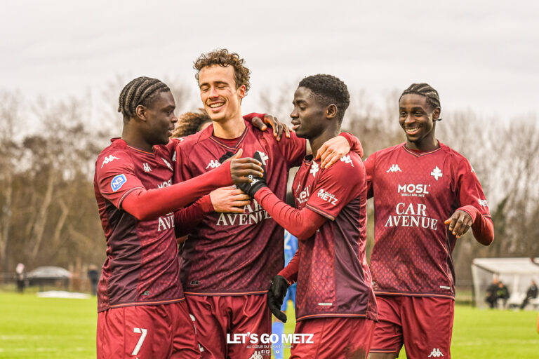 5,3K Les jeunes du FC Metz ont maîtrisé leur sujet ce dimanche après-midi contre l’US Raon. Une victoire 3-0 tranquille sur le terrain de Frescaty qui permet aux protégés de Sylvain Marchal de se donner de l’air. Les Grenats remontent à la 8e place de leur poule de National 3. Troisième victoire en quatre matchs pour des Grenats qui construisent une série d’invincibilité. Depuis la claque reçue à Prix-les-Mézières (4-0), les joueurs de Sylvain Marchal sont en mission. Contre l’US Raon, un adversaire direct pour le maintien, le FC Metz n’a pas fait dans le détail. Une victoire 3-0 qui s’est surtout dessinée en première période. Une maîtrise totale Dans cette froide après-midi, le FC Metz donnait le ton, et Raon souffrait. Après une jolie combinaison, Ibou Sané mettait déjà à contribution Alexandre Nagor (2e), puis voyait sa tentative contrée sur une remise de Bokele (7e). Tanguy Ahile s’essayait aussi, mais lui aussi se faisait contrer par la défense raonnaise (9e). Rien n’allait pour les Vosgiens, puisque Antonio Haag sortait sur blessure, durement touché au genou et évacué sur civière (12e), et concédait rapidement l’ouverture du score messine. Sur un corner tiré par Bokele, Divialle-Corbière s’y reprenait de la tête, par deux fois, pour ouvrir la marque, malgré une première intervention de Nagor (15e, 1-0). Le FC Metz continuait d’appuyer sur des Vosgiens fébriles et en manque de confiance. Si Raon se procurait deux petites occasions, les Grenats avaient le contrôle total du match. Morgan Bokele, virevoltant sur son côté avec Ourega, rentrait sur son pied droit et Nagor repoussait en corner (29e). Le gardien vosgien était impuissant sur la magnifique tête du capitaine Demouchy au premier poteau, sur le corner de Bokele (29e, 2-0). Les débats s’équilibraient avec plusieurs situations pour les Raonnais, qui ne parvenaient pas à inquiéter Marc-Aurèle Caillard. 2-0 à la mi-temps, Metz a fait le travail. Sané buteur, El Foukhari expulsé En deuxième période, l’US Raon revenait avec d’autres intentions, et mettait en difficulté la défense du FC Metz. Après une faute d’El Foukhari, le ballon restait longtemps dans les 5 mètres messins qui ne parvenaient pas à se dégager. Caillard sortait le grand jeu sur la frappe de Djibril Coulibaly (48e). Metz montrait le bout de son nez avec une frappe contrée de Machine (50e) puis Sané pensait marquer le 3-0, mais était logiquement signalé hors jeu (52e). Ce n’était que partie remise. Accroché dans la surface, le Sénégalais n’a pas tremblé et transformait parfaitement son pénalty (3-0, 54e). A l’heure de jeu, Raon était réduit à dix après l’exclusion de Reda Tahar. Le match était joué, et les Grenats géraient plutôt leur avantage. Metz se retrouvait aussi à dix après le deuxième jaune d’El Foukhari (86e). Raon se procurait deux dernières situations, mais Caillard était intraitable ce dimanche. D’abord sur Duminy, puis sur un coup franc. Une après-midi quasi parfaite pour les jeunes de Sylvain Marchal. La feuille de matchFC Metz : Caillard – El Foukhari, Hiessler, Divialle-Corbière, Ourega – Demouchy, Nduquidi (Melis, 78e), Ahile – Machine (Nicolas, 87e), Bokele (Lohei, 78e), Sané (Jeanne, 87e).Les buteurs : Divialle-Corbière (15e), Demouchy (29e), Sané (54e, pén.)Avertissements : El Foukhari (48e, 86e)Expulsion : El Foukhari (86e) US Raon : Nagor – Cissé, Foungala, N’Guessan, Haag (Khenchoul, 12e) – Morel, Lavri (Savran, 70e), Tahar – Coulibaly (Job, 87e), Diakhon (Stoquert, 87e), DuminyAvertissements : N’Guessan (45e), Khenchoul (56e), Tahar (63e, 66e), Touileb (Coach, 66e).Expulsion : Tahar (66e) Le classement de la Poule I du National 3.Crédit photo : Mikaël Frank / Let’s Go Metz