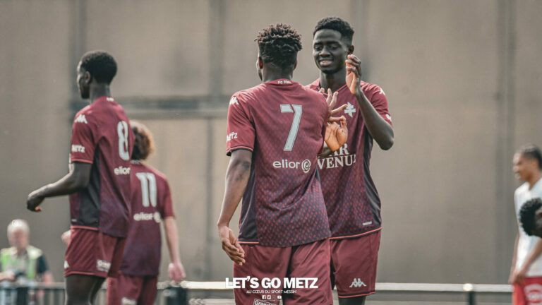 3,7K Le FC Metz était plus fort que l’AS Nancy Lorraine ce dimanche en National 3 (N3). Solidaires et efficaces, les joueurs de Sylvain Marchal remportent le derby lorrain (2-0) et se donnent de l’air au classement. Plusieurs professionnels, Nduquidi, Mbaye, Camara et Sané, venaient renforcer la réserve du FC Metz pour cette opposition face à l’AS Nancy Lorraine. Pourtant, ils étaient peu trouvés par leurs équipiers et la défense grenat était sous pression dans les premières minutes. Les joueurs au Chardon faisaient parler leur technique et leur jeu collectif pour se procurer des occasions particulièrement dangereuses : un ballon récupéré dans le dos des défenseurs était propulsé sur la barre ; un centre coupé devant Pausé passait juste au-dessus du but ; un centre-tir fuyant était détourné en corner. Il fallait attendre la 25e minute pour voir les locaux construire une belle action. Camara trouvait l’ouverture pour El Foukhari dont la passe était remise en retrait par Sané à Camara. Le tir puissant du Sénégalais frôlait le cadre. Ce n’était que partie remise. Bahri provoquait sur le côté gauche, il résistait à la charge de deux adversaires puis décalait Mbaye à droite. L’ailier grenat centrait instantanément vers Sané dont la tête smashée était imparable (1-0, 29e). Nancy était groggy et se compliquait encore plus la tâche dans les minutes suivantes. Après un bon débordement, El Foukhari était tout heureux de voir son centre lobé échapper aux gants de Giagnorio et terminer dans le but (2-0, 37e). Un derby remporté sans trembler par le FC Metz Lors du second acte, le jeu se concentrait au milieu du terrain et peu d’occasions se présentaient. Les visiteurs expédiaient quelques frappes lointaines au-dessus de la barre, auxquelles Camara répondait sans plus de réussite. Son coup franc en revanche était très bien botté, mais Giagnorio le claquait en corner. Sans la maladresse des attaquants nancéiens, une perte de balle en défense aurait pu relancer le match. Au contraire, les Messins géraient leur avantage et ne concédaient qu’une ultime situation périlleuse dans les arrêts de jeu : Pausé repoussait une tentative en force trop centrale pour être véritablement dangereuse. Dans un championnat très serré où chaque point compte, cette victoire permet au FC Metz de s’éloigner des trois dernières places et de se mêler à un groupe de six équipes se tenant en trois points : de quoi aborder la dernière ligne droite avec confiance. Composition du FC Metz : Pausé – El Foukhari, Hiessler, Divialle Corbière, Ourega (Lohei, 76e) – Demouchy, Nduquidi, Camara – Mbaye (Danhach, 71e), Sané, Bahri (Ahile, 58e) Les buts messins : Ibou Sané (29e), Giagnorio (csc, 37e) Crédit photo : Mikaël Frank /LGM