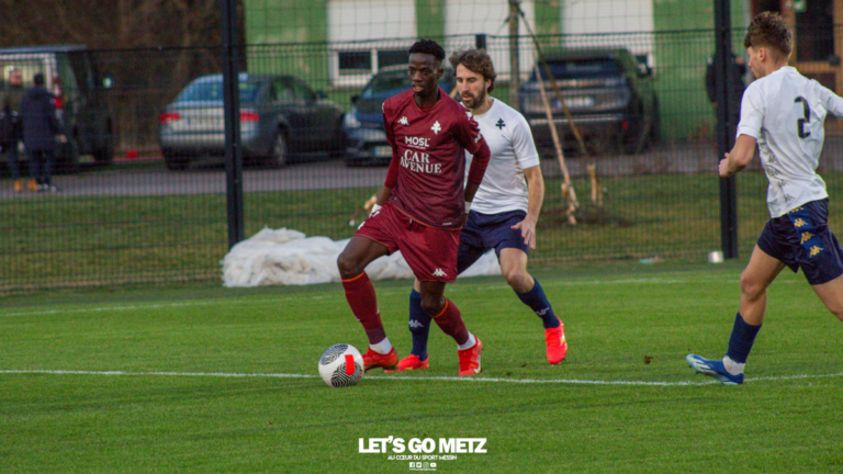 2,5K N3- Face à Belfort, un adversaire largement à sa portée, le FC Metz s’est fait des frayeurs et a finalement été heureux de ne pas perdre. Bien relancé par une victoire contre Raon-l’Étape, le FC Metz avait l’occasion de se donner de l’air en accueillant l’ASM Belfort. Pourtant la première demi-heure n’offrait rien de probant, les visiteurs ne montrant rien, et les locaux ne cadrant pas, ni par Bokele (5e), ni par Ahile (32e), ni par Marchal idéalement placé (38e). Cette dernière action illustrait cependant la pression croissante que les Messins imposaient à leurs adversaires. Un déboulé de Sané à la lutte avec un défenseur amenait une déviation en corner de Guillaume, le portier belfortain (40e). Sané croisait ensuite trop sa tête sur un centre venu de loin (41e), puis, lancé dans la profondeur, il perdait son duel face à Guillaume (44e). Un FC Metz à réaction Les joueurs de Sylvain Marchal retombaient dans leurs travers à l’entame de la seconde période. Son fils Noam manquait le cadre (50e), puis les tentatives de loin d’Ahile suivaient la même direction (55e, 59e). Dans la foulée, sur sa première véritable occasion, l’ASM Belfort ouvrait la marque (0-1, 60e). Heureusement pour les Messins, Bokele percutait, était séché dans la surface et permettait à Sané d’égaliser sur pénalty (1-1, 64e). La bataille faisait rage au milieu pendant quelques minutes, puis les visiteurs reprenaient l’avantage d’un tir de près du plat du pied (1-2, 77e). Les Grenats ne se décourageaient pas et, sur un corner botté par Diallo, Sané se montrait le plus habile dans une partie de billard au milieu de la surface de réparation : il trompait Guillaume de près et permettait aux siens de laisser derrière eux un adversaire direct (2-2, 84e). Composition du FC Metz : Caillard – Nicolas, Hiessler (Machine, 85e), Divialle Corbière, Ourega – Demouchy, Marchal, Ahile – Diallo (Lohei, 89e), Sané, Bokele Crédit photos : Léni Audin/LGM