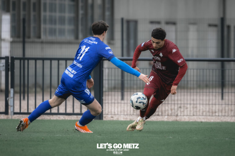1,3K Au terme d’une partie maîtrisée, les Grenats l’emportent sur l’ASM Belfort (2-0) et s’éloignent de la zone rouge. Après des semaines difficiles, les joueurs de Christophe Delmotte avaient brillamment renoué avec la victoire à Raon-l’Étape (4-5) et ils espéraient enchaîner en accueillant un adversaire qui les devançait de peu au classement. Les premières minutes étaient encourageantes, avec une possession de balle élevée et plusieurs situations dangereuses : une infiltration et une frappe en force de Guerti détournée en corner (3e), une reprise de Manquant au point de pénalty qui frôlait le cadre (13e), une tête du même Manquant mal contrôlée (17e). L’attaquant messin mettait encore la défense belfortaine en difficulté quand sa tentative était contrée, mais Guerti avait suivi et remisait sur Mélières qui trompait le gardien en deux temps (1-0, 19e). Juste avant l’ouverture du score, les visiteurs auraient pu prendre l’avantage : un sauvetage sur la ligne et un dégagement en catastrophe de Nduquidi avaient permis au FC Metz d’éviter de concéder un but sur la première véritable occasion adverse. Les deux équipes se neutralisaient ensuite au milieu du terrain. Belfort manquait le cadre de loin (35e) comme de près (43e), et Poillion effectuait le geste juste quand le danger se rapprochait (25e). Le FC Metz tue rapidement le match Au retour des vestiaires, Belfort cherchait à refaire son retard, mais était immédiatement contré : après une remontée de balle de Melis et une passe de Mélières, Manquant ajustait le portier adverse pour doubler la mise (2-0, 48e). Sereins, les Grenats reprenaient leur domination : un centre de Mélières était intercepté in extremis (50e) ; un tir de Duarte tutoyait le montant droit de Guillaume (56e) ; une belle remontée de balle de Manquant permettait à Guerti de s’offrir un duel, mais le ballon terminait en corner (62e) ; et Joseph Nduquidi, après un relais de Gnemagnon, plaçait une frappe surpuissante qui heurtait le bas de la barre transversale avant de rebondir devant la ligne de but (77e). La réaction de Belfort était trop tardive avec deux actions aussi confuses qu’infructueuses dans la surface messine (92e, 93e). Avec cette victoire, le FC Metz glane des points précieux, dépasse son adversaire du jour et, même si cela reste extrêmement serré puisque sept équipes se tiennent en cinq points, prend un peu d’avance sur le premier relégable. FC Metz 2 – ASM Belfort : 2-0 Buts : Mélières (19e), Manquant (48e) Composition du FC Metz : Poillion, Mélières (B. Nduquidi, 81e), Hiessler, Divialle Corbière, J. Nduquidi, Dos Santos, Bahri (cap.), Guerti, Melis (Kokoro, 81e), Manquant (Gnemagnon, 73e), Duarte (Lohei, 58e) Crédit photo : Julien Buret /LGM (archives)
