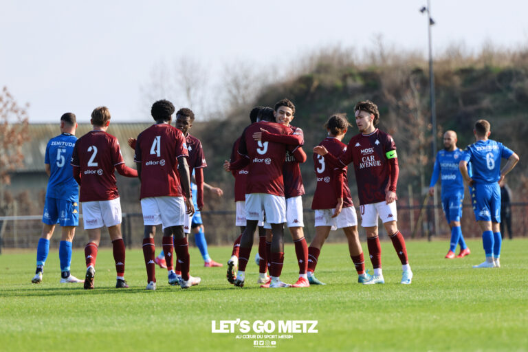 1,4K Face au Racing Besançon, leader du groupe avant cette journée, le FC Metz s’est battu, a souffert, mais remporte finalement une victoire très précieuse. Les Messins commençaient le match de la meilleure des manières : Bahri, décalé à gauche, dosait parfaitement sa passe pour Joseph Mangondo, et le néo-professionnel crucifiait le portier bisontin pour ouvrir la marque (1-0, 2e). Les Grenats avaient été bien inspirés de prendre de l’avance, car la suite était particulièrement difficile. Besançon impressionnait par son jeu de passes courtes, tout en mouvement, de dédoublements et de combinaisons. Dans le but messin, Luca Pausé devait faire des miracles pour que son équipe conserve l’avantage : il bloquait d’abord une tentative manquant de force (4e) ; se couchait promptement sur une autre (8e) ; remportait brillamment un duel face à Hattab (15e) ; repoussait un tir à bout portant (27e) ; déviait en corner une frappe puissante qui prenait la direction de son petit filet (29e). Joseph Mangondo a marqué les deux buts de la rencontre. Photo : Stephan Weyrath/LGM. Les joueurs de Christophe Delmotte pliaient mais ne rompaient pas ; mieux, ils tentaient de placer quelques contre-attaques. Un tir de Sané était arrêté (30e) et, sur l’action suivante, le Sénégalais était contré et Bahri fouettait le ballon qui traînait à l’entrée de la surface, sans succès (31e). La troisième tentative était la bonne : un long dégagement de Divialle Corbière trouvait Mangondo qui filait battre Pillot (2-0, 32e). Juste avant la pause, c’est Benjamin Nduquidi qui, d’un tacle rageur, empêchait Hattab de se présenter seul face à Pausé. Bien que dominés, les Messins étaient tout heureux de rentrer aux vestiaires nantis de deux buts d’avance. Le Racing Besançon ne tient pas le rythme Les Grenats s’apprêtaient à souffrir encore durant le second acte. En réalité, le rythme était moins enlevé, les Bisontins extériorisaient de plus en plus leur frustration et commettaient davantage d’erreurs techniques. Le jeu était plus équilibré, à une frappe non cadrée de Bahri (52e) répondaient de dangereuses balles en profondeur sur lesquelles Pausé anticipait bien (54e, 57e). Finalement, les Doubistes étaient tenus à distance du but messin et leurs tirs de loin restaient sans danger (80e, 95e). FC Metz 2 – Racing Besançon : 2-0 Buts : Mangondo (2e, 32e) Composition du FC Metz : Pausé, Mélières (Lohei, 66e), Hiessler, B. Nduquidi, Divialle Corbière, Dos Santos, Touré, Guerti, Bahri (Duarte, 77e), Mangondo (Namatane, 77e), Sané (Mladjao, 65e). Photo : Stephan Weyrath/LGM.