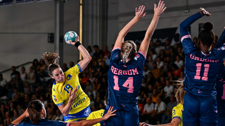547 Ce samedi, Metz Handball se déplaçait dans la salle des Neptunes de Nantes pour le choc de la 7e journée. Après un second acte maîtrisé, l’équipe d’Emmanuel Mayonnade ramène la victoire en Moselle, juste avant la pause internationale (25-34). Il y a des dates qu’on attend un peu tous. Celle de cette confrontation entre Metz Handball et les Neptunes de Nantes en faisait indéniablement partie. Avec des parcours quasiment similaires et un scoring assez élevé sur les tableaux d’affichage de France et de Navarre, les deux équipes devaient jauger leur niveau dans un choc européen du haut de tableau. Un match ô combien important pour la course au titre qui voit l’apparition d’un 3e candidat sur le papier. Ce match était donc une première réponse même si les nouvelles coéquipières de Tamara Horacek avaient déjà perdu des points au profit des Brestoises. Mais une victoire de l’une ou de l’autre équipe lançait un message fort aux autres concurrents du championnat. Retard à l’allumage… Cette première période tenait toutes ses promesses même si Metz Handball était de nouveau mis en difficulté par le rapport physique des Neptunes de Nantes. Débutant en attaque, les Messines ne parvenaient pas à mettre l’impact nécessaire pour tromper Jessica Ryde, bien en place sur sa ligne de but. De l’autre coté, la défense ne parvenait pas à suivre les mouvements nantais qui trompaient facilement les championnes de France, à l’image d’Anna Lagerquist qui anticipait toutes les situations pour provoquer le jet de 7m. Durant ces premières minutes, les phases offensives messines étaient de surcroît hésitantes avec une Kristina Jørgensen moins inspirée qu’à l’accoutumé. Les duels nantais maintenaient Metz Handball à distance, ce qui déclenchait le premier temps-mort d’Emmanuel Mayonnade (6-3, 15′). Ce rappel à l’ordre permettait au camps messin de faire des changements au niveau de la base arrière avec l’entrée d’Alina Grijseels en lieu et place d’Anne Mette Hansen. Malgré la bonne coordination du bloc nantais, cette nouvelle organisation messine donnait un nouveau souffle aux coéquipières de Louise Burgaard. Dès lors, Camille Depuiset commençait à faire des parades et Metz sonnait la révolte avec un 6-0 pour mener de deux unités après avoir été malmené durant le premier quart d’heure. Avec ce temps fort lorrain, la physionomie du match allait être bien différente mais les Nantaises restaient accrocheuses. Elles repassaient même devant grâce à deux buts consécutifs de Carin Strömberg. Une lutte acharnée se dessinait alors dans les cinq dernières minutes. De fait, Messines et Nantaises retournaient aux vestiaires à égalité après un sauvetage in-extrémis de Camille Depuiset sur Oriane Ondono (14-14, 30′). … avant l’accélération Cette seconde période repartait de plus belle avec une première parade de la gardienne suédoise suivie d’un bon tir d’Emilie Bellec. Ce fut le dernier temps fort des Ligériennes. Les Messines montaient en intensité, Nantes déjouait et Metz pouvait dérouler sur grand espace avec les parades de Hatadou Sako qui prenait l’ascendant sur la moindre tentative. Pourtant, le génie de la virevoltante Léna Grandveau maintenait les locales à flot. Insuffisant face au rouleau compresseur messin. D’autant plus lorsque Kristina Jørgensen retrouvait sa réussite habituelle. Les fixations de Chloé Valentini et une Sarah Bouktit toujours impériale dans le secteur central finissaient le travail. Dès lors, le duel prenait une toute autre dimension pour les Dragonnes qui ne cessaient d’augmenter leur avance tandis que Tamara Horacek et les siennes restaient muettes depuis leur vingtième but (20-26, 46′). À ce moment de la partie, la rencontre était bien à sens unique en faveur de Metz Handball malgré un petit sursaut d’orgueil des Neptunes de Nantes qui revenaient à quatre longueurs, 6 minutes avant la fin de la rencontre. Cependant, les Championnes de France ne laissaient aucun espoir à leurs adversaires du soir pour enregistrer un 7e succès de rang, le 62e depuis 2021. Statistiques de la rencontre Neptunes de Nantes : Jessica Ryde (9 parades sur 30), Floriane André (2/13). Helene Fauske (3 buts en 6 tentatives), Carin Stromberg (2/3), Oriane Ondono (4/8), Floriane André, Mari Finstad Bergum, Naémi Ardouin (0/1), Marine Dupuis (0/2), Anna Lagerquist (2/2), Orlane Ahanda (2/3), Tamara Horacek (5/8), Léna Grandveau 3/5), Kelly Vollebregt (3/4), Emilie Bellec (1/3). Metz Handball : Camille Depuiset (7 parades sur 21 tirs), Hatadou Sako (7/18 et 1 but). Alina Grijseels (3 buts en 3 tentatives), Chloé Valentini (7/8), Anne Mette Hansen (0/1), Kristina Jorgensen (6/12), Mia Brkic, Louise Burgaard (4/6), Zaliata Mlamali, Emma Jacques (2/3), Sarah Bouktit (9/11), Lucie Granier (1/3), Djazz Chambertin (1/1), Julie Le Blevec. Crédit photo : Baptiste Fernandez/Icon Sport