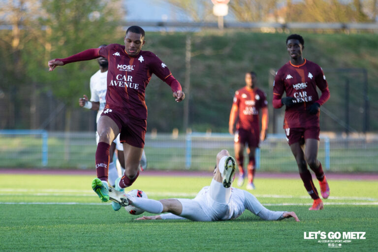 381 La réserve du FC Metz, en panne depuis des semaines, accueillait l’ASM Belfort FC avec l’obligation de l’emporter pour se redonner un peu d’air au classement. Ils ont échoué (0-1) et se trouvent désormais en bien mauvaise posture. Après une première moitié de championnat convaincante, les joueurs de Stéphane Saillant ont lentement reculé au classement. Ils ne possédaient au coup d’envoi qu’un point d’avance sur leur adversaire du jour, premier relégable. Une certaine crispation se faisait d’ailleurs sentir, après de nombreuses mauvaises opérations. Les Belfortains se procuraient coup sur coup deux occasions. Un contre manquait de profiter à un joueur démarqué au second poteau, puis un centre était mal contrôlé par Ba et repris par un attaquant, contré avec chance par Mbengue. Les Grenats perdaient beaucoup de duels, faisaient le dos rond, se rassuraient progressivement et prenaient enfin l’initiative dans le jeu. Une remontée de balle de Mazie permettait à Mikelbrencis de trouver Daoud ; idéalement placé, l’attaquant ouvrait trop son pied. Le même Mazie lançait ensuite Joseph et trompait le gardien mais était signalé hors-jeu. Quelques instants plus tard, Marc-Antoine Guillaume, le portier belfortain, s’imposait devant Daoud puis Jean-Jacques. Le temps fort messin se poursuivait avec un slalom du capitaine Benigni entre trois adversaires : son tir enroulé frôlait la base du poteau. Daoud héritait d’une nouvelle occasion, bien décalé par Benigni, il frappait au-dessus de la barre. Juste avant la pause, quand enfin il réalisait une magnifique reprise de volée qui se logeait dans la lucarne, son but était invalidé pour un nouveau hors-jeu. Comble de malchance, dans la foulée Belfort contrait et ouvrait la marque (0-1, 46e). La réserve du FC Metz volontaire mais inoffensive Au retour des vestiaires, on sentait les Grenats agacés par le scénario du premier acte et désireux de revenir rapidement au score. Pourtant ils peinaient à créer du danger. Nduquidi prenait le meilleur sur deux Belfortains à gauche, passait à Daoud. Mais une fois de plus, la frappe manquait de peu le cadre. Benigni, lui, voyait son essai repoussé par Guillaume. Peu après, Daoud maîtrisait mal un centre et expédiait sa tête loin du but. Cela restait bien maigre pour trente minutes du jeu. Belfort jouait bas, défendait en bloc et faisait s’écouler le temps sans rencontrer de réels problèmes. Mikelbrencis montait de plus en plus, un de ses centres filait entre les jambes de Joseph dans les six mètres. Les Grenats occupaient le camp adverse et, sur une perte de balle, un attaquant filait seul vers Ousmane Ba. Le portier sénégalais remportait joliment le duel. Sur l’action suivante, l’arbitre sifflait un pénalty pour une faute très évitable dans la surface : Ba partait du bon côté et voyait le tir repoussé par son poteau (90e). Le score n’était pas aggravé, mais l’unique but suffisait au bonheur des Belfortains. La réserve du FC Metz, elle, ne dispose désormais plus que de six matchs pour essayer de sauver sa place en National 2. Crédit photo : Julien Buret/LGM