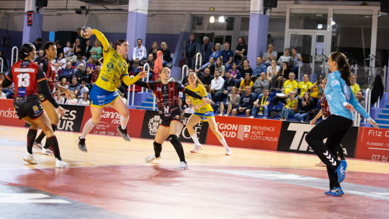 694 Metz Handball se déplaçait sur le terrain de l’OGC Nice à quelques journées de la fin de saison. L’occasion de retrouvailles avec plusieurs personnalités formées à Metz. Si certains des derniers matchs de la saison de Metz Handball en Ligue Butagaz Energie ont perdu un peu de leur magie, suite au sacre rapide sur la scène nationale et à l’élimination européenne, le déplacement des Dragonnes en terres provençales a revêtu un intérêt quelque peu différent. Dans le cadre de cette opposition face aux Aiglonnes de Clément Alcacer, ex responsable de la formation messine, il s’agissait également de retrouvailles avec Laureen Dembele et Anne Emmanuelle Augustine, issues du centre de formation mosellan. Autre point de focus : Djazz Chambertin future messine, une nouvelle fois sélectionnée en Équipe de France pour le stage estival.Si le match aller avait rapidement échappé au contrôle des niçoises, alors en plein rodage (5 défaites de rang), l’équipe avait ensuite pris un virage remarquable avec des victoires de prestige et des matchs accrochés contre des « gros » du championnat. La rencontre débutait sur un faux rythme. Entre tirs manqués, arrêts et pertes de balles, les deux équipes restaient au coude à coude pendant de longues minutes. Ce n’est qu’à la dixième minute que deux buts de Debbie Bont, entrecoupés d’un arrêt d’Hatadou Sako, permettaient à Metz Handball de créer un premier break solide (6 – 9, 11ème). Aidées par une solide prestation de Marija Colic, les niçoises s’accrochaient à la rencontre. Les échanges, faussés par plusieurs suspensions pour 2 minutes et des successions de jets de 7 mètres, se poursuivaient jusqu’à la mi-temps en faveur des visiteuses. Score à la mi-temps : 13 – 17 À la reprise, le match s’avérait aussi troublé. Si Chloé Valentini ouvrait la marque, les minutes suivantes témoignaient d’une forte activité arbitrale. Jet de 7 mètres, deux minutes, passage en force… autant de situations qui faisaient progressivement sortir Nice du match et tendaient les échanges (16 – 23, 41ème). Les temps morts successifs (39ème, 43ème) ne suffisaient pas à Clément Alcacer pour relancer les Aiglonnes mais contribuaient à une meilleure résistance. En effet, Djazz Chambertin et ses coéquipières parvenaient à plusieurs reprises à stopper les remontées de balle rapide des Dragonnes pour s’offrir des situations supplémentaires en attaque, sans parvenir à convertir pour autant. Derrière la réussite de Kristina Jorgensen, l’avantage au tableau d’affichage offrait à Emmanuel Mayonnade l’opportunité d’ouvrir son banc et d’offrir d’avantage de temps de jeu à Noémie Barthelemy, Julie le Blevec, Stelvia Pascoal, Emma Jacques ou encore Camille Depuiset. Toutes en réussite à leur manière pour porter l’avantage jusqu’à 17 buts. Un score sévère pour les niçoises, pourtant combatives au fil du match mais particulièrement mises en difficulté face au but. Score final de cet OGC Nice – Metz Handball : 20 – 37 La galerie de la rencontre Les stats de la rencontre Metz HandballSako (9 parades sur 22 tirs), Depuiset (2/8)de Paula (1 buts sur 3 tirs), Valentini (5/5), Jorgensen (10/12), Horacek (4/5), Bont (3/4), Kanor (3/5), Jacques (2/3), Pascoal (1/2), Bouktit (3/7), Barthelemy (1/1), Maslova (2/3), Le Blevec (2/2) OGC NiceColic (10 parades sur 42 tirs, 1 but sur 2 tirs), Micevska (1/5), SamzunSy (3 buts sur 4 tirs), Chambertin (2/6), Augustine (2/2), Prouvensier (2/7), Holejova (2/4), Diawara, Fall (0/2), L. Dembele (2/4), Von Pereira (3/8), Semedo Monteiro (3/4), M. Le Blevec (0/1)
