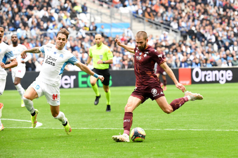 662 En tenant l’OM en échec au Vélodrome, le FC Metz a redonné espoir à ses supporters. Désormais bons derniers de ligue 1, les grenats peuvent cependant nourrir des regrets. Qui n’a plus d’espoir n’aura plus de regrets. Et ce n’est pas le cas des Messins ce lundi au lendemain du match nul obtenu au stade Vélodrome. Face à un OM en manque d’inspiration, le FC Metz a pris, non sans mal, le point du match nul. Si les Olympiens ont littéralement privé les grenats de ballons (77% de possession pour les Marseillais), il s’en est fallu d’un rien pour que les hommes de Frédéric Antonetti ne créent la surprise. Le braquage n’a échoué qu’à la faveur des montants du but de Steve Mandanda, mais également d’un manque criant de sang froid dans le dernier geste. L’envolée de Dylan Bronn – Photo by Johnny Fidelin/Icon Sport Que d’occasions… C’est tout le paradoxe de cette rencontre. Les grenats auraient pu largement revenir avec les trois points. Malgré des statistiques particulièrement désastreuses (177 passes effectuées contre 632 pour l’OM), les joueurs du FC Metz se sont créés les plus belles opportunités du match. En témoignent les deux frappes sur le poteau de Thomas Delaine ou le but refusé pour un hors-jeu de Kiki Kouyaté. Le retour en grâce des deux pistons a fait très mal aux défenseurs marseillais. Mais il va falloir travailler la finition et mieux gérer ses émotions devant les buts adverses si les grenats veulent se sortir de cette situation. Illustration parfaite avec Fabien Centonze coupable de n’avoir pas fait le bon choix devant le gardien numéro 3 de l’équipe de France en seconde mi-temps. Ou pire encore, la mésentente clownesque entre Lamine Gueye et Opa N’Guette, pourtant tous deux fraîchement entrés en jeu. Une solidarité défensive retrouvée C’est la bonne nouvelle du weekend. Le FC Metz réalise son premier clean sheet de la saison. Les signes avant coureur perçus face à Saint-Etienne étaient donc bien réels. Mais la défense messine ne s’en tire pas sans séquelles. Jemerson, nouvelle pièce maîtresse des remparts grenats, s’est fait exclure. On imagine sans mal qu’il sera suspendu au moins pour trois matchs, dont un avec sursis. Coup dur pour Frédéric Antonetti qui se réjouissait de pouvoir enfin procéder à des choix sportifs. Autre perte, celle de Matthieu Udol, entré en jeu pour seize minutes avant de ressortir sur blessure. Espérons que ce ne soit pas trop grave pour le natif de Metz. Farid Boulaya auteur d’une belle prestation et motif d’espoir pour la suite de la saison Derniers… La première victoire de la saison des Stéphanois vient gâcher les nombreux motifs d’espoir du peuple grenat. Désormais à une longueur des verts, le FC Metz pointe à la fatidique dernière place du championnat. La réception des Girondins de Bordeaux dans deux semaines s’avère déjà capitale. L’occasion idéale pour offrir au stade Saint Symphorien une victoire que les supporters attendent patiemment depuis de longs mois. Il ne reste plus qu’à espérer que la trêve internationale soit bénéfique et que les joueurs du club à la Croix de Lorraine soient prêts à repartir à la guerre. Car désormais, chaque match sera une bataille à gagner pour espérer sortir de la zone rouge. Crédits photos : Johnny Fidelin/Icon Sport – Anthony Bibard/FEP/Icon Sport