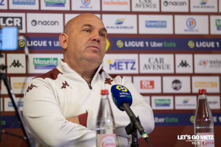 564 Le FC Metz se déplacera ce samedi sur la pelouse du Parc des Princes. Lors d’une ultime journée de championnat qui promet de livrer toutes ses surprises, le club à La Croix de Lorraine pourrait être barragiste à son issue. Frédéric Antonetti s’est exprimé face à la presse ce jeudi afin d’aborder cette rencontre. Après la victoire acquise aux dépens du SCO d’Angers, et à la lueur d’un résultat défavorable de Saint-Étienne face à Reims, le FC Metz a récupéré la 18e place, synonyme de barrage. Avec une série de 2 victoires à domicile en autant de matchs, l’espoir est désormais permis. Le technicien messin a déclaré n’avoir pas changé grand chose, si ce n’est avoir recherché plus de justesse à l’entraînement. Après avoir desserré la vis au sein de son groupe, il ne fait aucun doute que les résultats ont changé ces derniers temps. Quoi qu’il en soit, cette équipe semble avoir pris la pleine mesure de son potentiel. Et ce peut-être un peu tard, de quoi nourrir des regrets samedi ? « Il faut faire notre match, donner une bonne image et ne pas avoir l’oreille aux autres matchs. Dans le contenu, on mérite d’être en première division, à voir si l’on va y arriver. Car malgré tout ce qui nous est arrivé, on mérite d’y être. »Frédéric Antonetti Il s’agira selon les mots de Frédéric Antonetti de « ne pas se mettre la pression », et de « bien défendre pour résister et essayer de poser problème quand cela sera possible ». Metz avec Pajot, Paris avec Mbappé De retour de suspension après avoir manque la réception d’Angers, Vincent Pajot va pouvoir tenir sa place contre le PSG. Nicolas De Préville fait en revanche le chemin inverse, puisqu’il sera suspendu pour le déplacement au Parc. Outre les blessés de longue date, le club à la Croix de Lorraine devrait être pratiquement au complet pour cette 38ème journée de Ligue 1.Côté PSG, on comptera logiquement sur Kylian Mbappé. Un temps incertain, le champion du monde français devrait être en mesure de tenir sa place. C’est en tout cas ce qu’annonce Le Parisien. Peut-être le dernier match du natif de Bondy sous les couleurs du PSG avant un football circus qui promet d’être mouvementé, concernant l’avenir de l’ancien monégasque. « Samedi soir, pendant FC Metz – Angers, j’ai eu l’impression d’être dans une grande ville de foot ! » Le coach grenat s’est attardé quelques instants sur l’ambiance qui a régné à Saint-Symphorien. D’après les supporters, il s’agissait probablement de la meilleure ambiance depuis longtemps. Et ce dernier n’a en aucun cas dit le contraire ! S’il a déclaré n’avoir « jamais vu le public comme il l’a été samedi soir » depuis ses 4 ans au club, il a reconnu que ce sont ces voix qui ont permis à l’équipe de se transcender. « Il manquait peut être 10%, et ce public les a donné », selon ses mots. « Le football est fait pour avoir des émotions »Frédéric Antonetti Le potentiel étant énorme à domicile en cas de bons résultats, il ne reste plus qu’à espérer avoir un dernier match à Saint-Symphorien cette saison. Quoi qu’il en soit, le parcage messin sera plein au Parc des Princes. En cas de victoire contre Paris, ou de défaite de Saint-Étienne, tout se jouera la semaine prochaine quand à un éventuel maintien. La parcage visiteurs sera d’ailleurs plein à craquer au Parc des Princes. Les 1000 places allouées aux supporters messins ont en effet été pourvues. Rendez-vous samedi soir, avec une vague grenat qui va déferler sur Paris ! Le groupe convoqué pour Paris SG – FC Metz #PSGFCM [ 𝔾𝕣𝕠𝕦𝕡𝕖 ]🔎 Les 2⃣1⃣ joueurs convoqués pour le déplacement au @PSG_inside sont présentés par @EauCarola.Carola, partageons le goût d'être ici 👉 https://t.co/eJKzQLPhfM pic.twitter.com/7IORKXfGwr— FC Metz ☨ (@FCMetz) May 20, 2022 Crédit photo : Julien Buret/LGM
