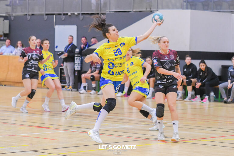 750 Metz Handball recevait les Piraths d’Achenheim Truchtersheim mercredi au complexe Saint-Symphorien dans le cadre de la Ligue Butagaz Energie. Le chaud et le froid, c’est ce qu’ont connu les Dragonnes de Metz Handball en seulement quelques jours. Passer de la chaleur des Arènes de Metz, remplies avec 4000 spectateurs bouillants, pour un beau match de Champions League, au complexe Saint Symphorien d’un soir d’automne pour un match de Ligue Butagaz Energie n’est pas forcément évident. Pourtant il ne fallait pas sous estimer les Piraths de la néo internationale française Dalila Abdesselam, de l’ex pensionnaire du centre de formation messin Eve Barlet, et de l’ex du pôle espoir messin Lilou Begon, venues faire parler la fougue du promu. Des visiteuses croquées comme un bretzel Le sept de départ messin : Depuiset – Valentini – Chambertin – Bouktit – Grijseels – Jacques – Granier.Après un tir manqué des alsaciennes, c’est Djazz Chambertin qui ouvrait la marque. Sur l’action suivante une passe au pivot ratée offrait à Lucie Granier une contre attaque rapide. Pourtant Dalila Abdesselam montrait son talent et permettait aux siennes de remonter au score. Le break se reformait néanmoins très vite et s’étendait même au gré des stops défensifs et interceptions. Metz Handball était lancé (9 – 3, 10ème). Le festival de Camille Depuiset et les jets de sept mètres de Kristina Jørgensen n’arrangeaient rien et la barre du +10 était franchie juste avant le quart d’heure de jeu via Djazz Chambertin (14-4, 15ème). Après de nombreuses percées de la sprinteuse locale Chloé Valentini, venait le temps des changements. Zaliata Mlamali, Mia Brkic, Julie le Blevec, Kristina Jørgensen et Anne Mette Hansen faisaient leur entrée simultanément (16-4, 19ème). Louise Burgaard ne tardait pas à les rejoindre alors que la marque continuait à croitre indépendamment du turnover (20 – 6, 25ème). L’exclusion pour deux minutes de Mia Brkic pour un excès défensif et la sortie temporaire de Anne Mette Hansen après une béquille ne changeaient pas réellement le scénario de la fin de première période. Les Dragonnes regagnaient les vestiaires avec quasiment un match gagné. Score à la mi-temps : 25 – 8 Un score sans appel La seconde mi-temps débutait sur un jet de sept mètres de la chirurgicale Kristina Jørgensen et la suspension pour deux minutes, quelques instants plus tard, de Nora Fontaine, après un excès d’engagement sur Emma Jacques, plongeait les visiteuses dans la détresse. Lilou Begon signait un but plein d’élégance en tirant dans son dos tout en étant bloquée par sa vis-à-vis, symbole du sursaut d’orgueil des siennes (28-12, 38ème). Mais le +20 messin venait malgré tout très vite par le bras de Chloé Valentini après plusieurs réalisations d’Emma Jacques (33 – 13, 41ème). Avec un jeu de plus en plus fouillis en raison du rythme imposé, les visiteuses laissaient toute la latitude aux Messines pour exprimer leur handball et la barre symbolique des 40 buts inscrits ne tardait pas à être franchie (40-14, 49ème). Avec match acquis, Metz Handball continuait son travail avec sérieux jusqu’à frôler le plus qu’inhabituel +30 à l’approche du coup de sifflet final, mais les Piraths, vaillantes malgré tout, ne rendaient pas leurs armes. Score final de ce match entre Metz Handball et Achenheim Truchtersheim : 46 – 18 En utilisant tout son effectif, à l’exception d’Hatadou Sako, Emmanuel Mayonnade s’est assuré, grâce à cette victoire sans appel, de donner le plein de confiance à chacune de ses Dragonnes. Il s’agira désormais de capitaliser sur cela pour réussir le déplacement chez le triple vainqueur de Champions League : Vipers Kristiansand. Les stats de la rencontre Metz HandballDepuiset (15 parades sur 33 tirs), SakoGrijseels (4 buts sur 4 tirs), Valentini (8/12), Hansen (2/2), Jorgensen (13/14), Brkic (3/3), Burgaard (2/2), Mlamali (1/3), Jacques (4/8), Bouktit (3/4), Granier (3/3), Chambertin (3/5), le Blevec (0/1). Strasbourg Achenheim TruchtersheimFargues (6 parades sur 24 tirs), Plee (7/35)Begon (3/7), de Sousa Loureiro (0/5), Demuth, Vlug (2/5), Abdesselam(1/7), Fontaine (2/3), Barlet (1/1), Plee, Fargues, Fanton (1/5), Muller, Imhof (3/6), Cvijic (5/7). Crédit photo : Mikaël Frank / LGM