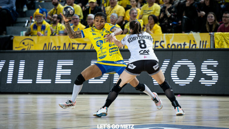 1,2K Quelques jours après une belle victoire de Metz Handball face à Brest au sein des Arènes de Metz, les deux équipes se retrouvaient à nouveau samedi à la Brest Arena pour déterminer le participant à la finale de Coupe de France. Ils auraient dû être nombreux à embarquer à bord du train spécial organisé par Metz Handball en direction de Brest pour reproduire le fameux mur jaune au sein de la Brest Arena et pousser les Dragonnes vers une nouvelle finale de Coupe de France. Malheureusement, entre participation moins importante qu’espérée, risque de grève et contraintes financières le projet n’a pas pu aboutir. Cela n’a pas empêché le rassemblement d’une centaine de supporters aux Arènes de Metz pour vivre le match de Coupe de France dans une belle ambiance. Nous avons suivi la rencontre avec eux. Au milieu des analyses d’avant match et des éclats de rires des premiers arrivés, tous semblaient satisfaits de l’évènement concocté par le club à la mirabelle. « Ce n’est pas la même chose que le voyage prévu à l’origine mais on se retrouve malgré tout pour vibrer, c’est le plus important ! ». Côté terrain, les choses démarraient de la meilleure des manières pour Metz Handball avec un 0-3 conclu par une interception et une contre attaque de l’exemplaire Bruna de Paula. Hélène Fauske lançait le match des siennes sur penalty mais le rouleau compresseur jaune et bleu ne freinait pas pour autant, porté par une Hatadou Sako aussi en forme que lors du match précédent et des conclusions éclair de Chloé Valentini.De quoi lancer et entretenir les chants et les applaudissements des supporters présents aux Arènes… comme s’ils y étaient. (2-7, 9ème) Le BBH rentrait finalement dans son match et profitait de quelques échecs messins pour refaire une partie de son retard, aidé par Aissatou Kouyaté, absente au match précédent. Pas de quoi inquiéter les Dragonnes pour autant. (5-9, 17ème). Une succession de suspensions pour deux minutes (Maslova, Bont) forçait Metz Handball à s’adapter pour la première fois du match (8-11, 24ème)Louise Burgaard remettait les pendules à l’heure mais Sarah Bouktit devait se résoudre à quitter les siennes à son tour pour deux minutes. Les Rebelles en profitaient pour revenir à deux buts (11-13 28ème) avant un dernier éclat jaune et bleu.Une première mi-temps plutôt au goût des supporters « c’est moins rapide qu’au match de mercredi. On sent que c’est une salle particulière à jouer mais les messines se sont facilité la vie avec un bon début de match » Score à la mi-temps : 11 – 14 Fin de match en roulement de tambour Le retour du vestiaire se muait en un duel de gardiennes : Julie Foggea et Hatadou Sako se répondaient par de précieux arrêts. Figeant quasiment le score pendant plusieurs minutes (12 – 15, 36ème)Alors que le jeu commençait à se durcir, Thibaut Pigeon le speaker du club présent à l’évènement ajoutait une couche de tambour pour faire bouger son mur jaune de téléspectateurs. L’euphorie et les décibels montaient d’un cran sur un nouveau but de Debbie Bont (14-18, 13ème). Une ambiance qui laissait très rapidement place au silence et à l’inquiétude alors que Bruna de Paula devait quitter le terrain, touchée à la jambe gauche sur une séquence offensive. Suivait une période compliquée offensivement pour les deux équipes mais Jenny Carlson finissait par briser l’apathie générale (18-21, 23ème) Rien ne semblait pourtant stopper la course en tête de Metz Handball, à l’image d’Alicia Toublanc s’avançant face à Camille Depuiset pour un jet de 7 mètres. « Si elle le sort le match est plié ! » peut on entendre parmi les supporters… Tir arrêté.Loin de ces considérations les Rebelles ne laissaient pas filer la rencontre pour autant et revenaient à 2 buts dans le money time, tout comme en première période. Elles profitaient même des derniers instants pour revenir à un but mais le sursaut d’orgueil s’avérait trop tardif. Score final de ce Brest – Metz Handball : 23 – 24 Un résultat plutôt satisfaisant pour un supporter présent « Les trains pour Paris devraient être plus faciles à trouver ! J’ai hâte de retrouver l’Accor Arena et de voir les Dragonnes soulever la Coupe de France une onzième fois ! »Pour cela, il faudra attendre le 10 juin… Quelques jours après un potentiel Final 4 Européen que pourront briguer les Dragonnes en cas de réussite en match aller/retour face au FTC Rail Cargo Hungaria. Les fans de Metz Handball n’ont pas fini de voyager ! Crédit photo : Lilian Bordron / LGM (archive) pour la une / Matthieu Henkinet pour les photos de la soirée et la vidéo