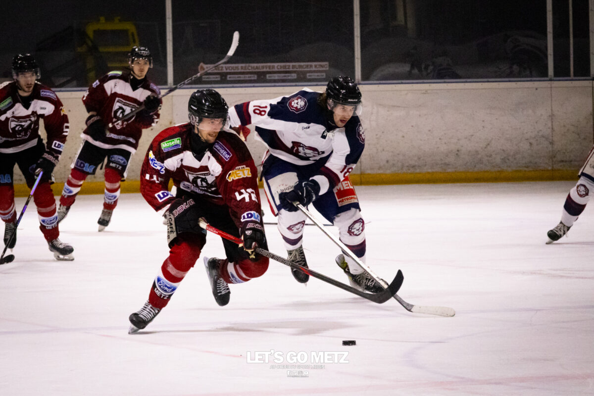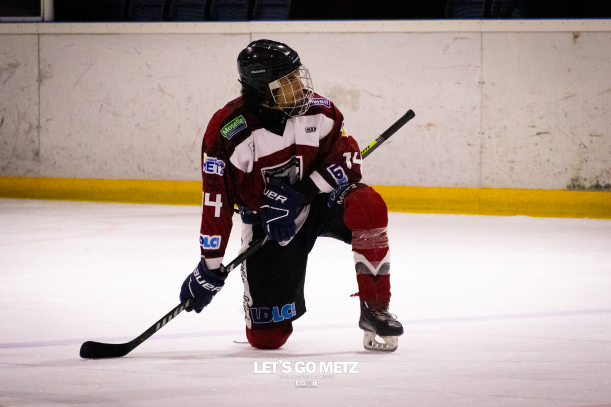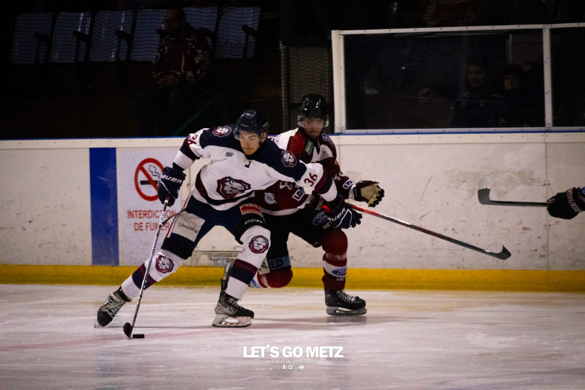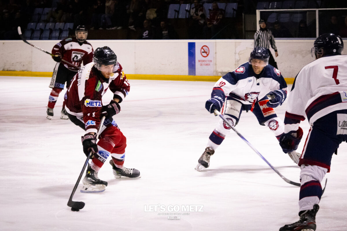 236 Le Metz Hockey Club s’est incliné (4-6) contre Wasquehal en quart de finale aller des playoffs de D3. Les hommes de Lukas Zeliska ont longtemps été au au coude-à-coude avec les Nordistes, grands favoris à la montée et au titre national. La bataille fut belle pour la der de la saison à la Ice Arena. Le Metz Hockey Club est tombé les armes à la main contre Wasquehal, en quart de finale aller des playoffs de D3. Les Graoullys ont été battus (4-6) sur leur glace face à l’un des immenses candidats à la montée en fin d’exercice, qui a survolé la saison régulière. Ils peuvent pourtant nourrir des regrets. Longtemps accrocheurs (1-2, 40′), les Messins ont craqué en encaissant quatre buts dans le dernier tiers-temps.« On est l’une des seules équipes à leur avoir donné du fil à retordre en saison régulière (défaite 5-6 en prolongation à domicile). On fait un très bon match mais on lâche un peu dans le dernier tiers-temps avec des erreurs défensives. Contre une telle équipe avec les meilleurs marqueurs du championnat, cela ne pardonne pas », constate l’attaquant Yannick Hamri. Malgré cet éclat (2-6), les Graoullys n’ont pas abdiqué et ont su réduire la marque en fin de match (4-6). Un exploit possible au retour ? De quoi présager d’un peu de suspense au match retour, samedi 25 avril (18h40) à Wasquehal ? Les Nordistes, qui souhaitent organiser le carré final des playoffs de D3, partent évidemment largement favoris. Mais le Metz Hockey Club ne s’interdit pas de rêver en sortant du match aller avec simplement deux unités de retard. « Ce sera forcément très difficile là-bas mais on va tout donner, tout est possible. On va y aller sans pression, c’est eux qui l’auront. On va s’amuser et jouer au hockey car ce sera peut-être le dernier match de la saison », annonce Yannick Hamri.Quoiqu’il arrive à Wasquehal, la saison du Metz Hockey Club sera amplement réussie. « Cela faisait un moment que nous n’avions fait un tel parcours en playoffs. C’est la récompense du travail de toute une saison, Lukas (Zeliska) nous a bien fait bosser », sourit Hamri. « On aurait voulu finir sur une meilleure note à domicile mais on est heureux d’avoir eu du monde sur les derniers matchs de la saison. Cela donne vraiment du baume au cœur de jouer devant un tel public ». Metz Hockey Club 4-6 WasquehalTiers-temps : 1-1, 0-1, 1-4. Tous les quarts de finale des playoffs de D3 Crédit photo : Zoé Keller / Let’s Go Metz
