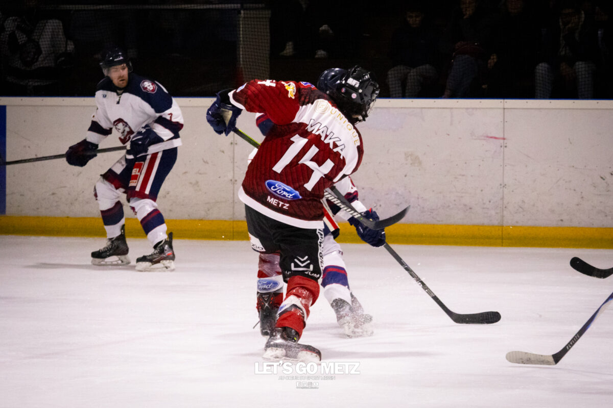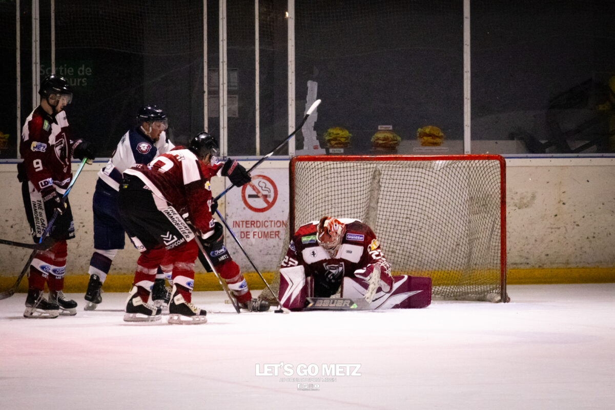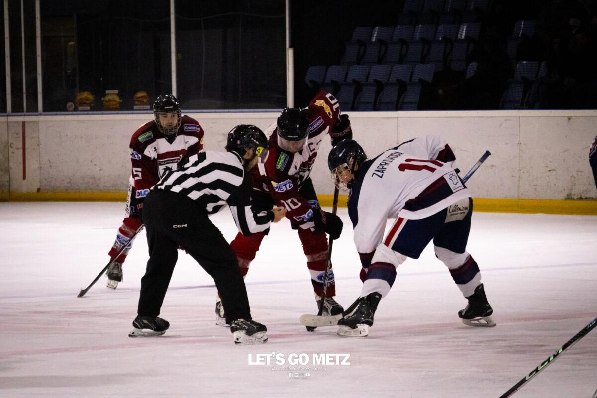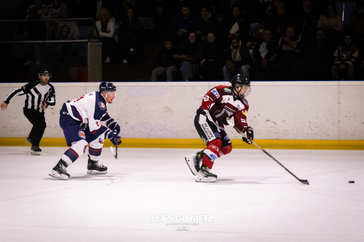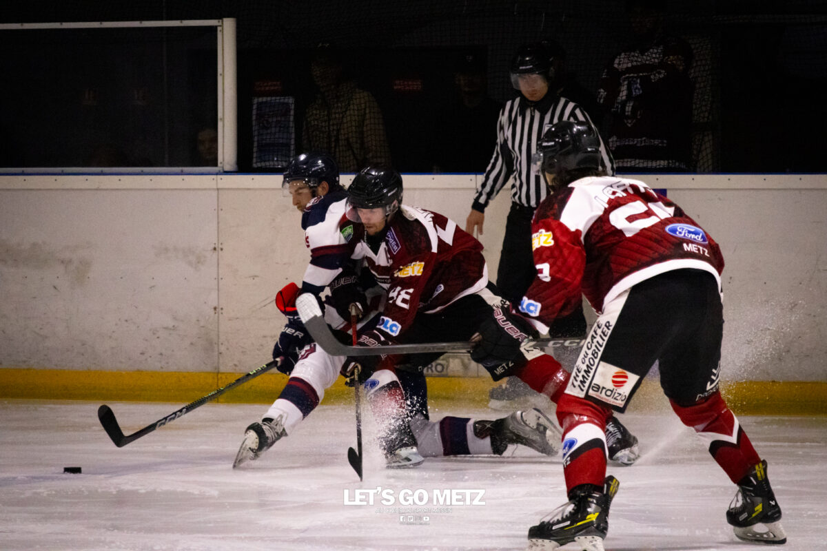 236 Le Metz Hockey Club s’est incliné (4-6) contre Wasquehal en quart de finale aller des playoffs de D3. Les hommes de Lukas Zeliska ont longtemps été au au coude-à-coude avec les Nordistes, grands favoris à la montée et au titre national. La bataille fut belle pour la der de la saison à la Ice Arena. Le Metz Hockey Club est tombé les armes à la main contre Wasquehal, en quart de finale aller des playoffs de D3. Les Graoullys ont été battus (4-6) sur leur glace face à l’un des immenses candidats à la montée en fin d’exercice, qui a survolé la saison régulière. Ils peuvent pourtant nourrir des regrets. Longtemps accrocheurs (1-2, 40′), les Messins ont craqué en encaissant quatre buts dans le dernier tiers-temps.« On est l’une des seules équipes à leur avoir donné du fil à retordre en saison régulière (défaite 5-6 en prolongation à domicile). On fait un très bon match mais on lâche un peu dans le dernier tiers-temps avec des erreurs défensives. Contre une telle équipe avec les meilleurs marqueurs du championnat, cela ne pardonne pas », constate l’attaquant Yannick Hamri. Malgré cet éclat (2-6), les Graoullys n’ont pas abdiqué et ont su réduire la marque en fin de match (4-6). Un exploit possible au retour ? De quoi présager d’un peu de suspense au match retour, samedi 25 avril (18h40) à Wasquehal ? Les Nordistes, qui souhaitent organiser le carré final des playoffs de D3, partent évidemment largement favoris. Mais le Metz Hockey Club ne s’interdit pas de rêver en sortant du match aller avec simplement deux unités de retard. « Ce sera forcément très difficile là-bas mais on va tout donner, tout est possible. On va y aller sans pression, c’est eux qui l’auront. On va s’amuser et jouer au hockey car ce sera peut-être le dernier match de la saison », annonce Yannick Hamri.Quoiqu’il arrive à Wasquehal, la saison du Metz Hockey Club sera amplement réussie. « Cela faisait un moment que nous n’avions fait un tel parcours en playoffs. C’est la récompense du travail de toute une saison, Lukas (Zeliska) nous a bien fait bosser », sourit Hamri. « On aurait voulu finir sur une meilleure note à domicile mais on est heureux d’avoir eu du monde sur les derniers matchs de la saison. Cela donne vraiment du baume au cœur de jouer devant un tel public ». Metz Hockey Club 4-6 WasquehalTiers-temps : 1-1, 0-1, 1-4. Tous les quarts de finale des playoffs de D3 Crédit photo : Zoé Keller / Let’s Go Metz