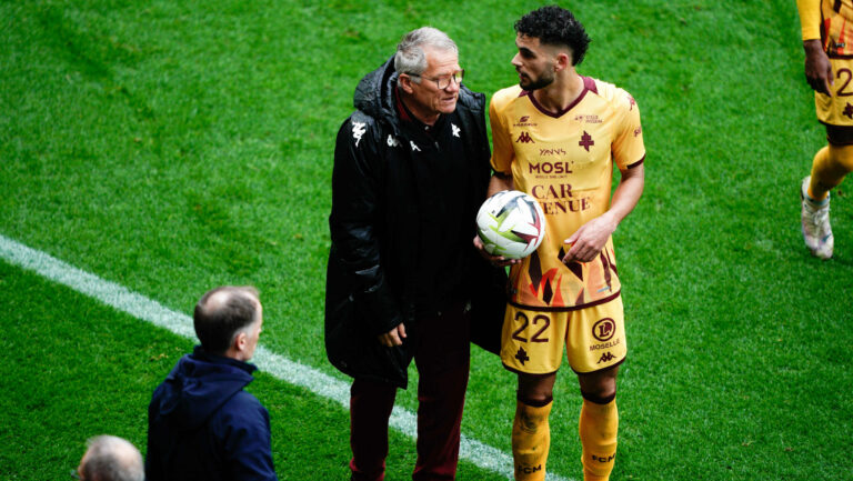 4,4K Le message est martelé : les joueurs travaillent d’arrache pied pour le maintien, l’entraîneur est tout sauf menacé. Pourtant, les semaines passent et le FC Metz ne semble plus pouvoir décoller de la zone rouge. À sept matchs de la fin de saison, ce groupe semble plus que jamais en manque de repères. Stade Saint-Symphorien, ce samedi 30 mars. Le FC Metz sort d’une nouvelle déroute à domicile face à Monaco, 5-2. L’affaire était rapidement pliée par les Monégasques, avec trois buts marqués en seize minutes. En face, la redondante frilosité messine attristait. Et la suffisance, voire la « nonchalance », pour paraphraser Alexandre Oukidja, de certains joueurs messins faisait tâche. Sur les réseaux sociaux, les supporters sont prompts à demander des comptes. La défaite de trop pour certains, un sentiment de honte pour d’autres. Pour rappel, plus de 27 300 personnes s’étaient rendues au stade. Coupable d’une erreur sur le quatrième but, Alexandre Oukidja a immédiatement fait son auto-critique et assumé une certaine « nonchalance ». Photo : Loic Baratoux/FEP/Icon Sport. Faut-il y voir le signe qu’un lien est rompu au sein de l’effectif ? « On est un groupe soudé », balayait Kevin Van den Kerkhof face aux médias après le match. Et avec Laszlo Bölöni ? La réponse semblait moins évidente : « Le coach, il a ses consignes. Après, c’est ses choix… Entre joueurs, on se parle aussi, et quand il y a des choses avec lesquelles on n’est pas d’accord, on fait nos choix. » Et de rajouter : « Si [selon les joueurs] ça ne va pas, on prend les choses en main. » L’international algérien l’admet à demi-mot : le groupe fait parfois preuve d’auto-gestion, quitte à désavouer son entraîneur une fois sur le terrain. Une cassure déjà bien entamée Cette sortie fait l’effet d’une petite bombe. Mais elle ne laisse guère de place à la surprise, tant ce sentiment de cassure était palpable. Déjà, lors de ce dimanche 4 février, alors que le FC Metz venait de perdre une confrontation capitale face au FC Lorient (1-2). Les Grenats payaient cash treize minutes d’anti-football en début de seconde période. Ont-ils voulu envoyer un message à leur coach ce jour-là ? Le défenseur et « grand frère du vestiaire » Ismaël Traoré bottait alors en touche : « Quand on est sur le terrain, on se doit d’appliquer les consignes, et il faut qu’on le fasse avec plus d’envie. » 🎥 Découvrez les réactions d'Ismaël Traoré et de Fali Candé après la défaite du #FCMetz face au #FCLorient, ce dimanche à Saint-Symphorien 👇https://t.co/eklBGI25yN— Let's Go Меtz (@letsgomtz) February 4, 2024 Cinq jours plus tard, au stade Vélodrome. Les Messins arrachaient un match nul contre l’Olympique de Marseille… après avoir joué en supériorité numérique pendant plus d’une heure. Une configuration dont les joueurs n’avaient pas profité, tant ils étaient timorés offensivement. Au micro de Prime Video, Christophe Hérelle accusait le coup : « Tactiquement, on n’est pas prêts, tout le monde l’a vu ce soir. » Aujourd’hui, force est de constater que la situation n’a pas évolué. Un entraîneur en manque d’idées Dans ce contexte tendu, Laszlo Bölöni semble dans l’impasse, comme perdu. Réticent à faire évoluer son éternel plan de jeu défensif, celui qui se définit comme un « joueur d’échecs » a bien fini par accepter un changement de son dispositif de départ. Mais la philosophie appliquée reste foncièrement la même, avec un bloc bas, timide, et une animation basée sur des transitions éclair, souvent inefficaces. Décevant, car lorsque le FC Metz tente de créer du jeu, les coéquipiers de Matthieu Udol savent parfois se montrer emballants, à l’image de cette deuxième mi-temps accomplie face au FC Nantes, début mars. L’entraîneur roumain ne cache pas son mécontentement, bien au contraire. « Toutes les défaites sont frustrantes », disait-il après la défaite contre Lyon. « Je ressens beaucoup de sentiments… qui sont énervants » après le match perdu contre Reims. Mais lorsqu’on lui demande « comment l’équipe pourrait se relever » de cette dernière défaite à Monaco, sa réponse est pour le moins laconique : « Je vous dis bonsoir, je me lève et puis bisous. » Laszlo Bölöni a publiquement pointé du doigt plusieurs de ses joueurs après la défaite contre Monaco. Photo : Julien Buret/LGM. Loin de défendre son groupe, plusieurs joueurs en prenaient publiquement pour leur grade quelques secondes plus tôt, dont Alexandre Oukidja, auteur d’une incroyable boulette amenant au 0-4 : « C’est un manque de respect vis-à-vis de lui-même, de ses coéquipiers, du staff, du club, des supporters. […] Ça, ce n’est pas une erreur. C’est plus qu’une erreur. J’ai peut-être l’air d’un fou furieux mais là, je suis triste. » Ou encore Joel Asoro, sacrifié au bout de vingt-quatre petites minutes de jeu et qualifié de « joueur présent mais pas participant ». Chronique d’un perpétuel recommencement Au sein de ce marasme, difficile d’entrevoir un brin d’optimisme. Tout comme il est, au fond, difficile d’en vouloir uniquement à Laszlo Bölöni, auteur d’un miracle (empoisonné ?) la saison dernière, ou à son effectif, trop faible pour la Ligue 1. La faute à un double mercato raté, dont l’entraîneur roumain lui-même alertait sur les conséquences fin décembre : « Bien sûr que dans les projets de départs et d’arrivées, je préfère qu’on ait d’abord des arrivées et ensuite des départs, pas l’inverse. Malheureusement, on a toujours fait comme ça jusque-là : départ, départ, départ […]. Je n’aime pas du tout ça. » Bernard Serin, président du FC Metz. Photo: Julien Buret/LGM. Cet appel à l’aide n’a pas été suivi d’effets par la direction sportive, invoquant le manque de finances pour mener à bien de potentiel