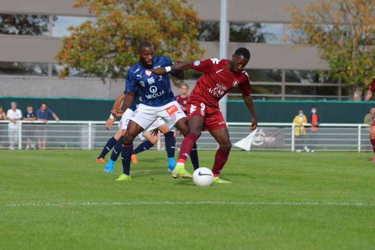 336 Isyakha Touré au duel avec la défense beauvaisienne. (Crédit photo : Kévin Bignossi) Retour aux affaires pour la réserve du FC Metz ! Dans le cadre de la 1ère journée de National 2, les hommes de Grégory Proment recevaient l’AS Beauvais Oise au stade des Hauts de Blémont de Metz-Borny. Retour en texte et en images sur la belle victoire des Grenats, avec en prime les réactions de Grégory Proment et de Milan Robin. Après deux montées consécutives, l’équipe réserve du FC Metz retrouvait le National 2, une découverte pour beaucoup de ces jeunes joueurs qui étaient pour la plupart en U19 la saison passée. De ce fait, les baby Grenats veulent (trop) bien faire les choses. Appliqués en défense en début de rencontre, les hommes de Grégory Proment n’ont cependant pas beaucoup d’occasions en phase offensive. Un centre vicieux de Clément Akpa, qui aurait pu se solder en CSC avec un poil de réussite, ne mettra que peu en danger la défense picarde. (24′)Côté Beauvais, un centre fuyant passera sans être touché devant la cage de Paul Delecroix (29′). Une tête de Marques passera sur corner passera de peu à côté de la lucarne messine (38′).Les deux équipes rentrent aux vestiaires sur un score nul et vierge. La deuxième mi-temps va vite basculer dans le camp grenat. Dès le retour des vestiaires, la réserve messine ouvre le score par l’intermédiaire de Mathieu Cachbach, qui conclue un bon mouvement collectif d’un plat du pied gauche. 1-0, Metz (49′). Le buteur Mathieu Cachbach (Crédit photo : Kévin Bignossi) Le FC Metz aura même une chance de doubler voire tripler la mise mais Sonny Perrey manque de réussite par deux fois. Ne se mettant pas l’abri, les messins vont jouer à se faire peur malgré une équipe de Beauvais réduite à 10, à la suite d’un second carton jaune reçu par Marques après un tacle sur ce même Sonny Perrey.En effet, les picards poussent en fin de match et vont même se procurer deux situations très chaudes. Par deux arrêts de grande classe, Paul Delecroix repousse les assauts beauvaisiens pour préserver le score. Les jeunes Grenats s’imposent finalement sur la plus petite des marges, une victoire courte mais précieuse dans une saison 2020-2021 qui s’annoncera relevée en National 2. Paul Delecroix (en vert à côté du capitaine Vincent Peugnet) fut précieux en fin de match pour les Grenats (Crédit photo : Kévin Bignossi) Les réactions de Grégory Proment et de Milan Robin A l’issue de la rencontre, nous avons recueilli les impressions de l’entraîneur de la réserve Grégory Proment, ainsi que celles de son numéro 10, Milan Robin. Grégory Proment Crédit photo : Kévin Bignossi Grégory Proment : C’est une victoire un peu inattendue, on était très jeunes, très immatures… Avec une moyenne d’âge autour des 19 ans, même avec Paul (Delecroix) dans les buts…LGM : C’était une volonté de ramener Paul pour avoir un peu d’expérience ?GP : C’est lui qui a demandé à jouer avec nous ! Les pros ont dit ok, nous ça nous va bien aussi car on a un problème de gardiens en quantité. Je trouve ça génial qu’il fasse ça, il parle beaucoup, il est content d’être avec nous et il nous sort 2 balles qu’il faut sortir. Il guide la défense, qui est plus mature que le reste de l’équipe mais qui reste jeune. J’ai vu une équipe solidaire avec une grosse envie de bien faire, ça fait plaisir que les gamins soient récompensés après tant d’efforts…Dans la combativité c’était impressionnant, ils ne lâchaient rien dans les duels…GP : Il n’y a pas le choix, il faut qu’ils comprennent que le foot c’est ça ! Ils l’ont très bien compris, certains sortent avec des crampes, d’autres très fatigués… Ils ont tout donné, c’est ce qu’on recherche.LGM : On a vu une première mi-temps un peu timorée de vos joueurs, qui a précédé une grosse deuxième mi-temps… C’est la découverte d’un niveau supérieur ?GP : Non pas forcément, en R1 on avait raté notre premier match. Je pense que c’est l’appréhension, on restait sur deux matchs amicaux compliqués. En première mi-temps, j’ai vu des choses intéressantes sur l’aspect défensif et sur la combativité, même si le rythme dans le ballon était moins impressionnant que deuxième mi-temps…Avec pas mal de ballons perdus également…GP : Cela ne me dérange pas, c’est dans les erreurs qu’on apprend. J’autorise les erreurs, il faut qu’ils fassent des erreurs pour comprendre qu’il y a des choses qu’ils ne doivent pas faire. En première mi-temps, on a eu pas mal de ballons perdus sur des passes négligées, ces passes n’existaient plus en deuxième mi-temps. Le haut niveau c’est ce genre de détails… Faites des erreurs mais combattez !Ils ont emmagasiné de la confiance pour la suite…GP : Oui, ça va leur faire du bien. Ce qu’il faut retenir sur ce match c’est qu’ils sont très jeunes et s’il veulent faire carrière, il faudra reproduire des matchs comme ça toute leur vie. Milan Robin Crédit photo : Kévin Bignossi LGM : Cela fait quoi de retrouver la compétition et la victoire ?MR : Cela fait du bien ! C’était notre premier match à ce niveau pour beaucoup, on s’attendait à un match compliqué. On a respecté les consignes du coach et ça s’est soldé par une victoire.LGM : Cela s’est senti au début de match, avec une certaine appréhension…MR : Oui c’est sûr, on a pas voulu prendre trop de risques, on savait que l’on jouait contre une équipe de Beauvais qui était plus expérimentée que nous. Au fil du match, on a pris confiance en nous et on a réussi à ouvrir le score très tôt en seconde période et on a su faire preuve de maturité pour garder ce score.LGM : Ce fut ce but le déclic, ou bien cela est intervenu avant, à la mi-temps ?MR : En première mi-temps vers la 30ème minute, on a senti qu’il y avait des décalages possibles quand on