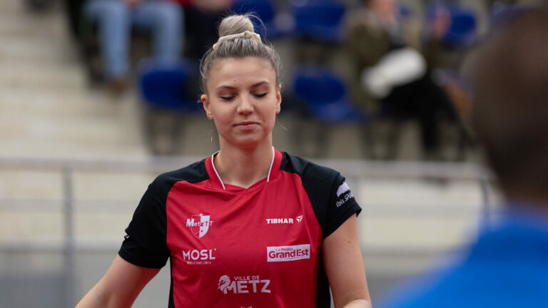 860 Pour son dernier match de l’année 2023, le Metz TT s’est imposé (3-1) contre Schiltigheim et poursuit son incroyable invincibilité en PRO A Dames. Quelques jours après sa victoire (3-1) contre Joué-les-Tours, le Metz Tennis de Table était de nouveau sur le pont, ce mercredi soir, au Complexe Saint-Symphorien. Pour leur dernière sortie de l’année 2023, les filles de Loïc Belguise recevaient les Alsaciennes de Schiltigheim. Une formalité pour le Metz TT, qui s’est imposé 3-1 et poursuit son début de saison sans accroc. Une huitième victoire en autant de matchs de championnat pour des Messines qui caracolent en tête de la PRO A Dames. Mariia Tailakova démarrait parfaitement la partie avec une victoire contre la Luxembourgeoise Sarah De Nutte (1-0). Adina Diaconu enfonçait le clou avec un succès aux dépens de Charlotte Lutz (2-0). Christina Kallberg manquait néanmoins l’occasion de conclure la rencontre et s’inclinait contre Gabriela Feher (2-1). Qu’importe, la Russe Tailakova finissait le travail en s’imposait en trois manches, face à Charlotte Lutz (3-1). Le Metz TT passera les fêtes au chaud. Metz TT 3-1 Schiltigheim Tailakova – De Nutte : 11/2 11/7 11/7Diaconu – Lutz : 11/8 11/2 11/6Kallberg – Feher : 11/5 6/11 6/11 7/11Tailakova – Lutz : 16/14 11/4 11/7 Classement de PRO A DamesCrédit photo : Julien Buret / Let’s Go Metz