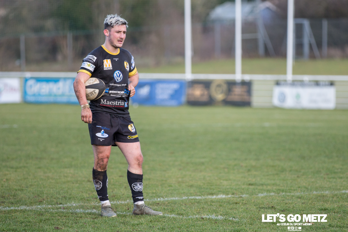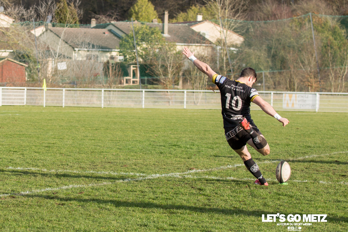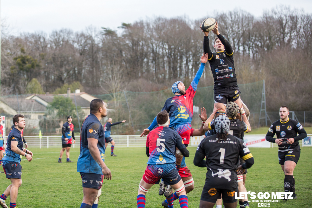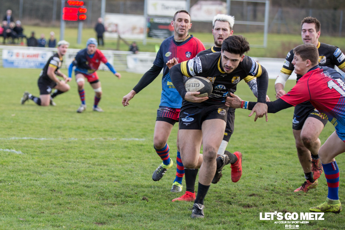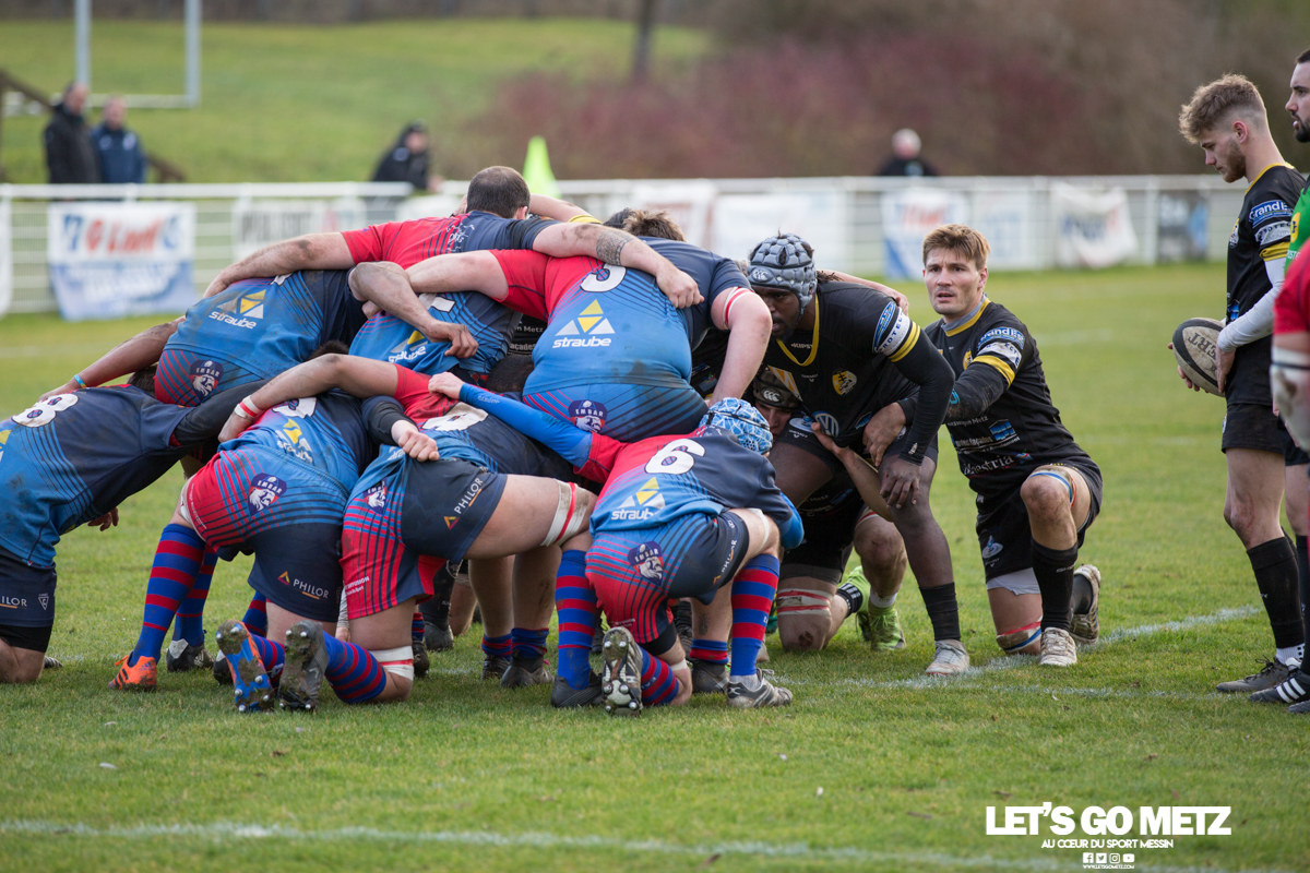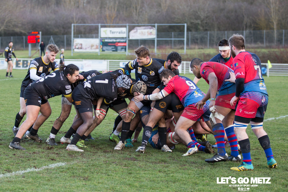 398 Après une reprise de la compétition à l’extérieur, les Messins ont reçu les joueurs de l’Entente Montbeliar Belfort Ascap Rugby sur le terrain de La Grange aux Bois pour la 13ème journée de Fédérale 3. Larges favoris avant la rencontre, les hommes de Geoffrey Phillippe n’ont pas failli à leur réputation… Les joueurs du RC Metz ont entamé 2020 comme ils avaient fini 2019 : en puissance. Bien installés dans leur fauteuil de leader ils avaient mené la vie dure à Hagueneau lors de la reprise. Ce Dimanche, face à une équipe de bas de tableau, il serait aisé de dire que les Messins n’avaient qu’à faire respecter la logique, mais cela serait manquer de respect à un adversaire qui a su se montrer surprenant contre des équipes réputées supérieures avec des victoires face à Illkirch et Lons le Saunier. A l’aller, les hommes en noir l’avaient toutefois emporté 12 à 28. La première mi temps a longtemps donné une impression de duel entre les deux équipes. La première pénalité pour Metz à la trentième seconde est compensée par une pénalité en faveur de l’EMBAR à la quatrième minute. A la 14ème, les locaux réalisent le premier écart avec un essai de Habert qui une fois transformé par Browne est rapidement suivi à la 17ème d’un second essai venant cette fois d’une belle combinaison de passes, concrétisé par Guerimand, transformé également. Malgré tout les visiteurs ne se laissent pas distancer et rendent même les coups en profitant d’un coup de mou défensif pour inscrire un essai et le transformer à la 22ème minute avant de réussir une pénalité à la 28ème. A ce moment le momentum semble avoir quitté les locaux qui voient leurs efforts de début de match réduits à 4 petits points : 17 – 13 La mauvaise passe ne dure par pour les hommes de Geoffrey Phillippe qui acculent les Montbéliardais dans leur camp et les font craquer au gré d’une sortie de mêlée mal maîtrisée qui meurt derrière la ligne de fond et donne une cartouche bien précieuse à quelques centimètres de l’en but. Bonjean se charge volontiers de conclure l’action pour permettre à son équipe de reprendre 11 points d’avance une fois la transformation passée par Browne : 24 – 13.En fin de période, les efforts de l’entente Montbéliard Belfort faiblissent et le réalisme Messin paie avec un nouvel essai à la 38ème, non transformé il porte le score à 29 – 13 à la mi temps. Un écart sévère si on prend en compte la débauche d’efforts des visiteurs, mais le RC Metz se montre implacable. Requinqués par leurs quelques minutes aux vestiaires, les joueurs de l’Entente se lancent dans une reconquête de la marque avec une pénalité réussie dès la 41ème mais leurs efforts défensifs s’avèrent trop maladroits et aboutissent à un essai de pénalité à la 46ème : 36 – 16. A la 54ème, un nouveau soubresaut vient pénaliser la passivité défensive Messine alors qu’un joueur adverse aplatit le 7ème essai de la partie : 36 – 21.Les hommes en noir sont ensuite contraints de s’y reprendre à trois fois malgré des touches extrêmement bien trouvées aux 5 mètres avant de profiter de l’entrée salvatrice de Toussaint. Au gré d’une feinte de touche longue, le pilier vétéran bien lancé saisit le ballon et emporte le peu de résistance qu’il trouve sur son chemin avec lui jusqu’à l’en but. Cette fois c’est Guerimand qui transforme et le score s’écarte à nouveau : 43 – 21 A partir de ce moment les visiteurs ne voient plus le jour et subissent rapidement un nouveau revers à la 66ème… et encore un autre à la 72ème. 34 points séparent les deux équipes désormais et le dernier coup d’éclat des rouges sur un essai transformé à la 77ème ne relance pas vraiment le suspense puisque les Messins éteignent le reste de motivation de leurs adversaires du jour à la 79ème minute avec le dernier essai de la partie. Le score final de ce match fleuve ? 62 – 28. Les Messins, bien que pas toujours aussi précis et tranchants qu’ils l’auraient souhaité ont finalement concrétisé un grand nombre d’occasions et réalisent leur meilleure marque de la saison pour s’établir un peu plus en tête de leur poule de Fédérale 3 avec 11 points d’avance sur le premier concurrent, le tout saupoudré d’un goalaverage exceptionnel de +209. Forts de cette nouvelle victoire bonifiée, les joueurs du RC Metz se rendront dès le Dimanche 26 Janvier chez un des adversaires les plus en difficultés cette saison, le Colmar Rugby Club. Enfin, la prochaine rencontre à domicile aura lieu le 16 Février face à Chalon sur Saône. La galerie du match Crédit photo : Matthieu Henkinet