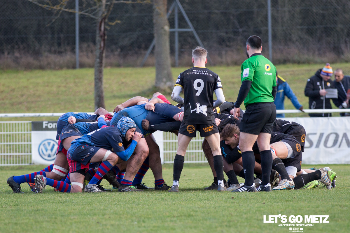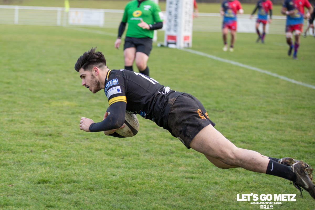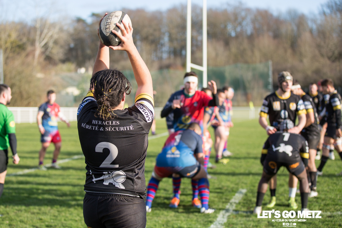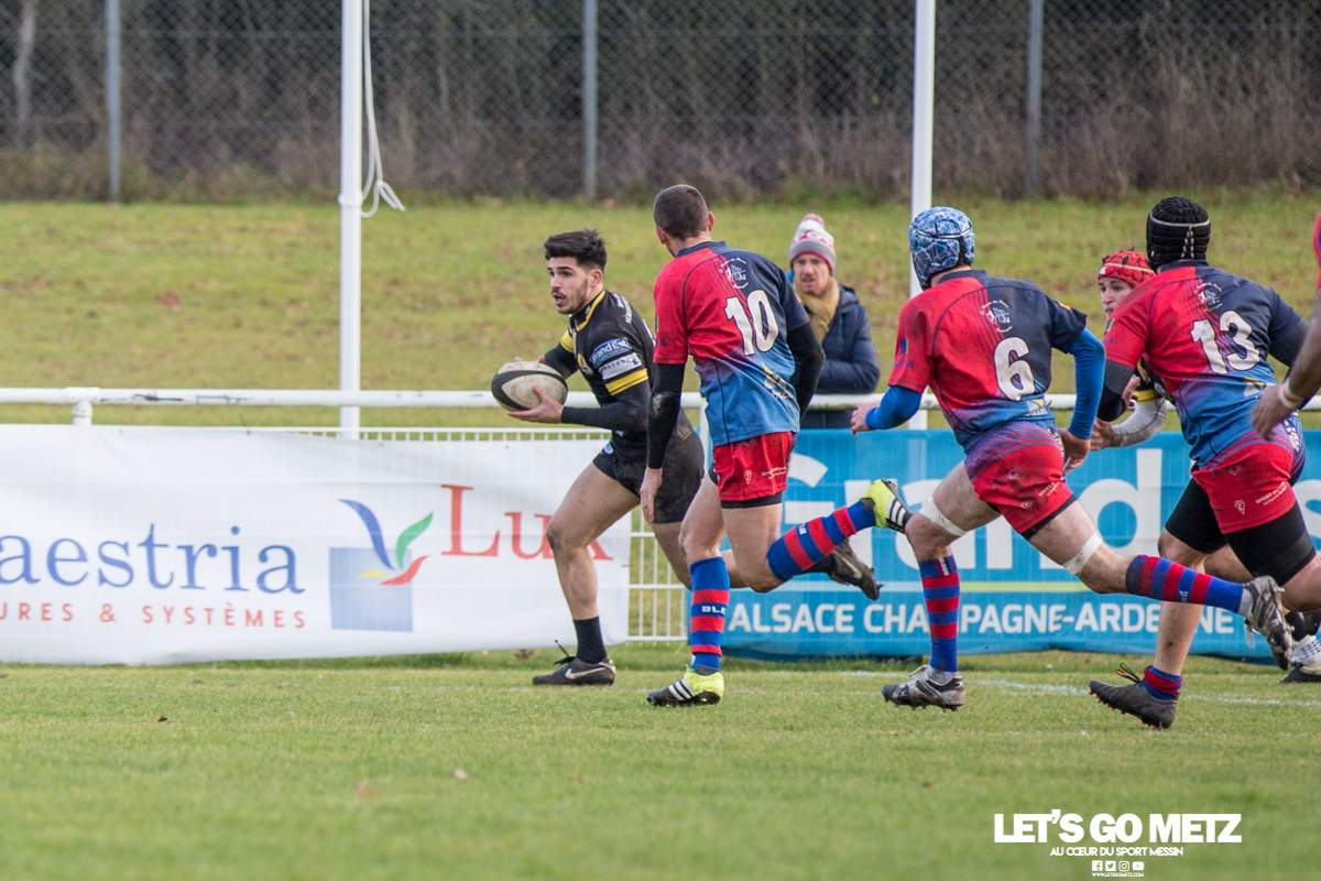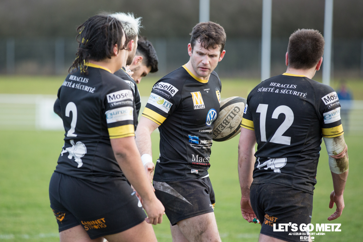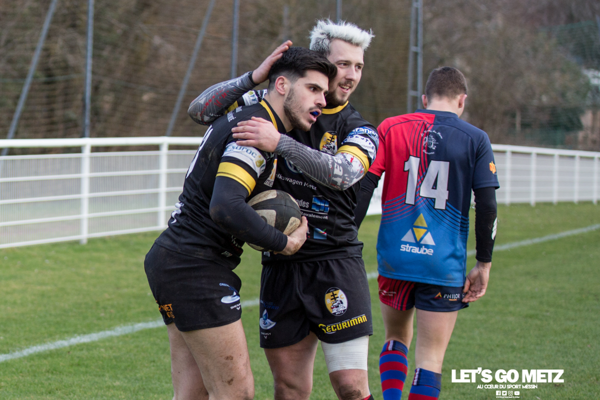 398 Après une reprise de la compétition à l’extérieur, les Messins ont reçu les joueurs de l’Entente Montbeliar Belfort Ascap Rugby sur le terrain de La Grange aux Bois pour la 13ème journée de Fédérale 3. Larges favoris avant la rencontre, les hommes de Geoffrey Phillippe n’ont pas failli à leur réputation… Les joueurs du RC Metz ont entamé 2020 comme ils avaient fini 2019 : en puissance. Bien installés dans leur fauteuil de leader ils avaient mené la vie dure à Hagueneau lors de la reprise. Ce Dimanche, face à une équipe de bas de tableau, il serait aisé de dire que les Messins n’avaient qu’à faire respecter la logique, mais cela serait manquer de respect à un adversaire qui a su se montrer surprenant contre des équipes réputées supérieures avec des victoires face à Illkirch et Lons le Saunier. A l’aller, les hommes en noir l’avaient toutefois emporté 12 à 28. La première mi temps a longtemps donné une impression de duel entre les deux équipes. La première pénalité pour Metz à la trentième seconde est compensée par une pénalité en faveur de l’EMBAR à la quatrième minute. A la 14ème, les locaux réalisent le premier écart avec un essai de Habert qui une fois transformé par Browne est rapidement suivi à la 17ème d’un second essai venant cette fois d’une belle combinaison de passes, concrétisé par Guerimand, transformé également. Malgré tout les visiteurs ne se laissent pas distancer et rendent même les coups en profitant d’un coup de mou défensif pour inscrire un essai et le transformer à la 22ème minute avant de réussir une pénalité à la 28ème. A ce moment le momentum semble avoir quitté les locaux qui voient leurs efforts de début de match réduits à 4 petits points : 17 – 13 La mauvaise passe ne dure par pour les hommes de Geoffrey Phillippe qui acculent les Montbéliardais dans leur camp et les font craquer au gré d’une sortie de mêlée mal maîtrisée qui meurt derrière la ligne de fond et donne une cartouche bien précieuse à quelques centimètres de l’en but. Bonjean se charge volontiers de conclure l’action pour permettre à son équipe de reprendre 11 points d’avance une fois la transformation passée par Browne : 24 – 13.En fin de période, les efforts de l’entente Montbéliard Belfort faiblissent et le réalisme Messin paie avec un nouvel essai à la 38ème, non transformé il porte le score à 29 – 13 à la mi temps. Un écart sévère si on prend en compte la débauche d’efforts des visiteurs, mais le RC Metz se montre implacable. Requinqués par leurs quelques minutes aux vestiaires, les joueurs de l’Entente se lancent dans une reconquête de la marque avec une pénalité réussie dès la 41ème mais leurs efforts défensifs s’avèrent trop maladroits et aboutissent à un essai de pénalité à la 46ème : 36 – 16. A la 54ème, un nouveau soubresaut vient pénaliser la passivité défensive Messine alors qu’un joueur adverse aplatit le 7ème essai de la partie : 36 – 21.Les hommes en noir sont ensuite contraints de s’y reprendre à trois fois malgré des touches extrêmement bien trouvées aux 5 mètres avant de profiter de l’entrée salvatrice de Toussaint. Au gré d’une feinte de touche longue, le pilier vétéran bien lancé saisit le ballon et emporte le peu de résistance qu’il trouve sur son chemin avec lui jusqu’à l’en but. Cette fois c’est Guerimand qui transforme et le score s’écarte à nouveau : 43 – 21 A partir de ce moment les visiteurs ne voient plus le jour et subissent rapidement un nouveau revers à la 66ème… et encore un autre à la 72ème. 34 points séparent les deux équipes désormais et le dernier coup d’éclat des rouges sur un essai transformé à la 77ème ne relance pas vraiment le suspense puisque les Messins éteignent le reste de motivation de leurs adversaires du jour à la 79ème minute avec le dernier essai de la partie. Le score final de ce match fleuve ? 62 – 28. Les Messins, bien que pas toujours aussi précis et tranchants qu’ils l’auraient souhaité ont finalement concrétisé un grand nombre d’occasions et réalisent leur meilleure marque de la saison pour s’établir un peu plus en tête de leur poule de Fédérale 3 avec 11 points d’avance sur le premier concurrent, le tout saupoudré d’un goalaverage exceptionnel de +209. Forts de cette nouvelle victoire bonifiée, les joueurs du RC Metz se rendront dès le Dimanche 26 Janvier chez un des adversaires les plus en difficultés cette saison, le Colmar Rugby Club. Enfin, la prochaine rencontre à domicile aura lieu le 16 Février face à Chalon sur Saône. La galerie du match Crédit photo : Matthieu Henkinet