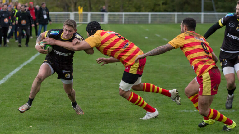 772 En difficulté depuis le début de la saison de Fédérale 2, le RC Metz a une nouvelle fois vu ses efforts contrariés en s’inclinant face à Saint-Priest (19-45). C’était un match entre le bon dernier (RC Metz) et le cinquième de la Poule 1 (Saint-Priest). Un de ces matchs un poil tristes du mois de Novembre que même la page Facebook du club messin avait oublié d’annoncer avant le jour J. Une omission pieuse que les fidèles de la première heure avaient quoi qu’il en soit noté dans leur agenda. En Ovalie, on abandonne pas sans livrer bataille. Il est certain que les rugbymen messin se rêveraient bien au chaud, dans une meilleure situation au classement, cependant, les temps sont durs pour cette équipe qui n’a jamais été au complet depuis plus d’une saison désormais. Une situation forcément complexe à l’heure où la meilleure attaque de la poule toque à la porte. Les hommes de Géraud Gas ont une nouvelle fois dû redoubler d’efforts pour exister dans un match compliqué. Un premier acte sous tension Le match commençait avec une défense solide de part et d’autre. Cependant les deux équipes se montraient maladroites offensivement avec deux pénalités ratées par Saint-Priest et une par le RC Metz. Le jeu était finalement interrompu à la douzième minute en raison d’une bagarre générale initiée par un joueur de Saint Priest (0-0). Paul Anton-Rouyer, mêlé aux échanges et Yoan Brousse, coupable d’être sorti de son rôle de juge de touche, étaient sanctionnés d’un carton rouge. Les San-Priods écopaient eux aussi d’une expulsion. Après un retour vers un jeu plus serin, les locaux pensaient inscrire un essai mais il n’était finalement pas accordé par l’arbitre. Les contacts sur la ligne d’en-but ravivaient alors les tensions aboutissant à l’expulsion de Théo Costa et d’un second rhodanien. Saint-Priest capitalisait sur cette déception pour ouvrir finalement la marque avec un essai transformé (0-7, 17′). Remontés et plus efficaces dans le jeu soudainement ouvert, les hommes en noirs passaient deux essais transformés en trois minutes pour revenir à la hauteur des visiteurs (14-17, 37′). Ils s’offraient même quelques espoirs de prendre les devants avant la pause mais étaient contrariés par une solide défense des visiteurs sur leur ligne. Score à la mi-temps : 14-17 Bilan sévère en deuxième Alertes dès la reprise des débats, les messins débutaient cette seconde mi-temps de la plus belle des manières avec un essai (19-17, 45′). Cependant les San-Priods, réalistes, répliquaient en faisant parler leur vitesse en pénétration (19-24, 50′) et profitaient d’une pénalité pour accroitre un peu plus l’écart (19-31, 55′). Emoussés dès l’heure de jeu, après s’être fièrement battus en infériorité numérique, les locaux voyaient leurs espoirs de retour au score foulés du pied par une nouvelle réalisation adverse (19-45, 65′). Coupables de plusieurs fautes de main et d’erreurs tactiques sans pour autant se laisser percer, les joueurs du RC Metz ne pouvaient alors faire mieux que de se montrer volontaires dans le jeu tout en en préservant un écart devenu trop important jusqu’au coup de sifflet final. Score final : RC Metz 19-45 Saint-Priest La réaction de Géraud Gas Tout ne s’est pas passé comme prévu ce soir…Non. Pourtant le début de match est assez bon. On s’était promis d’être présents sur les placages, d’être présents sur les rucks… Mais le scénario change assez vite avec trois cartons rouges. On tient bien toute la mi-temps et la deuxième, pour la première fois de la saison, on la commence pas trop mal. Après, à la 60ème, les organismes peinent à force de jouer à 12 et ça devient compliqué. On a tout de même pu croire à un sursaut messin malgré l’infériorité numérique.Oui, il y a du jeu qui a été produit. On a fait de belles choses sur certaines phases de jeu mais en face il y avait la meilleure attaque de la poule. Je regrette un peu le score parce qu’il est trop lourd. Si le match s’était déroulé correctement on aurait pu les embêter largement. Il y aura beaucoup d’absents pour le prochain match, comment est-ce que vous allez gérer ça ?On va aller à Andrezieux très amoindris. Pour le moment à chaud je n’ai pas les solutions mais on va le préparer au mieux parce qu’il y a Nantua qui arrive derrière. Ca va piquer un petit peu mais on ira au bout de l’affaire. Les joueurs sont solidaires, ils l’ont montré et on fera tout ce qu’on peut pour bien figurer dans cette poule très solide. La galerie du match Rédaction : Matthieu Henkinet et Théo BauerCrédit photo : Matthieu Henkinet