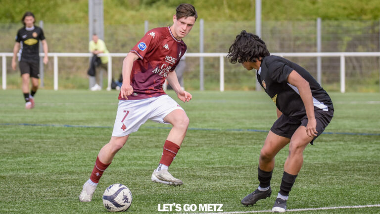 1,K Une fois n’est pas coutume, les résultats du week-end des équipes issues de la formation messine ont été contrastés. Si les U19 ont réalisé une belle performance face à l’OL, les U19F et les U17 se sont inclinés. C’est l’heure de votre récap’ formation. Trois formations du FC Metz étaient sur les terrains ce week-end. Les U17 recevaient l’équipe de Torcy, les U19F accueillaient le RC Lens, et les U19 se déplaçaient sur la pelouse de l’Olympique Lyonnais. Retrouvez tous les résultats du week-end dans le récap’ formation. Le manque de réussite des U17 face à Torcy Surpris dès l’entame du match par un but de Matteo Garruzzo (2e), les U17 du FC Metz ont bien réagi par l’intermédiaire de Jules Thouvenot (14e). Un quart d’heure plus tard, Torcy prenait à nouveau l’avantage (32e). Les protégés de Toifilou Maoulida n’ont pas manqué d’occasions, mais surtout de réussite face au but. Une faute non sifflée dans la surface adverse aurait pu changer le cours du match mais les U17 se sont finalement inclinés de peu (1-2). Après 24 journées dans ce Championnat national U17, les Grenats sont septièmes de la poule C, à deux points du sixième, Auxerre. Prochain rendez-vous le week-end du 4 mai, sur la pelouse du FC Lyon. Photo : Mikael Franck / Let’s Go Metz Déception pour les U19F Nettement dominées en première période, les Messines ont peiné à se montrer dangereuses en attaque. En trois minutes (24e, 27e), les Lensoises prenaient l’avantage au tableau d’affichage. Un écart au score qui ne changera jamais, malgré trois changements à la mi-temps. Les U19F du FC Metz ont toutefois affiché un bien meilleur visage au retour des vestiaires, notamment sur le plan offensif. Mais Lens a su gérer correctement sa fin de rencontre pour s’imposer (0-2). Après sept matchs en phase excellence, les Messines sont dernières au classement, avec six petits points. La descente est loin d’être actée, mais les jeunes pousses du club à la Croix de Lorraine devront poursuivre leurs efforts pour se maintenir. Prochain rendez-vous pour elles le week-end du 27 avril, avec la réception de Sarcelles. Photo : Julien Buret / Let’s Go Metz Les U19 surprennent l’Olympique Lyonnais grâce à Brian Madjo C’est le rayon de soleil du week-end pour la formation messine. Après une victoire (1-2) le week-end dernier face à Strasbourg, les U19 ont enchaîné sur la pelouse de l’OL. Après une entame de match compliquée (1-0 pour l’OL après 15 minutes), les Grenats ont immédiatement réagi par l’intermédiaire d’Abdoulaye Nassoko (18e). Mené à la pause (2-1), le FC Metz s’est toutefois imposé (3-2) grâce à deux réalisations du crack Brian Madjo (62e, 80e), qui avait déjà fait plier les Strasbourgeois la semaine passée. Après 24 journées dans ce Championnat national U19, les Grenats sont quatrièmes de la poule B. La réception du Clermont Foot les attend lors du prochain week-end de compétition, le 4 mai. Crédit photo : Julien Buret et Mikael Franck / Let’s Go Metz À noter : la victoire de la réserve en N3 face à Besançon. Cliquez-ici pour lire le compte-rendu de la rencontre.