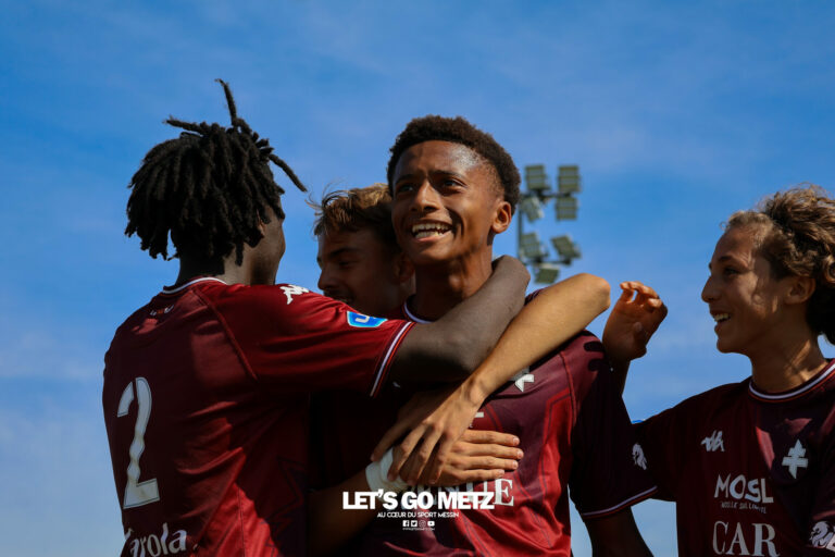 48 Le FC Metz était particulièrement en verve ce week-end contre le RC Strasbourg Alsace chez les jeunes. Retrouvez notre Récap’ formation. Hasard du calendrier, deux équipes du FC Metz se frottaient au RC Strasbourg Alsace pour des derbys de l’Est chez les jeunes ce dimanche : les U19 Nationaux et les U17 Nationaux. Plus tôt dans le week-end, la seconde équipe des U17 s’est qualifiée en finale de la Coupe du Grand Est tandis que les U19 féminines continuent leur chemin de croix. L’équipe réserve du FC Metz s’est elle imposée contre Balagne en National 3. Voici notre Récap’ formation. U19 – Un point à Strasbourg Le FC Metz a décroché le point du match nul à Strasbourg au terme d’une partie spectaculaire. Anis Fiche et Jules Thouvenot se sont d’abord répondus à une minute d’intervalle (1-1, 18′). Au retour des vestiaires, Mathis Holo donnait l’avantage aux Grenats (1-2, 47′) mais Ahmet Eray Yayla puis Louis Scherer faisaient passer le RCSA en tête (3-2, 65′). Mathis Holo égalisait finalement dans les dernières minutes du match (3-3, 88′). Les U19 messins consolident leur deuxième place au classement. U17 – Un derby remporté et une finale de Coupe Comme les U19, les U17 du FC Metz affrontaient le RC Strasbourg Alsace en championnat national. Devant un public venu en nombre, dont une centaine de supporters de la Horda Frénétik 97, les jeunes Grenats ont joué avec le suspense. Il aura fallu attendre la 81e minute de jeu pour assister à l’ouverture du score de Jess Gomes Rodrigues (1-0) avant l’égalisation strasbourgeoise deux minutes plus tard (1-1, 83′).Antoine Carrabetta donnait finalement la victoire au FC Metz dans les ultimes instants de la rencontre (2-1, 90′). Un succès qui permet aux Grenats de monter sur le podium de leur championnat. Un week-end parfait pour la catégorie U17 puisque les Messins se sont également qualifiés en finale de la Coupe du Grand Est aux dépens de l’US Thionville Lusitanos (2-2, victoire 2-4 aux T.A.B.). U19F – Les Messines s’enfoncent Les U19 féminines du FC Metz continuent leur saison galère. Les jeunes Messines avaient l’occasion de se donner un peu d’espoir dans le choc des mal classés contre Valenciennes. Le VAFC n’a malheureusement eu besoin que d’une mi-temps pour balayer son adversaire du week-end (0-3, 44′). Les réductions du score de Mila Drion (1-3, 57′) et d’Emma Lopez (2-4, 82′) n’ont rien changé au sort de la rencontre. Le FC Metz est enlisé à la dernière place au classement. Crédit photo : Zoé Keller/Let’s Go Metz (archive)