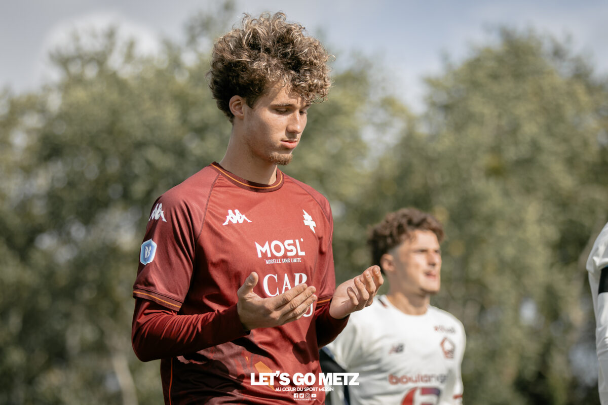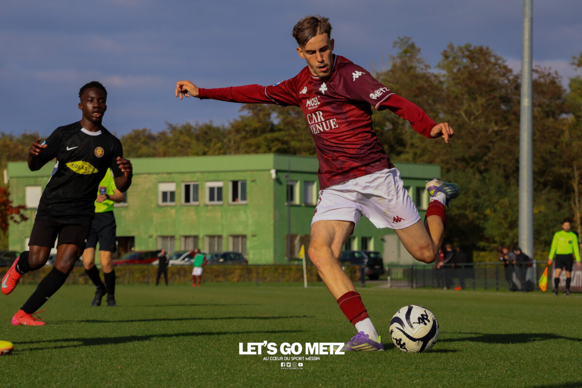 51 Une seule victoire en quatre rencontres pour la formation du FC Metz ce week-end. Mais un succès très important pour la réserve en National 3, après un début de saison raté. Dans l’ensemble, les résultats des différentes équipes de la formation du FC Metz ont été assez décevants ce week-end, avec une seule victoire en quatre matchs. Néanmoins, l’impact sur les classements respectifs de chaque section reste limité. Les U19, U19F et U17 gardent une place sur le podium, tandis que la réserve remonte au milieu de tableau de National 3. La réserve confirme la bonne dynamique Face à l’US Pays de Cassel, l’équipe réserve du FC Metz s’est offert une deuxième victoire consécutive (1-3). Convaincants face à Lille la semaine dernière, les Messins ont été dominants ce samedi, en déplacement dans le Nord. Après avoir concédé l’ouverture du score (1-0, 7′), ils ont pris le match en main avec un but d’Adam Marchal (1-1, 15′) puis un deuxième de Nathan Mbala (1-2, 20′). En deuxième mi-temps, ce dernier inscrivait un doublé pour faire le break (1-3, 67′). Une performance complète et un match clé remporté. Classement National 3 Les U19 passent au travers face à Dijon L’équipe U19 du FC Metz a subi un lourd revers ce dimanche sur la pelouse du FCO Dijon (3-0). Vainqueurs de leurs quatre derniers matchs, les Grenats ont été inexistants. Les Dijonnais ont rapidement ouvert le score (1-0, 11′), avant de creuser l’écart en deuxième période (2-0, 72′), puis d’enfoncer le clou dans les arrêts de jeu (3-0, 90′). Classement U19 Statu-quo pour les U17 Pour l’équipe U17, la réception de l’US Torcy PVM, 3e du classement, représentait une belle occasion d’asseoir sa position sur le podium. Avec un nul (2-2), les Messins ne reculent pas, mais ratent une occasion de se rapprocher de la première place. Samedi, les Grenats ouvraient le score juste avant la pause, par l’intermédiaire de Maykel Gomis (1-0, 43′). Puis ils subissaient les assauts de l’US Torcy PVM, qui égalisaient (1-1, 49′) et prenaient l’avantage dans la foulée (1-2, 64′), grâce à un doublé de Nils Rised. Les locaux évitaient le pire, grâce à la réponse d’Astor Kastel (2-2, 76′). Opération mitigée, mais un point tout de même pour les Messins. Classement U17 Les U19F impuissantes face à l’OL Sur le papier, le déplacement à Lyon s’apparentait déjà à une mission impossible. Face aux messines, la meilleure équipe de la poule de loin, qui a remporté tous ses matchs cette saison. Dimanche, la hiérarchie a malheureusement été respectée (3-0). Avec des buts marqués à la 45e, 52e et 89e, l’Olympique Lyonnais était en démonstration. Cette saison, l’adversaire direct de l’équipe U19 féminine du FC Metz est plutôt le FCO Dijon, qui occupe actuellement la deuxième place du groupe. Classement U19F Crédit photo (archives) : Mikaël Franck (Une), Julien Buret (corps)