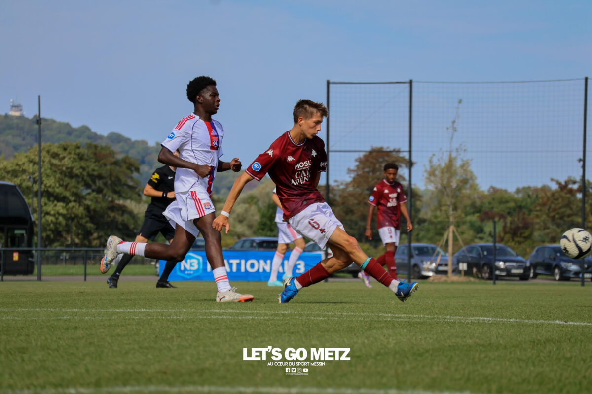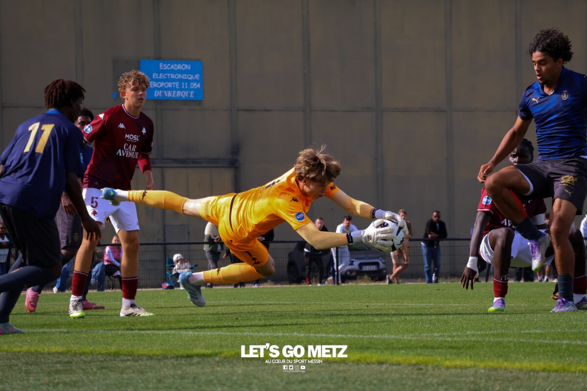 105 La bonne dynamique de la formation du FC Metz s’est confirmée ce week-end, avec un bilan parfait. Les U17 ont signé une belle victoire face à l’ESTAC Troyes (3-1). Les U19 l’ont emporté sur la pelouse de l’AJ Auxerre (2-3). Les féminines U19 se sont offertes un succès contre le FC Fleury 91 (2-0). Les U17 du FC Metz intouchables face à l’ESTAC Troyes L’équipe U17 du FC Metz est en grande forme depuis le début de la saison. Avec un nouveau succès à domicile contre Troyes, les Grenats ont remporté cinq de leurs sept premiers matchs. Samedi, ils attaquaient fort, par l’intermédiaire de Yanis Boussera (1-0, 15′) et Timothé Mélières (2-0, 35′). Malgré la réduction du score troyenne juste avant la mi-temps (2-1, 43′), les Messins gardaient le contrôle du match. Timothé Mélières inscrivait un doublé pour sceller le score de la rencontre (3-1, 51′). À égalité de points avec l’OL, que le FC Metz a battu, le club à la Croix de Lorraine reste en tête de la poule B du championnat national U17. Trois victoires consécutives pour les U19 Les U19 du FC Metz sont sur une très bonne lancée. Ce week-end, ils sont venus à bout de l’AJ Auxerre en déplacement. Pourtant, le match commençait mal avec une ouverture du score rapide des Auxerrois (1-0, 4′). Mais le FC Metz parvenait quand même à prendre l’avantage avant la mi-temps, grâce aux buts de Nathan Mbala (1-1, 15′) et Hamza Kadamani (1-2, 26′). Puis les Messins, à 11 contre 10 à partir de la 65e minute, augmentaient l’écart grâce à Edson Emanuel Lima Dos Santos (1-3, 70′). Les Auxerrois inscrivaient un deuxième but à la 90e minute mais le FC Metz signait une troisième victoire consécutive (2-3). Les U19F obtiennent une victoire cruciale face au FC Fleury 91 Après quatre journées du championnat national féminin U19, le FC Metz et le FC Fleury 91 comptaient tous deux six points. Les Messines voulaient enchaîner après leur succès dans le derby à Strasbourg. À domicile, elles ont mis du temps à faire la différence. Les Franciliennes résistaient, jusqu’à un double coup de tonnerre des Grenats. Mary Joëlle Gnahoulé débloquait la situation (1-0, 77′), puis Siga Konate creusait l’écart (78′, 2-0). En deux minutes, les Messines sont passées d’un nul frustrant à une victoire décisive. Il était d’autant plus important de prendre trois points que, la semaine prochaine, les Féminines U19 se déplaceront chez l’ogre lyonnais, toujours parfait en cinq rencontres. Classement championnat national U17Classement championnat national U19Classement championnat national féminin U19 Crédit photo (archives) : Zoé Keller (Une , U17 et U19), Julien Buret (U19F)