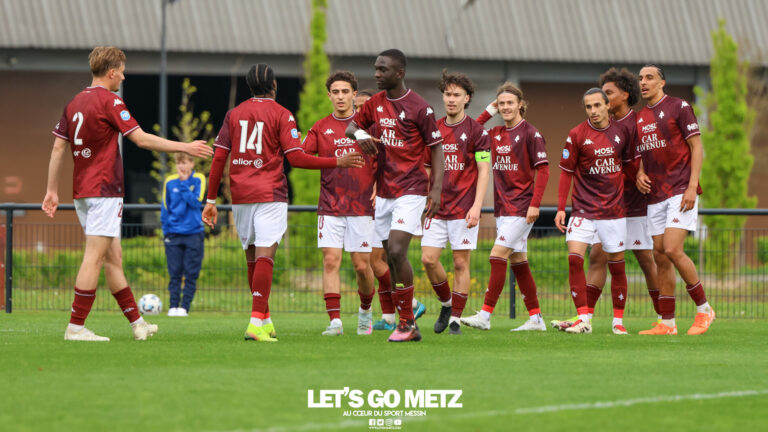 4,1K Les équipes de la formation messine étaient de nouveau sur les terrains ce week-end. Si les U19 ont confirmé leur bonne dynamique avec une nouvelle victoire, les U17 et la réserve ont connu des résultats plus compliqués. National 3 – Première défaite pour la réserve messine Après un nul la semaine passée à Saint-Quentin, la réserve du FC Metz se déplaçait sur la pelouse du Pays du Valois US. Les Grenats avaient pourtant bien entamé la rencontre avec une ouverture du score précoce signée Diego Duarte (0-1, 10′). Mais la réaction locale n’a pas tardé. En seconde période, Ahmed Rachid Bouzar a d’abord égalisé (1-1, 60′) avant de s’offrir un doublé vingt minutes plus tard (2-1, 78′). Avec ce revers, le FC Metz enchaîne un deuxième match sans victoire et reste dans une situation délicate : 13ᵉ et avant-dernier du groupe E de National 3. Les joueurs d’Abasse Ba tenteront de réagir le samedi 6 septembre à domicile face au Gazélec Ajaccio. Crédit Photo : Let’s Go Metz U19 – Une victoire spectaculaire face à Bobigny Après leur défaite inaugurale contre Clermont (0-1), les U19 recevaient le FC 93 Bobigny. Les Grenats ont rapidement pris les devants grâce à Xavier Bangengando Wata, auteur d’un doublé en l’espace de dix minutes (1-0, 24′ ; 2-0, 34′). Avant la pause, Jules Thouvenot a enfoncé le clou (3-0, 42′) en faveur des hommes de Stéphane Léoni. En fin de match, Bobigny a relancé le suspense : Arel Couriol a réduit l’écart (3-1, 88′), puis Yoro Digbeu a marqué dans la foulée (3-2, 90′). Malgré cette fin haletante, les Messins ont tenu bon et décrochent leur première victoire de la saison. Avec 3 points, ils se hissent à la 9ᵉ place du groupe B. Prochain rendez-vous : dimanche 7 septembre à 15h00 contre l’ASPTT Dijon. U17 – Défaite à Annecy Après leur succès en semaine à Auxerre (0-1), les U17 se déplaçaient sur la pelouse du FC Annecy. Les jeunes de Toifilou Maoulida ont été surpris dès l’entame par Arthur Vaz (1-0, 6′). Après l’exclusion d’Astor Kastel pour Metz, Vaz a doublé la mise en seconde période (2-0, 76′). Malgré une réduction du score signée Djibril Cappe (2-1, 80′), le FC Metz n’a pas réussi à revenir. Au classement, les U17 messins se maintiennent en 7ᵉ position avec 1 seule victoire donc depuis le début de saison. Ils retrouveront Metz le dimanche 7 septembre face au FC Sochaux-Montbéliard. Crédit photo : Julien Buret / Let’s Go Metz Image à la une : Stephan Weyrath / Let’s Go Metz