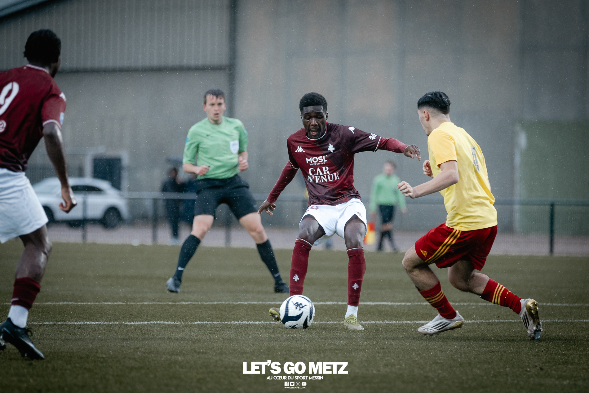 253 La jeunesse du FC Metz a obtenu des résultats globalement positifs ce week-end. Retrouvez sans plus tarder notre Récap’ formation. La réserve du FC Metz, qui a concédé un match nul (1-1) contre Drancy en National 3, n’était pas la seule équipe de la formation du club à la Croix de Lorraine sur le pont ce week-end. Les U19, les U17 et les U19 féminines ont joué et ont obtenu des résultats positifs. Retrouvez notre Récap’ formation. U19 – Le FC Metz serein à Saint-Priest La belle saison du FC Metz en championnat national U19 se poursuit. Les joueurs de Stéphane Léoni se sont imposés (0-2) sur le terrain de l’AS Saint-Priest. Mathis Holo avait ouvert la marque (0-1, 28′) avant que Jules Thouvenot ne double la mise (0-2, 45′). Les Grenats sont solidement accrochés à leur deuxième place au classement, derrière le Clermont Foot 63 et devant l’Olympique Lyonnais. U17 – Le FC Metz vainqueur à Thionville sans Toifilou Maoulida L’US Thionville Lusitanos progresse à tous les étages. Le derby mosellan du championnat national U17 a toutefois tourné en faveur du FC Metz. Sans leur entraîneur Toifilou Maoulida, victime d’un malaise la semaine dernière, les jeunes grenats sont allés gagner sur la pelouse thionvilloise. Un succès (2-4) grâce à des buts signés Jess Gomez Rodrigues (3′), Maykel Gomis (24′), Ange Elloh (68′) et Edouard Thibaut (90′). Le FC Metz est quatrième de son championnat. U19F – Le FC Metz tient tête au LOSC Les U19 féminines du FC Metz sont à la peine dans leur championnat et plutôt à la bagarre avec Valenciennes pour ne pas finir à la dernière place du classement. Contre Lille, les Messines ont décroché un point qui pourrait s’avérer précieux en fin d’exercice. Maëlle Bersweiler avait d’abord ouvert le score pour le FC Metz (1-0, 11′) avant que le LOSC ne parvienne à égaliser en infériorité numérique (1-1, 74′) puis à prendre la tête (1-2, 90′). Mais dans un temps additionnel fou, les Mosellanes refusaient la défaite et arrachaient le match nul grâce à Auryane Abdourahim (2-2, 90′). Le club à la Croix de Lorraine compte cinq points de retard sur le premier non relégable, Strasbourg. Crédit photo : Julien Buret / Let’s Go Metz (archives)
