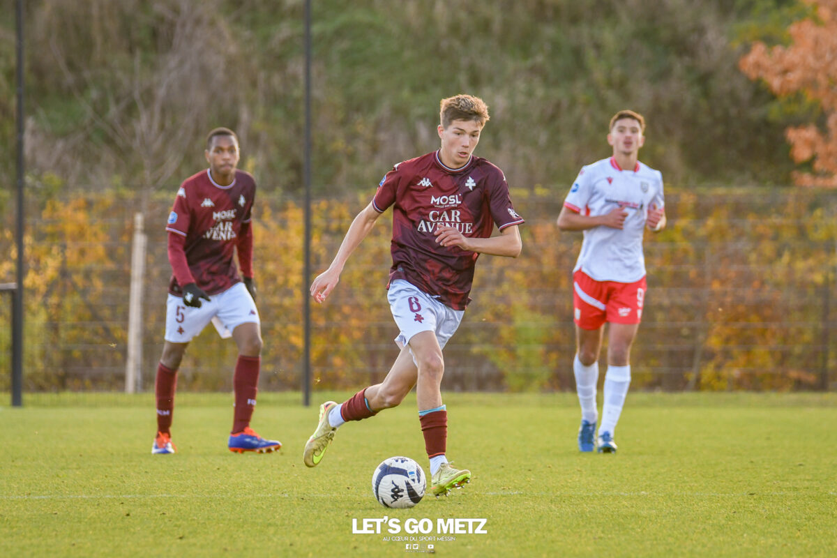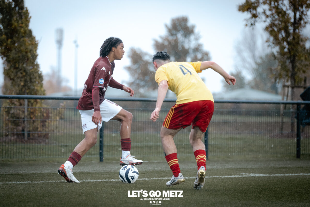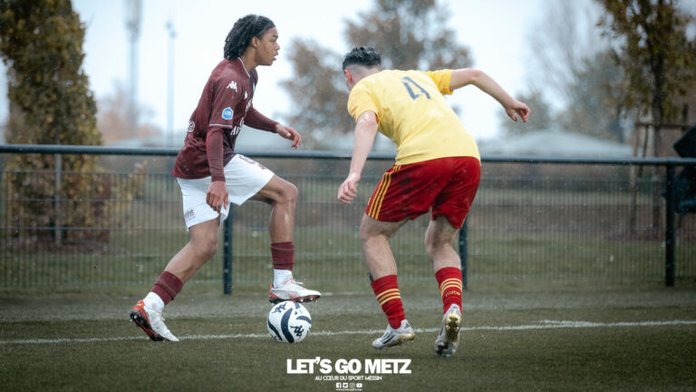 53 La formation du FC Metz a encore signé un week-end – presque – parfait. Si les U19 ont chuté face au leader, les U19F et U17 l’ont emporté haut la main. Cela faisait un petit moment que la formation messine ne s’était pas aussi bien portée. Les U19, U19F et U17 figurent tous sur le podium de leurs championnats respectifs. Des performances convaincantes qui laissent présager un bel avenir pour les jeunes formés au club. À noter également que tout va pour le mieux pour l’équipe réserve du FC Metz. Brian Madjo et les siens ont signé un large succès ce dimanche face à Neuilly-sur-Marne. U19 – Le FC Metz victime de l’ogre lyonnais Après leur victoire renversante face au Racing Club de Strasbourg, les Grenats se déplaçaient chez le leader l’Olympique Lyonnais ce samedi. Contre toute attente, les visiteurs prenaient l’avantage par l’intermédiaire d’Hamza Kadamani (0-1, 23′). L’espoir de ramener des points en Moselle était à son comble, mais l’ouverture du score était surement un peu trop rapide. Les Lyonnais réagissaient très tôt en réactivant la machine à but. Angel Garcia et Ajdin Muminovic faisaient trembler les filets coup sur coup (1-1, 26′ et 2-1, 27′). Un coup de massue pour les Messins qui ne parvenaient pas à revenir au score. Les Gones enfonçaient le clou peu avant le coup de sifflet final. Issiaga Soumah (3-1, 77′) et Kenan Doganay (4-1, 83′) effaçaient tout espoir de remontée messine. Un revers « logique » mais au gout amer pour le FC Metz qui menait dans la rencontre. Les U19 conservent tout de même leur 3ème place au classement et se déplaceront à Bobigny dimanche 30 novembre. Crédit photo : Julien Buret/LGM (archive) U19F – Le FC Metz déroule face à Fleury Qui pourra les arrêter ? Surement pas le FC Fleury 91. Les jeunes messines poursuivent sur leur belle lancée en déjouant les Parisiennes, et ce, avec la manière. Lola Falzone lançait rapidement les hostilités et donnait l’avantage aux Grenats (0-1, 6′). Entré en cours de jeu, Siga Konaté creusait l’écart (0-2, 69′) et Emma Lopez enfonçait le clou pour mener les siennes vers la victoire (0-3, 90′). Une rencontre en totale maîtrise, à l’image du début de saison du FC Metz. Ce succès 3 buts à 0 permet aux Messines de conforter leur deuxième place au classement et d’être toujours en course pour la phase Élite. Place désormais à une courte pause avant d’entamer le sprint final de cette première phase de championnat. Elles recevront le Dijon FC (3ème) dimanche 7 décembre. Une dernière rencontre décisive pour les Grenats qui espèrent accrocher une qualification historique pour la phase Élite. Crédit Photo : Julien Buret/Let’s Go Metz (archive) U17 – Les Grenats vainqueurs du FC Lyon Bien installé sur le podium après la victoire sans appel face à Strasbourg, le FC Metz répétait son numéro ce dimanche face au FC Lyon. Malgré l’exclusion précoce du Lyonnais Delshan Amayota (24′), les Messins ne profitaient pas de leur supériorité numérique pour regagner les vestiaires avec l’avantage. Il fallait attendre la 52ème minute pour voir la défense lyonnaise chavirer. Aymane Kanoute débloquait le compteur (1-0, 52′), puis Djibril Cappe alourdissait la sentence peu de temps après (2-0, 57′). Les Lyonnais faisaient douter le FC Metz en réduisant le score par l’intermédiaire de Nizar Khoudda (2-1, 71′). Malgré cette petite frayeur, les Grenats se rassuraient et scellaient le sort de la rencontre avant le coup de sifflet final. Maykel Gomis (3-1, 82′) et Djibril Cappe (4-1, 90′) anéantissaient tout espoir de « remontada » lyonnaise. Une victoire 4 buts à 1 qui permet au FC Metz de grimper sur la dernière marche du podium. Ils recevront le FC Annecy dimanche 30 novembre pour poursuivre leur belle série de 10 matchs sans défaite en championnat. La dernière était d’ailleurs contre les Annéciens le 31 août dernier. Crédit photo : Mikaël Franck/LGM (archive) Image à la une : Julien Buret/LGM (archive)