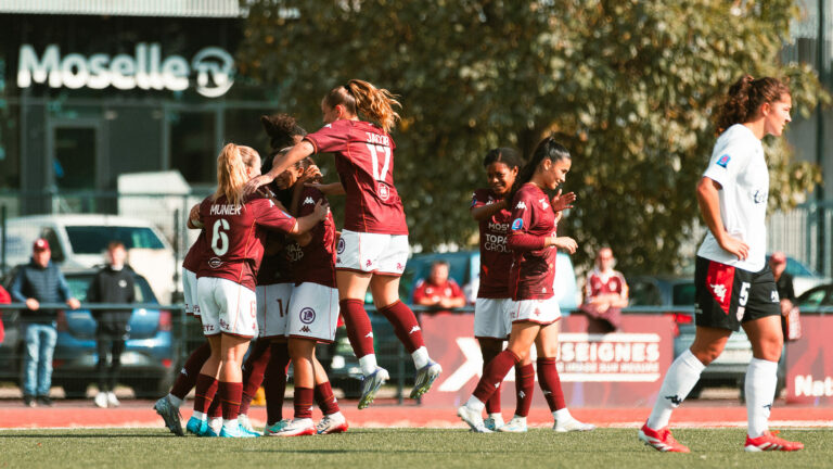 2,2K Les joueuses du FC Metz ont battu leurs homologues de Guingamp ce dimanche au stade Dezavelle. Les Messines s’installent ainsi dans le trio de tête. Du soleil, du monde en tribune, des buts et une victoire nette et sans bavure. Les joueuses du FC Metz ont montré l’exemple au stade Dezavelle ce dimanche après-midi face à l’En Avant Guingamp. Dominatrices pendant l’intégralité de la rencontre, les protégées de Marine Morel l’ont emporté 2-0 grâce à des buts de Léa Munier (SP) et Mikayla Dayes. Un match plein, dès les premières secondes de jeu et jusqu’au coup de sifflet final : les joueuses du club à la Croix de Lorraine n’ont pas été avares d’efforts et continuent sur leur belle lancée. La coach du FC Metz pouvait savourer au coup de sifflet final, ses joueuses enchaînent un troisième succès de suite – deux en championnat et un coupe de la Ligue – et peuvent désormais jouer les premiers rôles au classement : « On est très satisfaites, les filles ont fait un match sérieux. Il y a eu des bonnes choses, beaucoup d’occasions et surtout on n’a pas pris de buts, ça fait du bien. Aujourd’hui il y a eu la manière, sur deux mi-temps ». Avec un soupçon de réussite et une pointe d’efficacité supplémentaire, le score aurait pu être bien plus large, tant les Messines ont maîtrisé leur partition. Léa Munier : « On a mis les ingrédients » Si en première mi-temps, les Grenats ont manqué beaucoup d’occasions de buts, Léa Munier a su délivrer ses partenaires en transformant le penalty habilement trouvé par Luisa Oliveira juste avant la pause. La capitaine grenat et ses partenaires voulaient prouver à leur public qu’elles en avaient sous les crampons malgré le faux départ face à Nice : « Après la première défaite, on avait à cœur de reprendre les éléments qui n’avaient pas fonctionné. On a mis les ingrédients dans la recette et ça a pris. J’espère qu’on va continuer sur cette lancée. On est parties du mauvais pied contre Nice, donc maintenant on veut garder que le positif et continuer ». Même constat pour la coach du FC Metz, qui semble enfin savourer les fruits du travail. « Le groupe progresse et confirme depuis trois rencontres. On avance avec prudence de match en match car on sait qu’il y a encore beaucoup de travail. Quand on voit les résultats chaque weekend, ce championnat est surprenant. À nous de faire le taf jusqu’au bout ». Avec cette place dans le trio de tête, les perspectives peuvent être séduisantes. Mais attention aux excès de confiance. La route est encore longue. Marine Morel et la gestion de groupe Plusieurs titulaires n’étaient pas alignées ce dimanche après-midi. Certaines patientaient sur le banc tandis que d’autres regardaient leurs coéquipières depuis la tribune. Entre retours de blessures, sélections avec les U19 et choix du coach, cette victoire face à Guingamp a prouvé une nouvelle fois que toutes les joueuses étaient concernées et potentiellement sélectionnables. Une gestion du groupe que Marine Morel semble, pour le moment, maîtriser à la perfection : « Chaque weekend j’ai peut-être un groupe différent, un onze différent, mais chaque semaine, les filles donnent le meilleur d’elles-mêmes. On a besoin de tout le monde et peu importe l’effectif qui joue, j’ai une confiance totale en mon groupe ». Il faut dire que le rythme effréné des rencontres, depuis le début de saison, donne raison à Marine Morel. L’arrivée de la Coupe de la Ligue Féminine a resserré le calendrier et les joueuses enchaînent les matchs. L’écart le plus court entre deux journées de championnat était en moyenne de deux semaines les saisons précédentes. Pouvoir compter sur un groupe élargi de qualité, est donc un luxe que le FC Metz semble pouvoir s’offrir cette saison. Avec cette nouvelle victoire, les Grenats se hissent provisoirement à la deuxième place au classement. Le déplacement à Lille la semaine prochaine s’annonce d’ores et déjà savoureux. FC Metz : Genty, Jacob, Petitjean, Rageot (Bouktit 87′), D’abadie, Munier (C), Duporge, Oliveira Bras (Fodil 74′), Feddaoui (Lambert 74′), Dayes, Ribeyra (Mbengue 82′)EA Guingamp : Renard (Arthur 70′), Donnary, Imarazene (Boulanger 70′), Daoudi, Peniguel, Petit Frère (Lescop 46′), Autin, Even Saliou (Aggoune 58′), Martin, Avenant, Sieber Crédit photo : Julien Buret/Let’s Go Metz