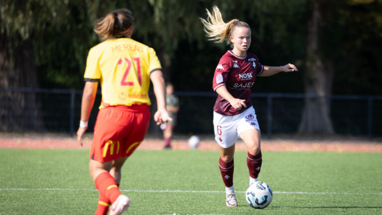 2,2K Les joueuses du FC Metz n’ont pu faire mieux que match nul 0-0 face au RC Lens. Un bon point de pris malgré tout face à un des favoris du championnat. Elles auront poussé jusqu’au bout… Les féminines du FC Metz et du RC Lens se partagent les points à l’issue de cette première journée de Seconde Ligue. Outrageusement dominatrices pendant la quasi totalité de la rencontre, les protégées de Marine Morel ont manqué de précision dans les derniers gestes et près de la surface de réparation et doivent se contenter d’un match nul 0-0 face à des Sang et Or agressives et bien en place défensivement. Il n’a pas manqué grand chose Devant un public venu en nombre – et sous le regard attentif du président Pierre Gillet et de Stéphane Le Mignan – les Grenats ont offert un football presque total. Il n’aura manqué que des buts pour enflammer Dezavelle. Et pourtant, les joueuses du club à la Croix de Lorraine ont multiplié les assauts et ont privé les Lensoises de ballon pendant un grosse partie de la rencontre. Si les Sang et Or se montraient agressives et conquérantes dans le premier quart d’heure, les protégées de Marine Morel mettaient ensuite le pied sur le ballon jusqu’à la fin de la rencontre, ne laissant au Nordistes que de rares possibilités de contres. S’il a été difficile dans le premier acte de trouver des intervalles face à un bloc très regroupé des Lensoises, Seynabou Mbengue manquait de peu d’ouvrir son compteur personnel, mais son lobe astucieux passait juste à côté du poteau de Blandine Joly. La gardienne sang et or s’illustrait à nouveau quelques minutes plus tard sur une frappe de trente mètres de Justine Rougemont. Les attaques messines allaient subir le même sort à maintes reprises en seconde période malgré de belles combinaisons grenat. Tour à tour, Amélie Joseph, Léa Munier, Lina Thivillon puis Inès Boutaleb en fin de match, manquaient de précision devant les cages lensoises et se frottaient à une gardienne sang et or irréprochable. Les Nordistes réagissaient par contre-attaques et donnaient quelques frayeurs au public grenat. Mais les Messines peuvent également se targuer d’avoir une grande gardienne. Julie Genty se montrait décisive à deux reprises, et sauvait les siennes du hold-up. Les deux équipes se séparaient sur un score vierge mais avec la satisfaction d’avoir tout donner jusqu’à la dernière seconde. Ce qu’il faut retenir On a vu de belles choses ce dimanche après-midi à Dezavelle. Des circuits de passes inédits, une belle fluidité dans les déplacements, et une solidité retrouvée après une saison difficile l’an passé. La charnière Maud Antoine – Clara Moreira n’a pas laissé beaucoup de possibilités aux attaquantes lensoises. Sur les côtés de la défense, Anaïs Lambert et Leina Feddaoui ont multiplié les appels en profondeur et les centres. Au milieu de terrain, Luisa Oliveira Bras et Justine Rougemont ont eu des difficultés en première mi-temps pour casser les lignes, mais se sont bien reprises dans le deuxième acte. Quant à l’attaque, avec un peu plus de réussite et d’audace, elle devrait rapidement faire trembler les filets adverses. Un nul encourageant pour démarrer la saison. Les réactions de Marine Morel et Julie Genty Prochain rendez-vous pour les grenats, dimanche prochain à Nice pour un déplacement qui s’annonce périlleux. Interviews et montage : Gérald Russello – Let’s Go MetzCrédit photo et vidéo : Julien Buret – Let’s Go Metz