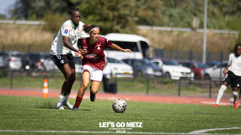 2,4K Les joueuses du FC Metz recevaient leurs homologues de l’OGC Nice en match d’ouverture de cette nouvelle saison de Seconde Ligue. Les Messines ont loupé leur entrée en lice et s’inclinent 2 buts à 1. Les Messines ont loupé leur entrée en lice dans cette nouvelle saison de Seconde Ligue. Les joueuses du FC Metz retrouvaient la compétition ce dimanche devant le public du Stade Dezavelle, face à une équipe de l’OGC Nice solide et tactiquement en place. Les protégées de Marine Morel ont fait pâle figure et se sont inclinées 2 buts à 1. La coach Grenat, visiblement agacée par la prestation de ses joueuses, n’a pas tardé à réagir : « Aujourd’hui j’avais seize joueuses retenues et dix en tribunes. Les choix je les ferai, mais en attendant aujourd’hui, on a manqué de professionnalisme ». Le ton est donné. Dans le premier acte, le spectacle offert par les deux équipes fût d’une pauvreté abyssale. Les Niçoises avaient décidé de jouer très haut et de bloquer toute velléité d’attaque placée des joueuses grenat, souvent prises au piège du hors-jeu. Résultat, un football soporifique et aucune action franche à se mettre sous la dent. « En première période, on montre un triste visage. À la pause fraîcheur et à la mi-temps on s’est dit les choses, ce n’était pas l’équipe que l’on avait vu lors de la préparation. On n’a pas été au rendez-vous. C’était mieux en deuxième mi-temps mais ça ne suffit pas », analysait Marine Morel à l’issue de la rencontre. Un défaite méritée malgré un sursaut en fin de match Au retour des vestiaires, les joueuses du club à la Croix de Lorraine sont revenues avec de meilleures intentions, mais la ligne défensive niçoise, toujours aussi disciplinée, s’est montrée quasiment infranchissable. Les Messines ont pourtant donné quelques sueurs froides aux Sudistes, comme sur cette sortie coupable de Maureen Saint-Léger (80′). La gardienne niçoise touchait involontairement le ballon avec la main en dehors de sa surface mais l’arbitre, mal placée, ne sifflait pas. Sur un corner concédé quelques instants plus tard, l’ancienne messine Yakaré Niakaté ouvrait la marque et climatisait le stade Dezavelle (82′). Sonnées, les Grenats encaissaient dans la foulée un second but par Léa Cassagne (88′). Abattues, mais pas totalement résignées, les protégées de Marine Morel réduisaient malgré tout la marque dans les arrêts de jeu par l’intermédiaire de Luisa Oliveira Bras, mais c’était trop tard. « Aujourd’hui, ce n’était pas Nice notre adversaire, c’était nous même. On n’a pas été au rendez-vous sur la plan technique, sur la maîtrise et dans l’engagement », constatait la coach du FC Metz. Prochain rendez-vous pour les Messines en Seconde Ligue, dans deux semaines, sur la pelouse de Rodez. Mais avant cela, les Grenats auront une parenthèse en coupe de la ligue à Algrange, le 13/09 face à Auxerre. Nul doute que d’ici là, des changements devront être apportés, tant sur le plan tactique que technique, pour ne pas démarrer la saison dans le rouge, à l’instar de leurs homologues masculins. Crédit photos : Julien Buret/Let’s Go Metz