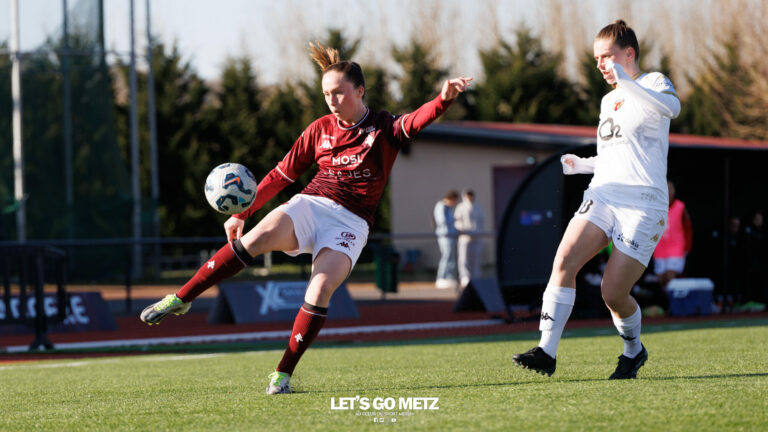 1,4K Les joueuses du FC Metz n’ont pu faire mieux que match nul 1-1 face à Le Mans. Un bon point pris mais quelques regrets. Au terme d’un match qui ne restera pas dans les annales, le FC Metz a pris un point face à Le Mans, équipe du haut de tableau de Seconde Ligue. Résultat final : 1-1 et des regrets côté grenat. Les protégées de Marine Morel auraient pu s’en tirer à meilleur compte mais ont manqué de concentration après l’ouverture du score en seconde période. « Les filles sont très déçues car il y avait la place, notamment sur la seconde mi-temps où on a montré un autre visage », comme le confirme la coach messine. Pour autant, compte tenu de la physionomie du match, ce point pris reste une belle performance. « Dans notre course au maintien, on tenait à rester invaincues à domicile. Cela reste un bon point contre le deuxième du championnat et surtout compte tenu des résultats du weekend. On sait que sur la deuxième moitié de saison, tous les matchs vont être compliqués », admettait l’ancienne capitaine grenat à l’issue de la rencontre. Une somme de détails La première période fût d’une rare médiocrité, tant sur le plan technique que dans les intentions. Le Mans, pourtant dauphin de Lens au coup d’envoi, n’offrait qu’une résistance toute relative à une équipe de Metz qui semblait avoir perdu son football. Seule Melissa Bethi, bien trop isolée au milieu de terrain, tentait d’enflammer la partie. « En première mi-temps, on était un peu timorées sur notre 3-5-2, on a manqué de surnombre sur les côtés et de poids offensif, donc on a changé de système en basculant en 4-3-3 ». Pari gagnant pour Marine Morel puisque ses joueuses revenaient après la pause avec de bien meilleures intentions. En témoigne, ce lobe plein d’audace d’Anaïs Lambert qui finissait dans les filets des Mancelles et qui venait récompenser le travail de sape de la latérale gauche (63′). Malheureusement pour les Messines et seulement cinq minutes plus tard, Le Mans revenait dans la partie sur une mauvaise appréciation de Julie Genty qui profitait à Emilie Giffaut (68′). Une égalisation loin d’être volée pour les Mancelles qui poussaient jusqu’à la fin de la rencontre et s’exposaient aux contre-attaques messines. Mais le score n’évoluait plus et les deux équipes se quittaient en bons termes. Dommage pour les joueuses du club à la Croix de Lorraine qui ont une nouvelle fois manqué de justesse et de volonté dans le dernier geste. « Sans doute que nous n’avons pas été assez efficaces, techniquement c’était compliqué. Sincèrement, c’est une déception pour nous car il y avait la place pour prendre les trois points », concédait Seynabou Mbengue au micro de Let’s Go Metz. L’avant-centre grenat, consciente que son équipe aurait pu mieux faire face à une équipe de haut de tableau : « Il n’y a pas de très grandes différences entre les équipes, cela se joue parfois sur un manque de concentration ». Le verre à moitié plein pour Esther Ngambu Ngianbi Abstraction faite d’une première mi-temps famélique en termes de jeu, Esther Ngambu Ngiangi préfère retenir le positif après ce match nul : « Face à une équipe deuxième du championnat, on s’est plutôt bien débrouillées. On a tenu défensivement malgré ce but égalisateur. Dans le jeu, il y a eu de bonnes choses, on a eu des occasions. On a su accrocher une équipe de haut de tableau, de ce point de vue là, on a fait le job ». La native de Courcouronnes, arrivée au FC Metz à l’intersaison pour pallier la longue absence de Clara Moreira, fait déjà office de pilier de la défense messine. Une adaptation qui s’est faite très rapidement pour cette jeune joueuse (19 ans). « À Metz, je me sens bien, j’ai trouvée mes repères. Le club et le staff m’ont très bien accueillie. J’ai dû m’adapter rapidement, mais ça s’est bien passé, je suis contente », confesse Esther Ngambu Ngiangi. Au terme de cette treizième journée, le FC Metz reste solidement accroché à sa huitième place. Le prochain rendez-vous des Grenats sera sans doute très délicat puisque les Messines se déplacent à Toulouse, autre équipe en forme qui vient de battre Nice 2-0 sur sa pelouse. FC Metz : Genty, Lambert, Ngambu Ngiangi, Petitjean, Antoine, Munier, Thivillon, Bethi, Rougemont, Mbengue, BoutalebLe Mans : Roger, Giffaut, Salomon, Gasnier, Palene, Henry, Leveau, Oger, Bourdoiseau, Dumas, Boizid Crédit photos : Nicolas Martino