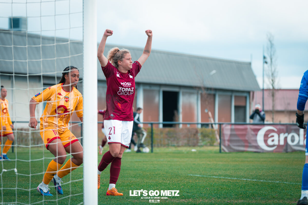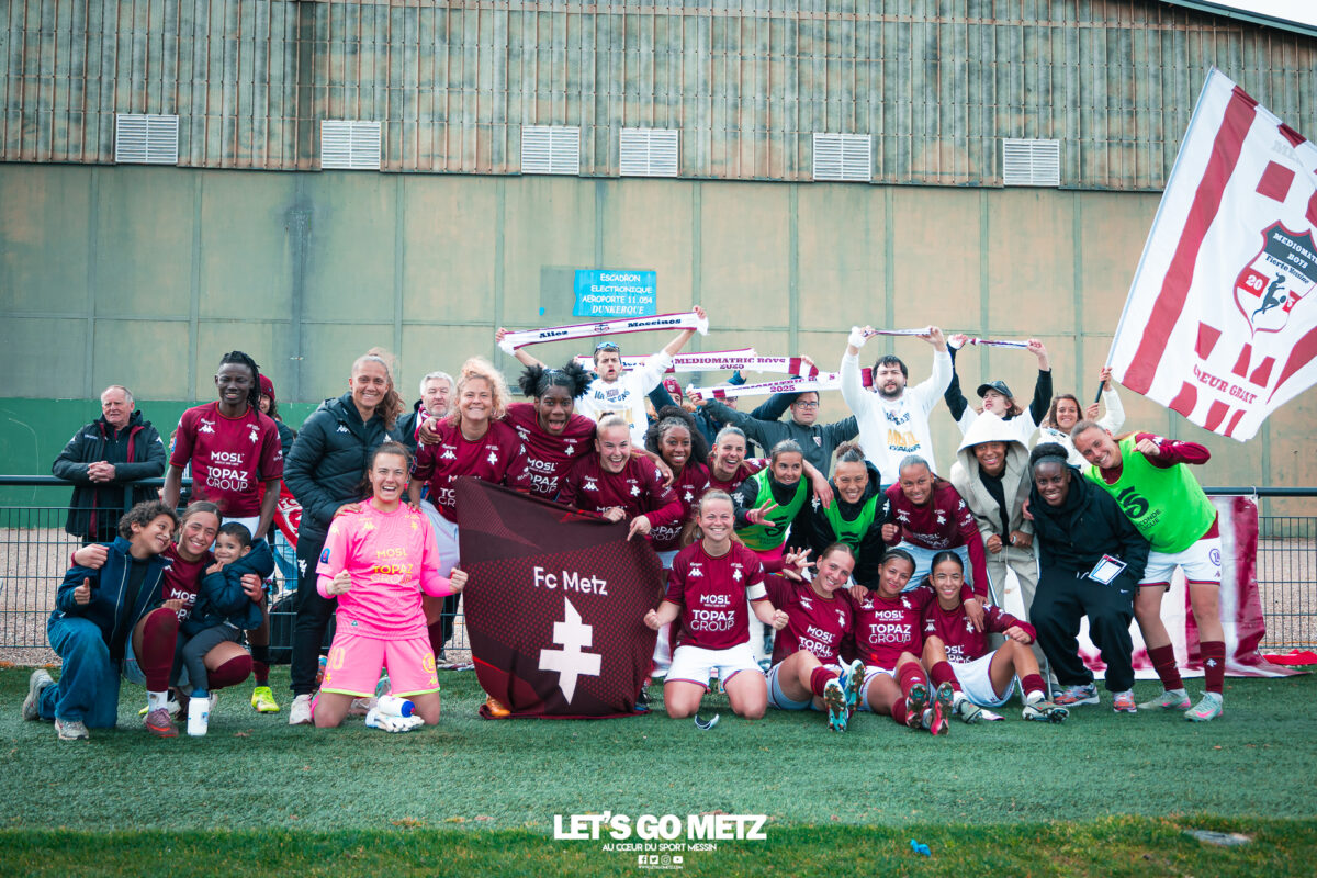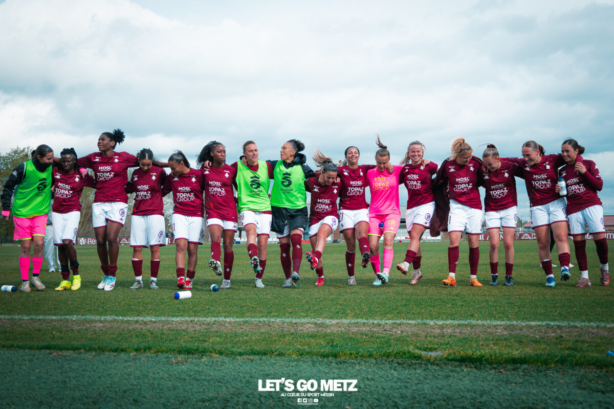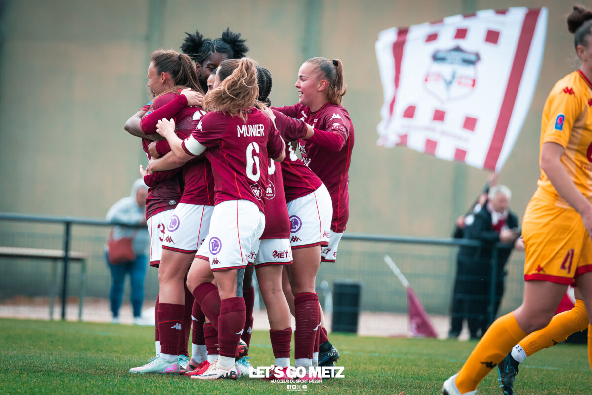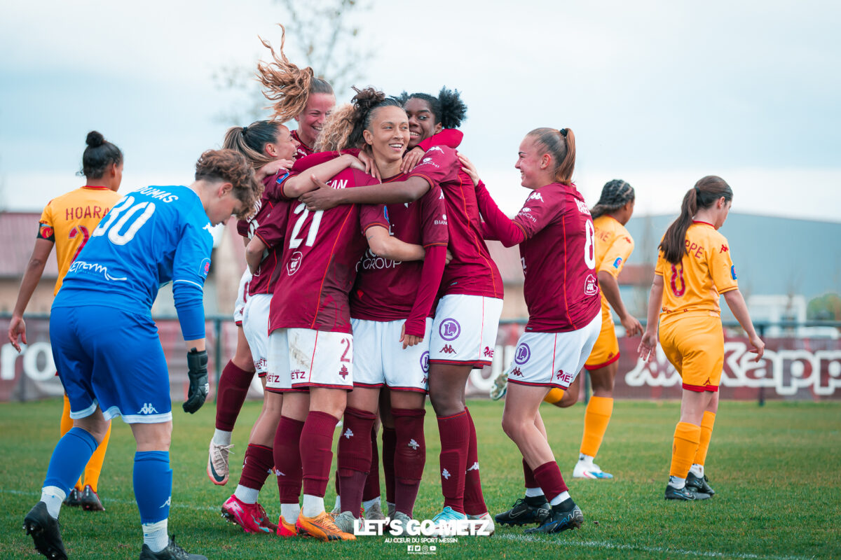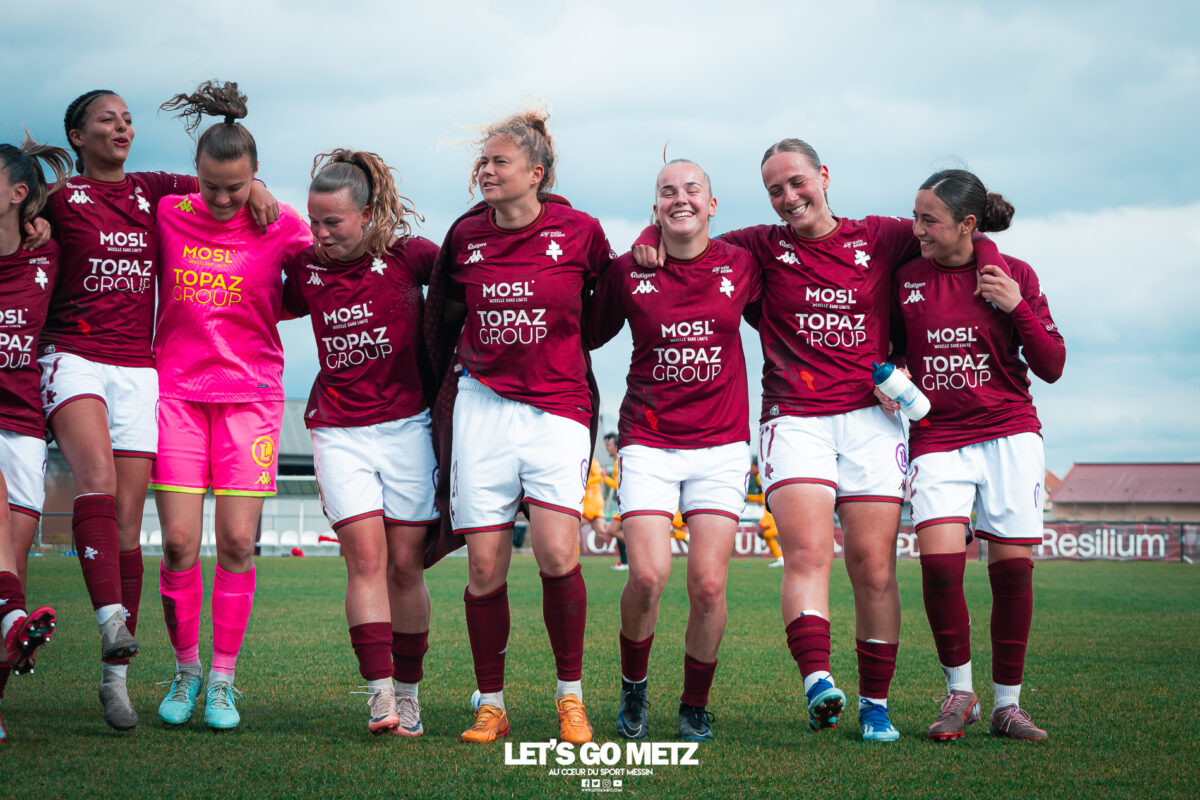 75 Le FC Metz s’est imposé 3 buts à 0 face au Mans FC ce dimanche à Frescaty. Les Messines ont enfin sorti la tête de l’eau en mettant fin à une longue spirale négative. La course au maintien en Seconde Ligue est plus que jamais lancée. Les Messines retrouvent enfin la saveur de la victoire ! Le FC Metz (11ème) a reçu Le Mans FC (4ème) ce dimanche pour la dix-huitième journée de Seconde Ligue. Une rencontre ô combien importante pour la coach Marine Morel et ses joueuses, en quête de points. Alors que la sonnette d’alarme a été tirée, il y a quelques jours, après la chute du club dans la zone de relégation, les Mosellanes n’avaient pas d’autres choix que d’obtenir un résultat contre Le Mans FC. D’autant plus que Rodez, juste devant au classement, aurait pu creuser l’écart avec sa victoire à Guingamp (1-2). Une belle entame de match Ce dimanche, c’est grâce à une surprenante équipe de Metz que les féminines se sont extirpées du piège de cette dix-huitième journée. Elles ont parfaitement réussi leur entame de match en montrant un tout autre visage. Anais Ribeyra a ouvert la voie à ses coéquipières en inscrivant le premier but de la rencontre (1-0, 25′). Puis Metz s’est servi de son temps fort pour alourdir le score. Sur corner, Maria Fodil a profité d’un dégagement hasardeux des visiteuses pour armer une reprise de volée qui a laissé de marbre la portière mancelle (2-0, 29′). Un ouf de soulagement pour les Messines qui ont explosé de joie après ce deuxième but. Le Mans FC n’est pas parvenu à réduire l’écart avant la pause laissant le FC Metz rentrer au vestiaire avec deux longueurs d’avance. De retour pour la seconde période avec le plein de confiance, les Messines n’ont pas voulu en rester là. À nouveau sur corner, Maud Antoine a tiré profit d’un énième cafouillage défensif des Mancelles pour prendre l’avantage dans les airs et adresser un ballon à Clara Petitjean qui, de la tête, a inscrit le troisième but messin (3-0, 50′). En moins d’une heure, le FC Metz a plié le match, ne laissant aucun espoir aux Mancelles. Les joueuses de Marine Morel ont parfaitement géré la fin de rencontre en maintenant la cage inviolée. Une équipe joyeuse et des supporters heureux après cette belle victoire face au Mans FCCrédit photo : Julien Buret / Let’s Go Metz Une victoire qui doit en appeler d’autres Un succès 3 buts à 0 pour les Messines qui mettent fin à une longue spirale négative. Elles n’avaient plus gagné en championnat depuis le 7 décembre dernier, et c’était déjà contre la même équipe du Mans FC (1-2). Un adversaire qui sourit au FC Metz cette saison. Malgré cette victoire, les Mosellanes ne sortent toujours pas de la zone rouge à cause du résultat de Rodez. Deux petits points séparent désormais les deux clubs, la course au maintien s’annonce excitante. Il reste quatre journées, quatre finales au FC Metz pour arracher le maintien en Seconde Ligue. Elles débuteront par un déplacement au Stade de Reims le samedi 25 avril prochain. Reste à savoir si ce succès à domicile permettra aux Messines de relever la tête et d’enchaîner une deuxième victoire de suite. FC Metz 3 – 0 Le Mans FC Mi-temps : 2-0Buts pour Metz : Ribeyra (25′), Fodil (29′), Petitjean (50′)Composition du FC Metz : Lebrun, Antoine (Mbengue, 81′), Petitjean (Jacob, 70′), Rageot, Ngambu Ngiangi, Thivillon, Munier (c), Fodil, Ben Khaled (Djebli, 88′), Ribeyra (Dayes, 70′), BouktitComposition du Mans FC : Dumas, Roger (Palene, 62′), Philippe, Ibrahim (Favennec, 62′), Chabourine (Huet, 71′), Hoarau, Bekhti (Galode, 62′), Dechilly, Faity, Bourdoiseau, Chapelle Crédit photos : Julien Buret / Let’s Go Metz