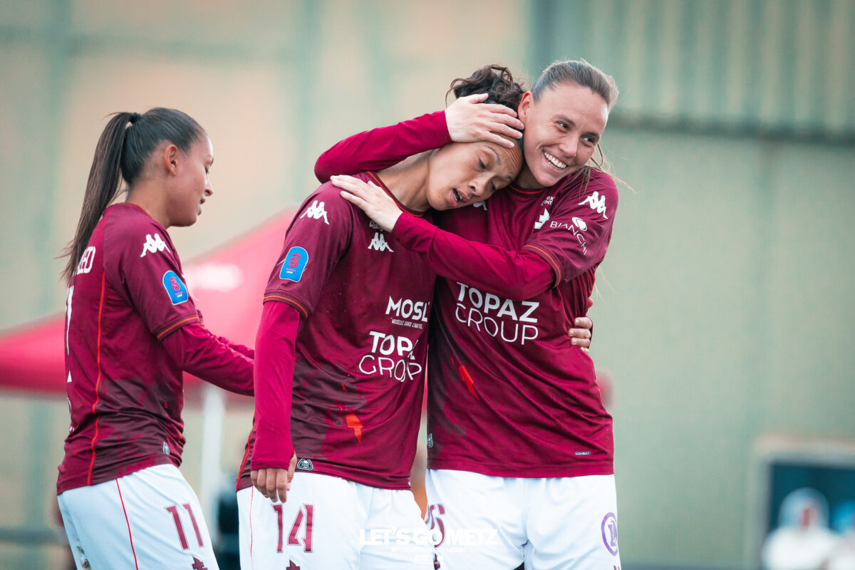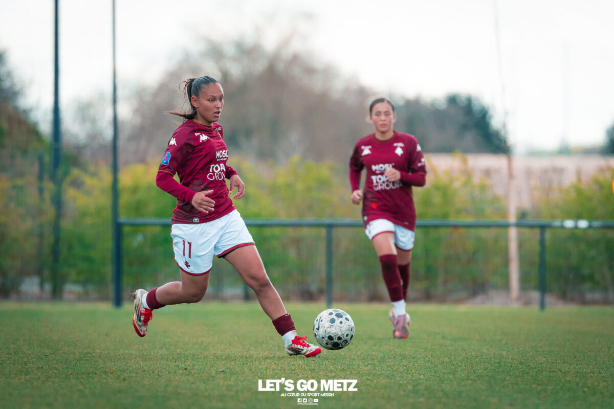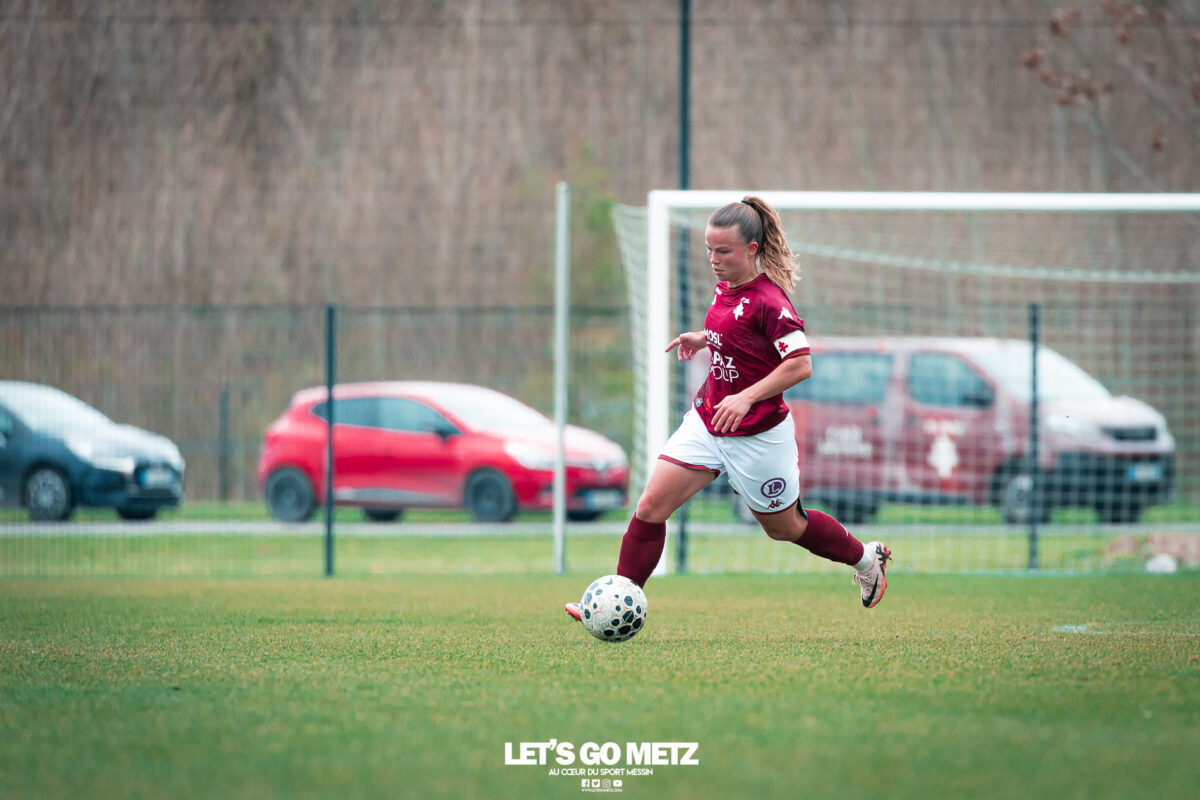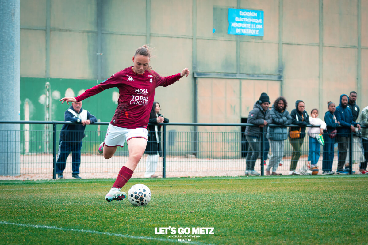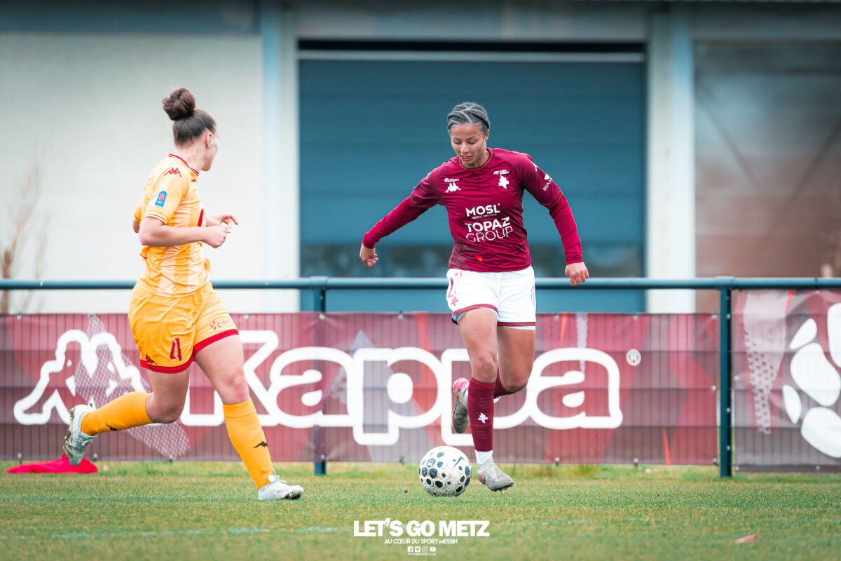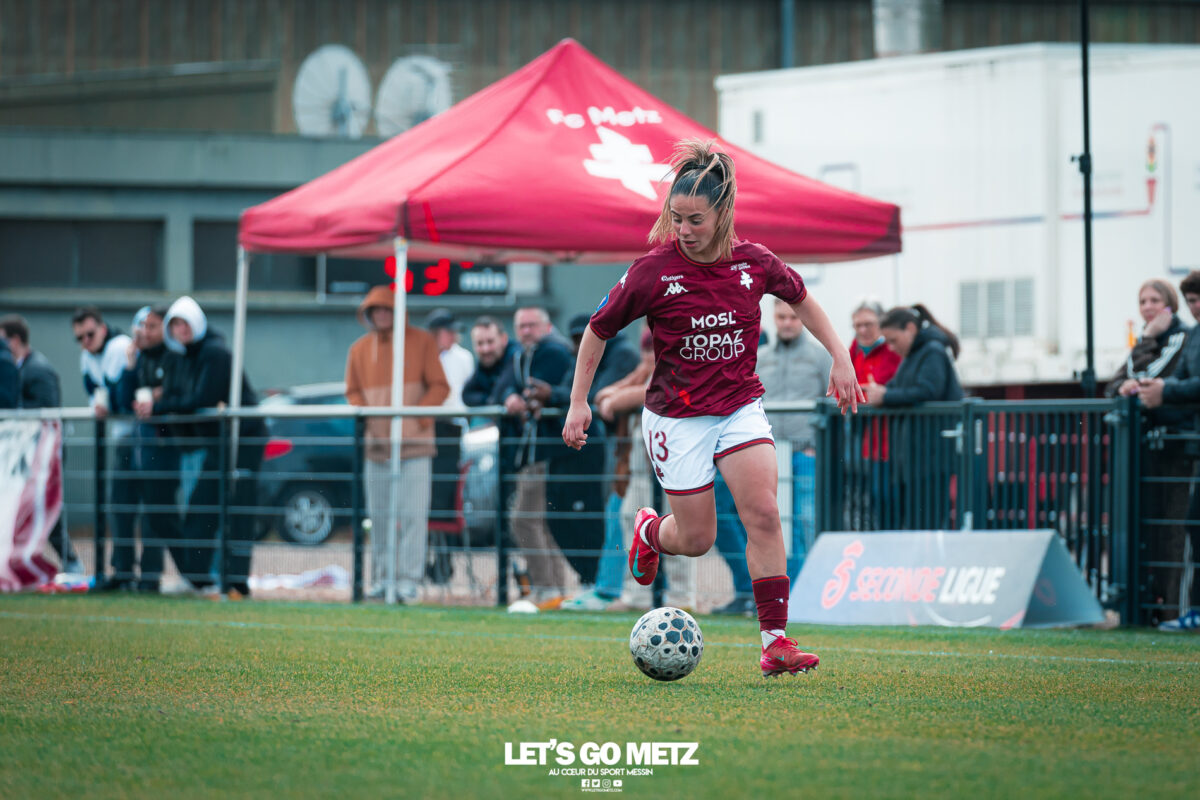 75 Le FC Metz s’est imposé 3 buts à 0 face au Mans FC ce dimanche à Frescaty. Les Messines ont enfin sorti la tête de l’eau en mettant fin à une longue spirale négative. La course au maintien en Seconde Ligue est plus que jamais lancée. Les Messines retrouvent enfin la saveur de la victoire ! Le FC Metz (11ème) a reçu Le Mans FC (4ème) ce dimanche pour la dix-huitième journée de Seconde Ligue. Une rencontre ô combien importante pour la coach Marine Morel et ses joueuses, en quête de points. Alors que la sonnette d’alarme a été tirée, il y a quelques jours, après la chute du club dans la zone de relégation, les Mosellanes n’avaient pas d’autres choix que d’obtenir un résultat contre Le Mans FC. D’autant plus que Rodez, juste devant au classement, aurait pu creuser l’écart avec sa victoire à Guingamp (1-2). Une belle entame de match Ce dimanche, c’est grâce à une surprenante équipe de Metz que les féminines se sont extirpées du piège de cette dix-huitième journée. Elles ont parfaitement réussi leur entame de match en montrant un tout autre visage. Anais Ribeyra a ouvert la voie à ses coéquipières en inscrivant le premier but de la rencontre (1-0, 25′). Puis Metz s’est servi de son temps fort pour alourdir le score. Sur corner, Maria Fodil a profité d’un dégagement hasardeux des visiteuses pour armer une reprise de volée qui a laissé de marbre la portière mancelle (2-0, 29′). Un ouf de soulagement pour les Messines qui ont explosé de joie après ce deuxième but. Le Mans FC n’est pas parvenu à réduire l’écart avant la pause laissant le FC Metz rentrer au vestiaire avec deux longueurs d’avance. De retour pour la seconde période avec le plein de confiance, les Messines n’ont pas voulu en rester là. À nouveau sur corner, Maud Antoine a tiré profit d’un énième cafouillage défensif des Mancelles pour prendre l’avantage dans les airs et adresser un ballon à Clara Petitjean qui, de la tête, a inscrit le troisième but messin (3-0, 50′). En moins d’une heure, le FC Metz a plié le match, ne laissant aucun espoir aux Mancelles. Les joueuses de Marine Morel ont parfaitement géré la fin de rencontre en maintenant la cage inviolée. Une équipe joyeuse et des supporters heureux après cette belle victoire face au Mans FCCrédit photo : Julien Buret / Let’s Go Metz Une victoire qui doit en appeler d’autres Un succès 3 buts à 0 pour les Messines qui mettent fin à une longue spirale négative. Elles n’avaient plus gagné en championnat depuis le 7 décembre dernier, et c’était déjà contre la même équipe du Mans FC (1-2). Un adversaire qui sourit au FC Metz cette saison. Malgré cette victoire, les Mosellanes ne sortent toujours pas de la zone rouge à cause du résultat de Rodez. Deux petits points séparent désormais les deux clubs, la course au maintien s’annonce excitante. Il reste quatre journées, quatre finales au FC Metz pour arracher le maintien en Seconde Ligue. Elles débuteront par un déplacement au Stade de Reims le samedi 25 avril prochain. Reste à savoir si ce succès à domicile permettra aux Messines de relever la tête et d’enchaîner une deuxième victoire de suite. FC Metz 3 – 0 Le Mans FC Mi-temps : 2-0Buts pour Metz : Ribeyra (25′), Fodil (29′), Petitjean (50′)Composition du FC Metz : Lebrun, Antoine (Mbengue, 81′), Petitjean (Jacob, 70′), Rageot, Ngambu Ngiangi, Thivillon, Munier (c), Fodil, Ben Khaled (Djebli, 88′), Ribeyra (Dayes, 70′), BouktitComposition du Mans FC : Dumas, Roger (Palene, 62′), Philippe, Ibrahim (Favennec, 62′), Chabourine (Huet, 71′), Hoarau, Bekhti (Galode, 62′), Dechilly, Faity, Bourdoiseau, Chapelle Crédit photos : Julien Buret / Let’s Go Metz